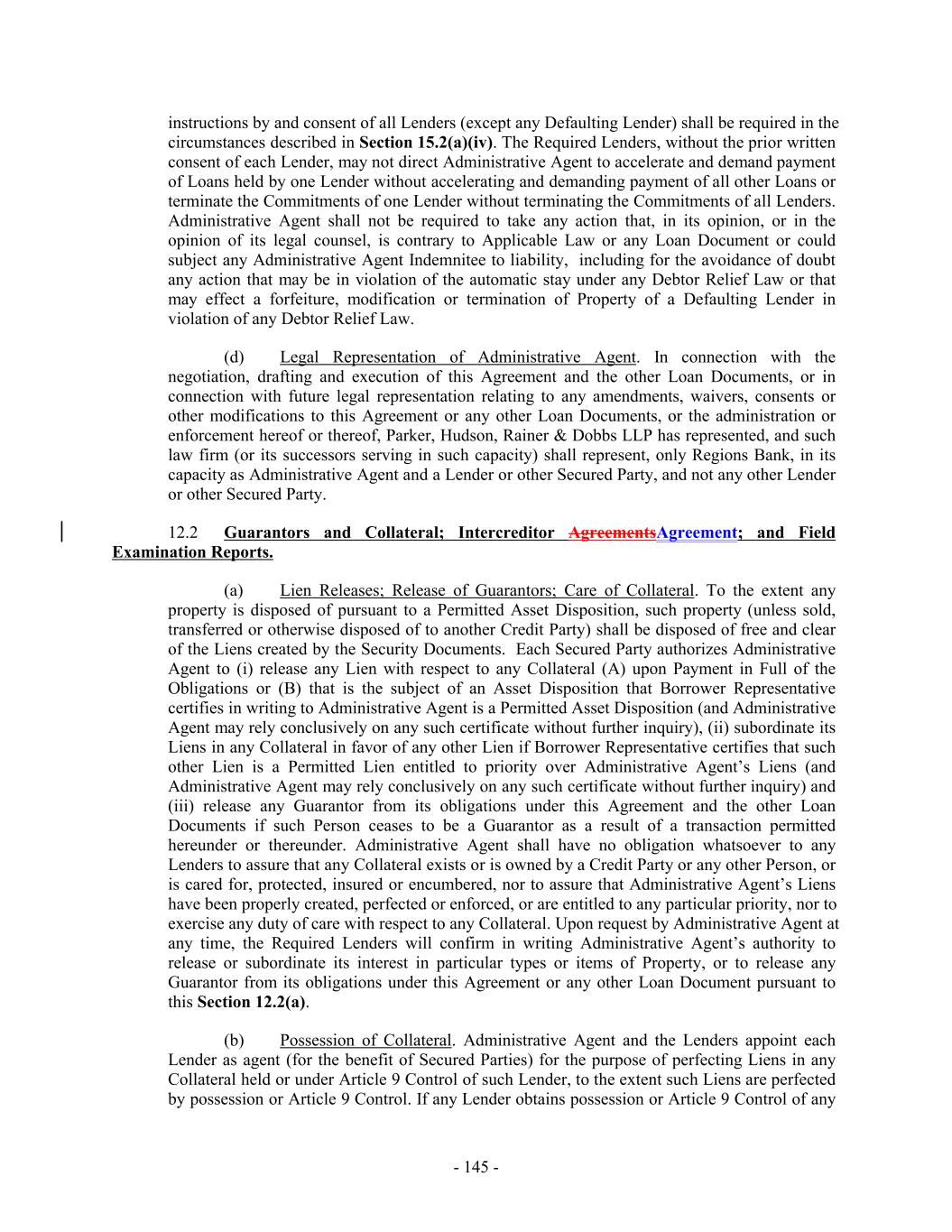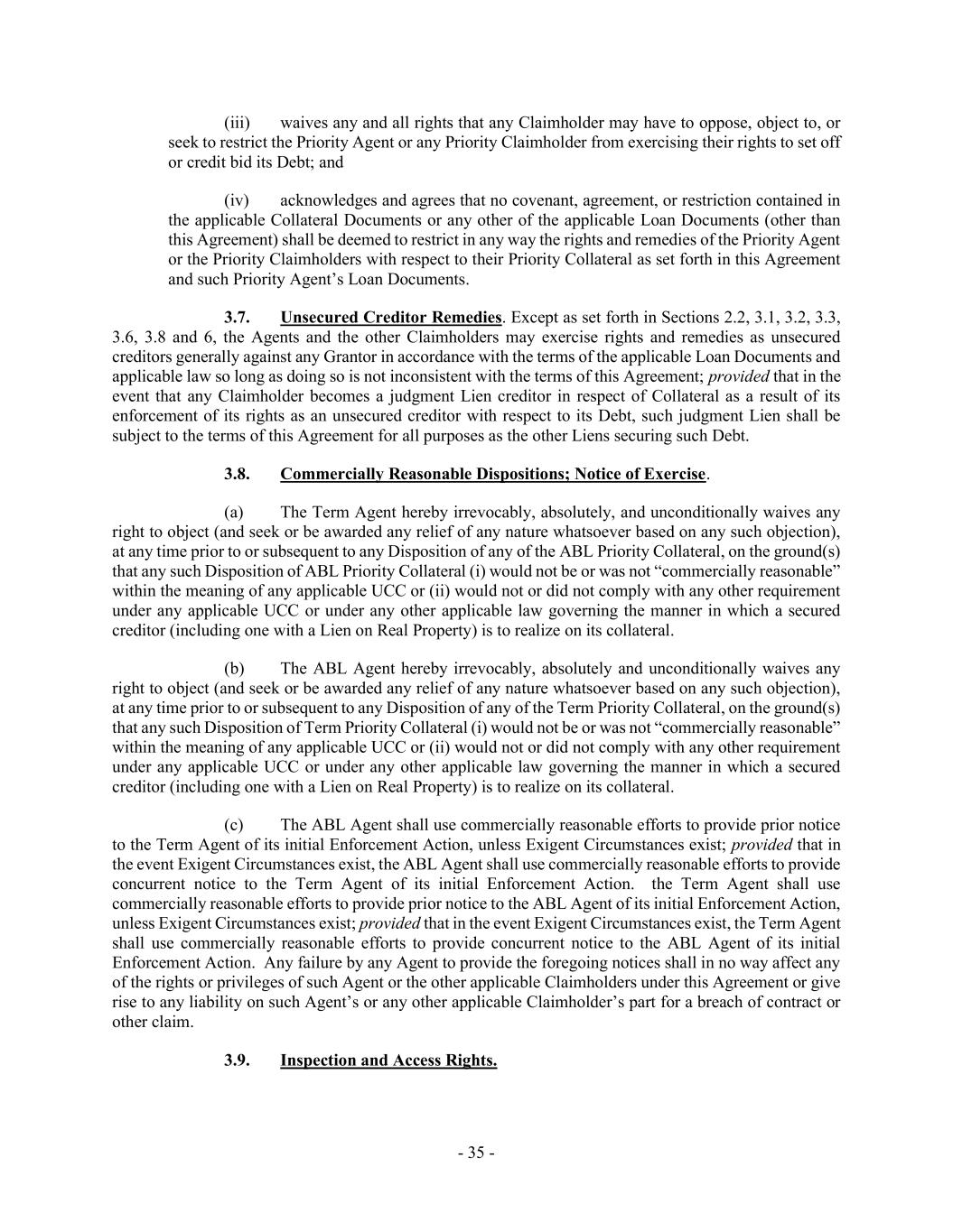 - 35 - (iii) waives any and all rights that any Claimholder may have to oppose, object to, or seek to restrict the Priority Agent or any Priority Claimholder from exercising their rights to set off or credit bid its Debt; and (iv) acknowledges and agrees that no covenant, agreement, or restriction contained in the applicable Collateral Documents or any other of the applicable Loan Documents (other than this Agreement) shall be deemed to restrict in any way the rights and remedies of the Priority Agent or the Priority Claimholders with respect to their Priority Collateral as set forth in this Agreement and such Priority Agent’s Loan Documents. 3.7. Unsecured Creditor Remedies. Except as set forth in Sections 2.2, 3.1, 3.2, 3.3, 3.6, 3.8 and 6, the Agents and the other Claimholders may exercise rights and remedies as unsecured creditors generally against any Grantor in accordance with the terms of the applicable Loan Documents and applicable law so long as doing so is not inconsistent with the terms of this Agreement; provided that in the event that any Claimholder becomes a judgment Lien creditor in respect of Collateral as a result of its enforcement of its rights as an unsecured creditor with respect to its Debt, such judgment Lien shall be subject to the terms of this Agreement for all purposes as the other Liens securing such Debt. 3.8. Commercially Reasonable Dispositions; Notice of Exercise. (a) The Term Agent hereby irrevocably, absolutely, and unconditionally waives any right to object (and seek or be awarded any relief of any nature whatsoever based on any such objection), at any time prior to or subsequent to any Disposition of any of the ABL Priority Collateral, on the ground(s) that any such Disposition of ABL Priority Collateral (i) would not be or was not “commercially reasonable” within the meaning of any applicable UCC or (ii) would not or did not comply with any other requirement under any applicable UCC or under any other applicable law governing the manner in which a secured creditor (including one with a Lien on Real Property) is to realize on its collateral. (b) The ABL Agent hereby irrevocably, absolutely and unconditionally waives any right to object (and seek or be awarded any relief of any nature whatsoever based on any such objection), at any time prior to or subsequent to any Disposition of any of the Term Priority Collateral, on the ground(s) that any such Disposition of Term Priority Collateral (i) would not be or was not “commercially reasonable” within the meaning of any applicable UCC or (ii) would not or did not comply with any other requirement under any applicable UCC or under any other applicable law governing the manner in which a secured creditor (including one with a Lien on Real Property) is to realize on its collateral. (c) The ABL Agent shall use commercially reasonable efforts to provide prior notice to the Term Agent of its initial Enforcement Action, unless Exigent Circumstances exist; provided that in the event Exigent Circumstances exist, the ABL Agent shall use commercially reasonable efforts to provide concurrent notice to the Term Agent of its initial Enforcement Action. the Term Agent shall use commercially reasonable efforts to provide prior notice to the ABL Agent of its initial Enforcement Action, unless Exigent Circumstances exist; provided that in the event Exigent Circumstances exist, the Term Agent shall use commercially reasonable efforts to provide concurrent notice to the ABL Agent of its initial Enforcement Action. Any failure by any Agent to provide the foregoing notices shall in no way affect any of the rights or privileges of such Agent or the other applicable Claimholders under this Agreement or give rise to any liability on such Agent’s or any other applicable Claimholder’s part for a breach of contract or other claim. 3.9. Inspection and Access Rights.