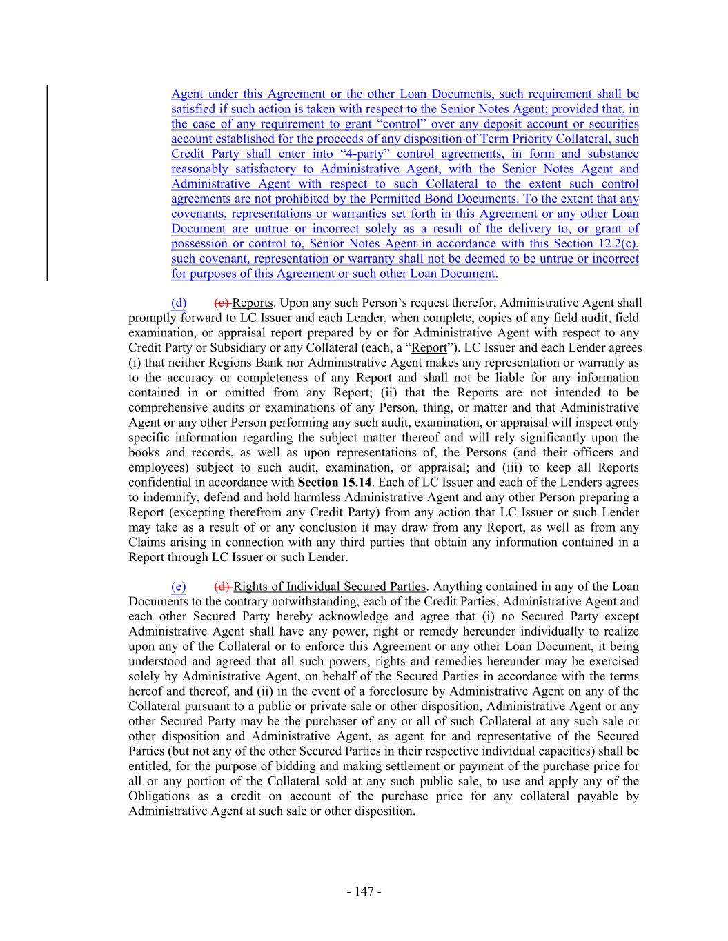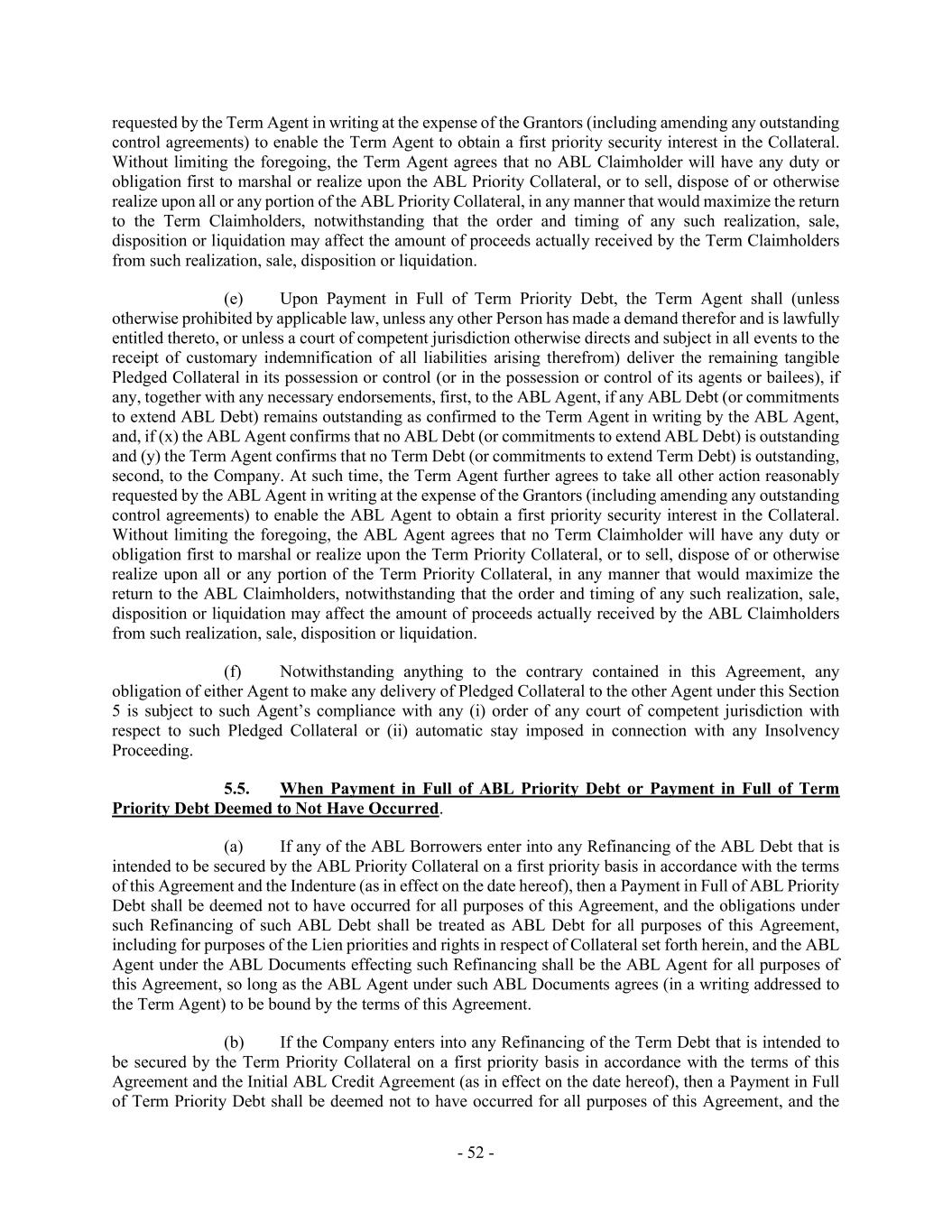 - 52 - requested by the Term Agent in writing at the expense of the Grantors (including amending any outstanding control agreements) to enable the Term Agent to obtain a first priority security interest in the Collateral. Without limiting the foregoing, the Term Agent agrees that no ABL Claimholder will have any duty or obligation first to marshal or realize upon the ABL Priority Collateral, or to sell, dispose of or otherwise realize upon all or any portion of the ABL Priority Collateral, in any manner that would maximize the return to the Term Claimholders, notwithstanding that the order and timing of any such realization, sale, disposition or liquidation may affect the amount of proceeds actually received by the Term Claimholders from such realization, sale, disposition or liquidation. (e) Upon Payment in Full of Term Priority Debt, the Term Agent shall (unless otherwise prohibited by applicable law, unless any other Person has made a demand therefor and is lawfully entitled thereto, or unless a court of competent jurisdiction otherwise directs and subject in all events to the receipt of customary indemnification of all liabilities arising therefrom) deliver the remaining tangible Pledged Collateral in its possession or control (or in the possession or control of its agents or bailees), if any, together with any necessary endorsements, first, to the ABL Agent, if any ABL Debt (or commitments to extend ABL Debt) remains outstanding as confirmed to the Term Agent in writing by the ABL Agent, and, if (x) the ABL Agent confirms that no ABL Debt (or commitments to extend ABL Debt) is outstanding and (y) the Term Agent confirms that no Term Debt (or commitments to extend Term Debt) is outstanding, second, to the Company. At such time, the Term Agent further agrees to take all other action reasonably requested by the ABL Agent in writing at the expense of the Grantors (including amending any outstanding control agreements) to enable the ABL Agent to obtain a first priority security interest in the Collateral. Without limiting the foregoing, the ABL Agent agrees that no Term Claimholder will have any duty or obligation first to marshal or realize upon the Term Priority Collateral, or to sell, dispose of or otherwise realize upon all or any portion of the Term Priority Collateral, in any manner that would maximize the return to the ABL Claimholders, notwithstanding that the order and timing of any such realization, sale, disposition or liquidation may affect the amount of proceeds actually received by the ABL Claimholders from such realization, sale, disposition or liquidation. (f) Notwithstanding anything to the contrary contained in this Agreement, any obligation of either Agent to make any delivery of Pledged Collateral to the other Agent under this Section 5 is subject to such Agent’s compliance with any (i) order of any court of competent jurisdiction with respect to such Pledged Collateral or (ii) automatic stay imposed in connection with any Insolvency Proceeding. 5.5. When Payment in Full of ABL Priority Debt or Payment in Full of Term Priority Debt Deemed to Not Have Occurred. (a) If any of the ABL Borrowers enter into any Refinancing of the ABL Debt that is intended to be secured by the ABL Priority Collateral on a first priority basis in accordance with the terms of this Agreement and the Indenture (as in effect on the date hereof), then a Payment in Full of ABL Priority Debt shall be deemed not to have occurred for all purposes of this Agreement, and the obligations under such Refinancing of such ABL Debt shall be treated as ABL Debt for all purposes of this Agreement, including for purposes of the Lien priorities and rights in respect of Collateral set forth herein, and the ABL Agent under the ABL Documents effecting such Refinancing shall be the ABL Agent for all purposes of this Agreement, so long as the ABL Agent under such ABL Documents agrees (in a writing addressed to the Term Agent) to be bound by the terms of this Agreement. (b) If the Company enters into any Refinancing of the Term Debt that is intended to be secured by the Term Priority Collateral on a first priority basis in accordance with the terms of this Agreement and the Initial ABL Credit Agreement (as in effect on the date hereof), then a Payment in Full of Term Priority Debt shall be deemed not to have occurred for all purposes of this Agreement, and the