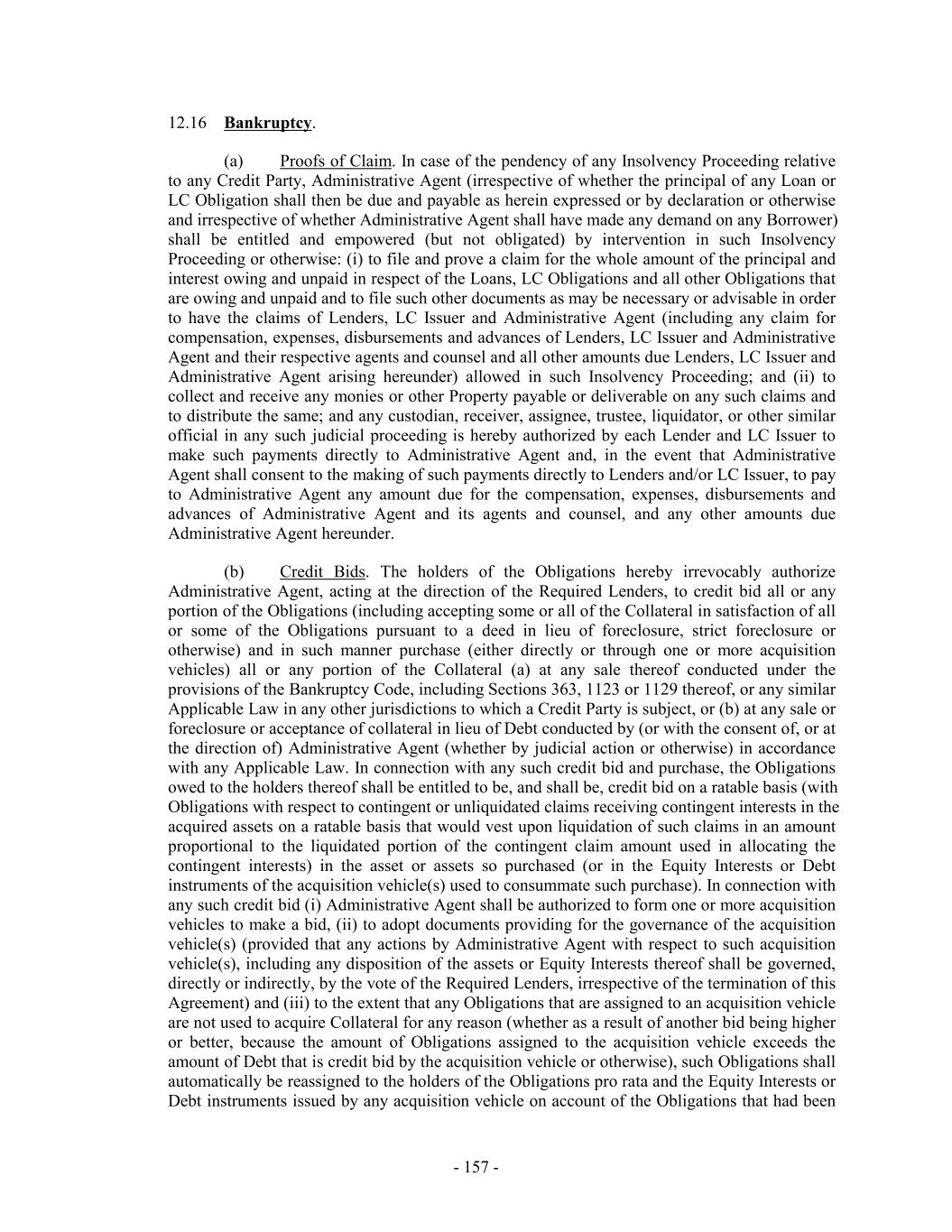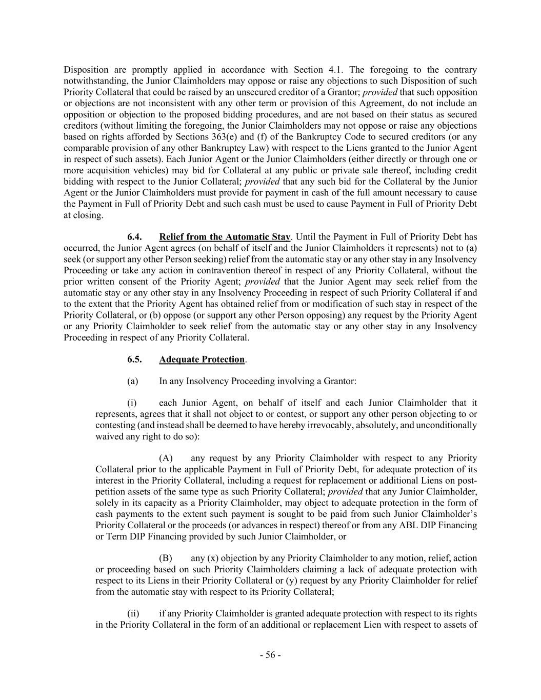 - 56 - Disposition are promptly applied in accordance with Section 4.1. The foregoing to the contrary notwithstanding, the Junior Claimholders may oppose or raise any objections to such Disposition of such Priority Collateral that could be raised by an unsecured creditor of a Grantor; provided that such opposition or objections are not inconsistent with any other term or provision of this Agreement, do not include an opposition or objection to the proposed bidding procedures, and are not based on their status as secured creditors (without limiting the foregoing, the Junior Claimholders may not oppose or raise any objections based on rights afforded by Sections 363(e) and (f) of the Bankruptcy Code to secured creditors (or any comparable provision of any other Bankruptcy Law) with respect to the Liens granted to the Junior Agent in respect of such assets). Each Junior Agent or the Junior Claimholders (either directly or through one or more acquisition vehicles) may bid for Collateral at any public or private sale thereof, including credit bidding with respect to the Junior Collateral; provided that any such bid for the Collateral by the Junior Agent or the Junior Claimholders must provide for payment in cash of the full amount necessary to cause the Payment in Full of Priority Debt and such cash must be used to cause Payment in Full of Priority Debt at closing. 6.4. Relief from the Automatic Stay. Until the Payment in Full of Priority Debt has occurred, the Junior Agent agrees (on behalf of itself and the Junior Claimholders it represents) not to (a) seek (or support any other Person seeking) relief from the automatic stay or any other stay in any Insolvency Proceeding or take any action in contravention thereof in respect of any Priority Collateral, without the prior written consent of the Priority Agent; provided that the Junior Agent may seek relief from the automatic stay or any other stay in any Insolvency Proceeding in respect of such Priority Collateral if and to the extent that the Priority Agent has obtained relief from or modification of such stay in respect of the Priority Collateral, or (b) oppose (or support any other Person opposing) any request by the Priority Agent or any Priority Claimholder to seek relief from the automatic stay or any other stay in any Insolvency Proceeding in respect of any Priority Collateral. 6.5. Adequate Protection. (a) In any Insolvency Proceeding involving a Grantor: (i) each Junior Agent, on behalf of itself and each Junior Claimholder that it represents, agrees that it shall not object to or contest, or support any other person objecting to or contesting (and instead shall be deemed to have hereby irrevocably, absolutely, and unconditionally waived any right to do so): (A) any request by any Priority Claimholder with respect to any Priority Collateral prior to the applicable Payment in Full of Priority Debt, for adequate protection of its interest in the Priority Collateral, including a request for replacement or additional Liens on post- petition assets of the same type as such Priority Collateral; provided that any Junior Claimholder, solely in its capacity as a Priority Claimholder, may object to adequate protection in the form of cash payments to the extent such payment is sought to be paid from such Junior Claimholder’s Priority Collateral or the proceeds (or advances in respect) thereof or from any ABL DIP Financing or Term DIP Financing provided by such Junior Claimholder, or (B) any (x) objection by any Priority Claimholder to any motion, relief, action or proceeding based on such Priority Claimholders claiming a lack of adequate protection with respect to its Liens in their Priority Collateral or (y) request by any Priority Claimholder for relief from the automatic stay with respect to its Priority Collateral; (ii) if any Priority Claimholder is granted adequate protection with respect to its rights in the Priority Collateral in the form of an additional or replacement Lien with respect to assets of