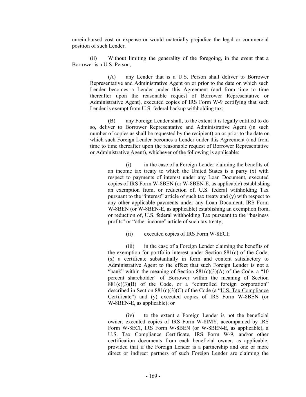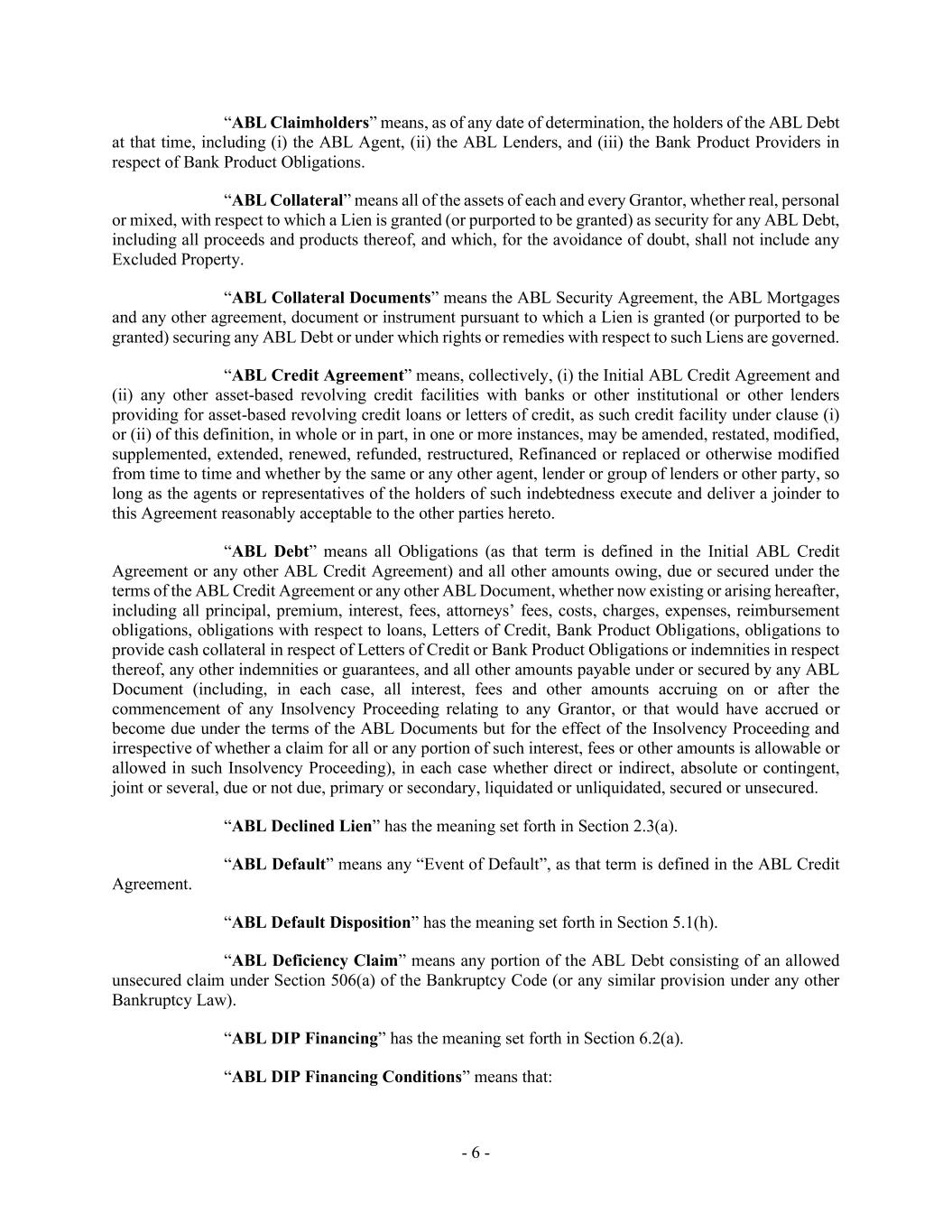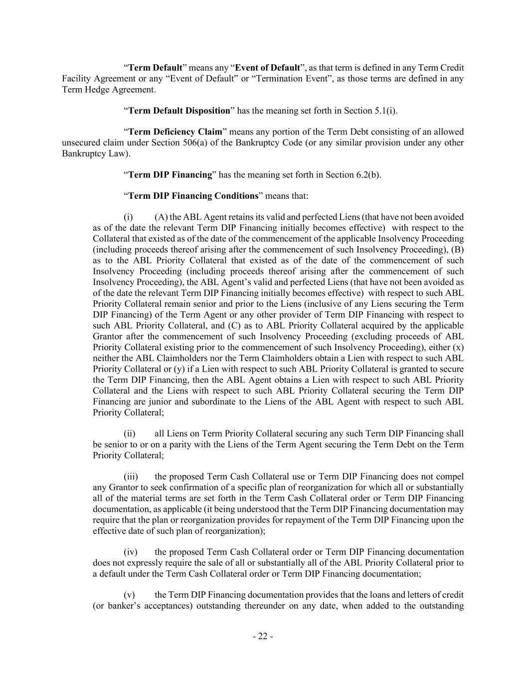 - 22 - “Term Default” means any “Event of Default”, as that term is defined in any Term Credit Facility Agreement or any “Event of Default” or “Termination Event”, as those terms are defined in any Term Hedge Agreement. “Term Default Disposition” has the meaning set forth in Section 5.1(i). “Term Deficiency Claim” means any portion of the Term Debt consisting of an allowed unsecured claim under Section 506(a) of the Bankruptcy Code (or any similar provision under any other Bankruptcy Law). “Term DIP Financing” has the meaning set forth in Section 6.2(b). “Term DIP Financing Conditions” means that: (i) (A) the ABL Agent retains its valid and perfected Liens (that have not been avoided as of the date the relevant Term DIP Financing initially becomes effective) with respect to the Collateral that existed as of the date of the commencement of the applicable Insolvency Proceeding (including proceeds thereof arising after the commencement of such Insolvency Proceeding), (B) as to the ABL Priority Collateral that existed as of the date of the commencement of such Insolvency Proceeding (including proceeds thereof arising after the commencement of such Insolvency Proceeding), the ABL Agent’s valid and perfected Liens (that have not been avoided as of the date the relevant Term DIP Financing initially becomes effective) with respect to such ABL Priority Collateral remain senior and prior to the Liens (inclusive of any Liens securing the Term DIP Financing) of the Term Agent or any other provider of Term DIP Financing with respect to such ABL Priority Collateral, and (C) as to ABL Priority Collateral acquired by the applicable Grantor after the commencement of such Insolvency Proceeding (excluding proceeds of ABL Priority Collateral existing prior to the commencement of such Insolvency Proceeding), either (x) neither the ABL Claimholders nor the Term Claimholders obtain a Lien with respect to such ABL Priority Collateral or (y) if a Lien with respect to such ABL Priority Collateral is granted to secure the Term DIP Financing, then the ABL Agent obtains a Lien with respect to such ABL Priority Collateral and the Liens with respect to such ABL Priority Collateral securing the Term DIP Financing are junior and subordinate to the Liens of the ABL Agent with respect to such ABL Priority Collateral; (ii) all Liens on Term Priority Collateral securing any such Term DIP Financing shall be senior to or on a parity with the Liens of the Term Agent securing the Term Debt on the Term Priority Collateral; (iii) the proposed Term Cash Collateral use or Term DIP Financing does not compel any Grantor to seek confirmation of a specific plan of reorganization for which all or substantially all of the material terms are set forth in the Term Cash Collateral order or Term DIP Financing documentation, as applicable (it being understood that the Term DIP Financing documentation may require that the plan or reorganization provides for repayment of the Term DIP Financing upon the effective date of such plan of reorganization); (iv) the proposed Term Cash Collateral order or Term DIP Financing documentation does not expressly require the sale of all or substantially all of the ABL Priority Collateral prior to a default under the Term Cash Collateral order or Term DIP Financing documentation; (v) the Term DIP Financing documentation provides that the loans and letters of credit (or banker’s acceptances) outstanding thereunder on any date, when added to the outstanding