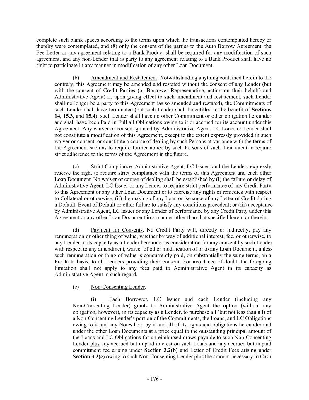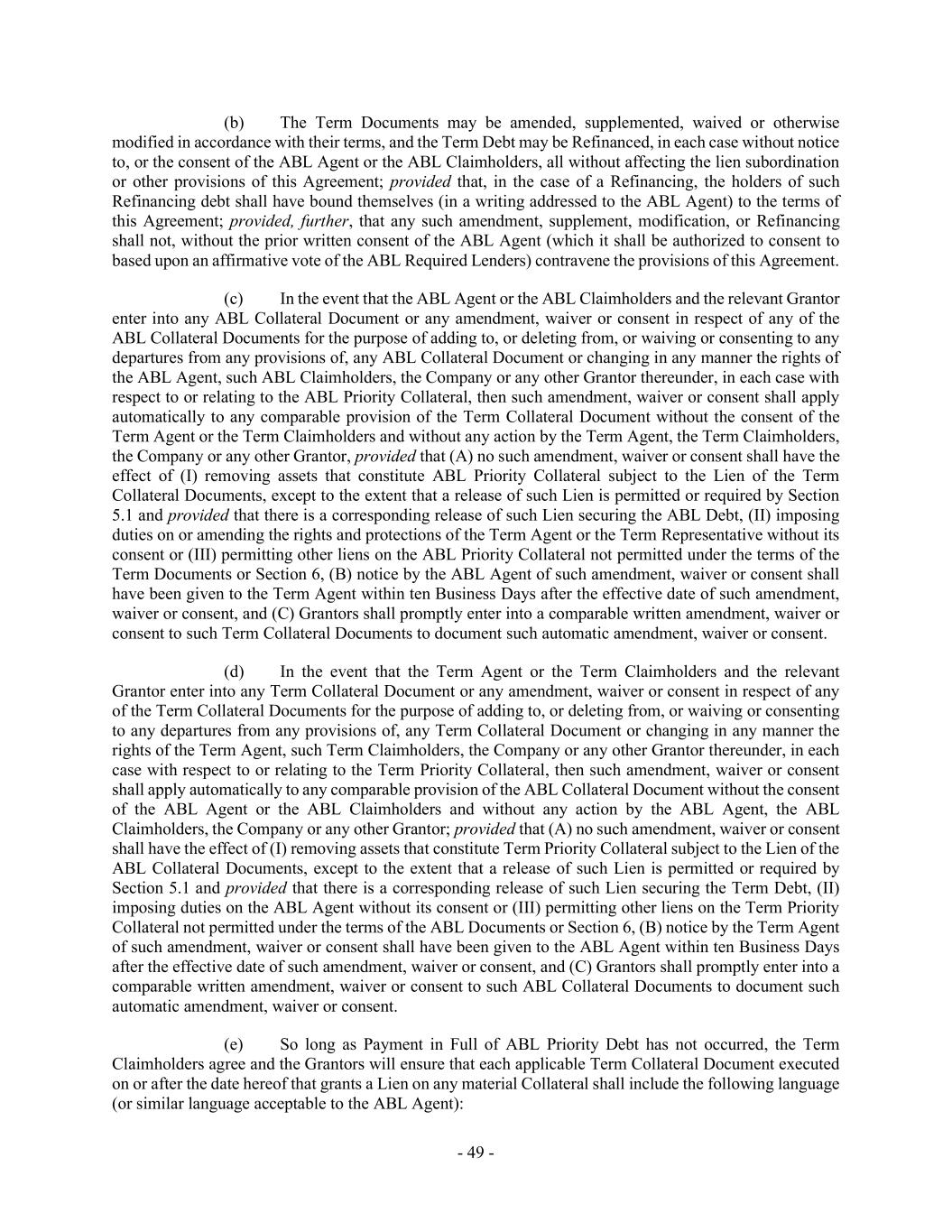 - 49 - (b) The Term Documents may be amended, supplemented, waived or otherwise modified in accordance with their terms, and the Term Debt may be Refinanced, in each case without notice to, or the consent of the ABL Agent or the ABL Claimholders, all without affecting the lien subordination or other provisions of this Agreement; provided that, in the case of a Refinancing, the holders of such Refinancing debt shall have bound themselves (in a writing addressed to the ABL Agent) to the terms of this Agreement; provided, further, that any such amendment, supplement, modification, or Refinancing shall not, without the prior written consent of the ABL Agent (which it shall be authorized to consent to based upon an affirmative vote of the ABL Required Lenders) contravene the provisions of this Agreement. (c) In the event that the ABL Agent or the ABL Claimholders and the relevant Grantor enter into any ABL Collateral Document or any amendment, waiver or consent in respect of any of the ABL Collateral Documents for the purpose of adding to, or deleting from, or waiving or consenting to any departures from any provisions of, any ABL Collateral Document or changing in any manner the rights of the ABL Agent, such ABL Claimholders, the Company or any other Grantor thereunder, in each case with respect to or relating to the ABL Priority Collateral, then such amendment, waiver or consent shall apply automatically to any comparable provision of the Term Collateral Document without the consent of the Term Agent or the Term Claimholders and without any action by the Term Agent, the Term Claimholders, the Company or any other Grantor, provided that (A) no such amendment, waiver or consent shall have the effect of (I) removing assets that constitute ABL Priority Collateral subject to the Lien of the Term Collateral Documents, except to the extent that a release of such Lien is permitted or required by Section 5.1 and provided that there is a corresponding release of such Lien securing the ABL Debt, (II) imposing duties on or amending the rights and protections of the Term Agent or the Term Representative without its consent or (III) permitting other liens on the ABL Priority Collateral not permitted under the terms of the Term Documents or Section 6, (B) notice by the ABL Agent of such amendment, waiver or consent shall have been given to the Term Agent within ten Business Days after the effective date of such amendment, waiver or consent, and (C) Grantors shall promptly enter into a comparable written amendment, waiver or consent to such Term Collateral Documents to document such automatic amendment, waiver or consent. (d) In the event that the Term Agent or the Term Claimholders and the relevant Grantor enter into any Term Collateral Document or any amendment, waiver or consent in respect of any of the Term Collateral Documents for the purpose of adding to, or deleting from, or waiving or consenting to any departures from any provisions of, any Term Collateral Document or changing in any manner the rights of the Term Agent, such Term Claimholders, the Company or any other Grantor thereunder, in each case with respect to or relating to the Term Priority Collateral, then such amendment, waiver or consent shall apply automatically to any comparable provision of the ABL Collateral Document without the consent of the ABL Agent or the ABL Claimholders and without any action by the ABL Agent, the ABL Claimholders, the Company or any other Grantor; provided that (A) no such amendment, waiver or consent shall have the effect of (I) removing assets that constitute Term Priority Collateral subject to the Lien of the ABL Collateral Documents, except to the extent that a release of such Lien is permitted or required by Section 5.1 and provided that there is a corresponding release of such Lien securing the Term Debt, (II) imposing duties on the ABL Agent without its consent or (III) permitting other liens on the Term Priority Collateral not permitted under the terms of the ABL Documents or Section 6, (B) notice by the Term Agent of such amendment, waiver or consent shall have been given to the ABL Agent within ten Business Days after the effective date of such amendment, waiver or consent, and (C) Grantors shall promptly enter into a comparable written amendment, waiver or consent to such ABL Collateral Documents to document such automatic amendment, waiver or consent. (e) So long as Payment in Full of ABL Priority Debt has not occurred, the Term Claimholders agree and the Grantors will ensure that each applicable Term Collateral Document executed on or after the date hereof that grants a Lien on any material Collateral shall include the following language (or similar language acceptable to the ABL Agent):