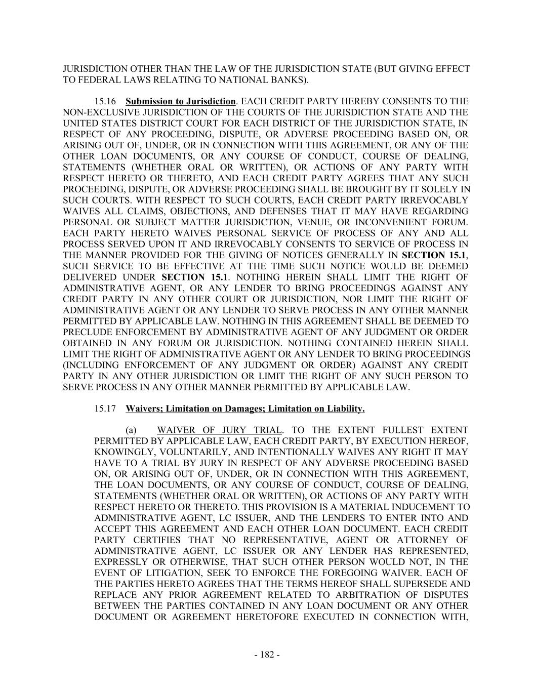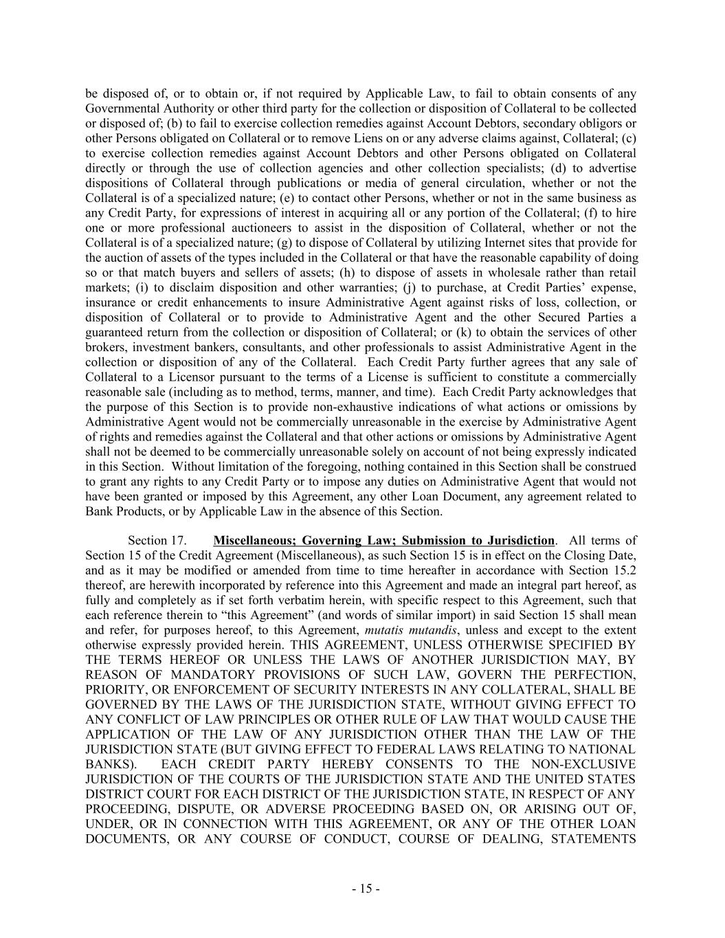 be disposed of, or to obtain or, if not required by Applicable Law, to fail to obtain consents of any Governmental Authority or other third party for the collection or disposition of Collateral to be collected or disposed of; (b) to fail to exercise collection remedies against Account Debtors, secondary obligors or other Persons obligated on Collateral or to remove Liens on or any adverse claims against, Collateral; (c) to exercise collection remedies against Account Debtors and other Persons obligated on Collateral directly or through the use of collection agencies and other collection specialists; (d) to advertise dispositions of Collateral through publications or media of general circulation, whether or not the Collateral is of a specialized nature; (e) to contact other Persons, whether or not in the same business as any Credit Party, for expressions of interest in acquiring all or any portion of the Collateral; (f) to hire one or more professional auctioneers to assist in the disposition of Collateral, whether or not the Collateral is of a specialized nature; (g) to dispose of Collateral by utilizing Internet sites that provide for the auction of assets of the types included in the Collateral or that have the reasonable capability of doing so or that match buyers and sellers of assets; (h) to dispose of assets in wholesale rather than retail markets; (i) to disclaim disposition and other warranties; (j) to purchase, at Credit Parties’ expense, insurance or credit enhancements to insure Administrative Agent against risks of loss, collection, or disposition of Collateral or to provide to Administrative Agent and the other Secured Parties a guaranteed return from the collection or disposition of Collateral; or (k) to obtain the services of other brokers, investment bankers, consultants, and other professionals to assist Administrative Agent in the collection or disposition of any of the Collateral. Each Credit Party further agrees that any sale of Collateral to a Licensor pursuant to the terms of a License is sufficient to constitute a commercially reasonable sale (including as to method, terms, manner, and time). Each Credit Party acknowledges that the purpose of this Section is to provide non-exhaustive indications of what actions or omissions by Administrative Agent would not be commercially unreasonable in the exercise by Administrative Agent of rights and remedies against the Collateral and that other actions or omissions by Administrative Agent shall not be deemed to be commercially unreasonable solely on account of not being expressly indicated in this Section. Without limitation of the foregoing, nothing contained in this Section shall be construed to grant any rights to any Credit Party or to impose any duties on Administrative Agent that would not have been granted or imposed by this Agreement, any other Loan Document, any agreement related to Bank Products, or by Applicable Law in the absence of this Section. Section 17. Miscellaneous; Governing Law; Submission to Jurisdiction. All terms of Section 15 of the Credit Agreement (Miscellaneous), as such Section 15 is in effect on the Closing Date, and as it may be modified or amended from time to time hereafter in accordance with Section 15.2 thereof, are herewith incorporated by reference into this Agreement and made an integral part hereof, as fully and completely as if set forth verbatim herein, with specific respect to this Agreement, such that each reference therein to “this Agreement” (and words of similar import) in said Section 15 shall mean and refer, for purposes hereof, to this Agreement, mutatis mutandis, unless and except to the extent otherwise expressly provided herein. THIS AGREEMENT, UNLESS OTHERWISE SPECIFIED BY THE TERMS HEREOF OR UNLESS THE LAWS OF ANOTHER JURISDICTION MAY, BY REASON OF MANDATORY PROVISIONS OF SUCH LAW, GOVERN THE PERFECTION, PRIORITY, OR ENFORCEMENT OF SECURITY INTERESTS IN ANY COLLATERAL, SHALL BE GOVERNED BY THE LAWS OF THE JURISDICTION STATE, WITHOUT GIVING EFFECT TO ANY CONFLICT OF LAW PRINCIPLES OR OTHER RULE OF LAW THAT WOULD CAUSE THE APPLICATION OF THE LAW OF ANY JURISDICTION OTHER THAN THE LAW OF THE JURISDICTION STATE (BUT GIVING EFFECT TO FEDERAL LAWS RELATING TO NATIONAL BANKS). EACH CREDIT PARTY HEREBY CONSENTS TO THE NON-EXCLUSIVE JURISDICTION OF THE COURTS OF THE JURISDICTION STATE AND THE UNITED STATES DISTRICT COURT FOR EACH DISTRICT OF THE JURISDICTION STATE, IN RESPECT OF ANY PROCEEDING, DISPUTE, OR ADVERSE PROCEEDING BASED ON, OR ARISING OUT OF, UNDER, OR IN CONNECTION WITH THIS AGREEMENT, OR ANY OF THE OTHER LOAN DOCUMENTS, OR ANY COURSE OF CONDUCT, COURSE OF DEALING, STATEMENTS - 15 -