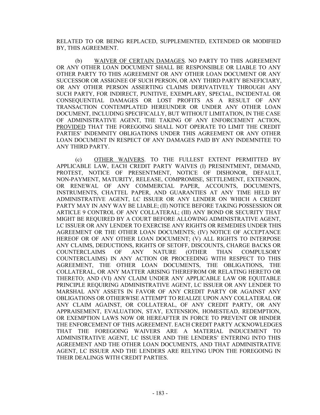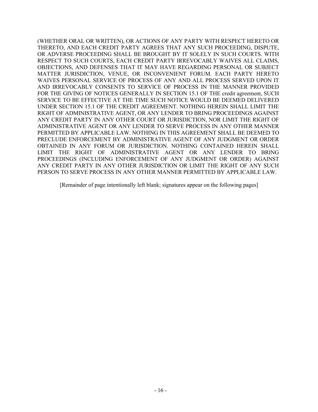 (WHETHER ORAL OR WRITTEN), OR ACTIONS OF ANY PARTY WITH RESPECT HERETO OR THERETO, AND EACH CREDIT PARTY AGREES THAT ANY SUCH PROCEEDING, DISPUTE, OR ADVERSE PROCEEDING SHALL BE BROUGHT BY IT SOLELY IN SUCH COURTS. WITH RESPECT TO SUCH COURTS, EACH CREDIT PARTY IRREVOCABLY WAIVES ALL CLAIMS, OBJECTIONS, AND DEFENSES THAT IT MAY HAVE REGARDING PERSONAL OR SUBJECT MATTER JURISDICTION, VENUE, OR INCONVENIENT FORUM. EACH PARTY HERETO WAIVES PERSONAL SERVICE OF PROCESS OF ANY AND ALL PROCESS SERVED UPON IT AND IRREVOCABLY CONSENTS TO SERVICE OF PROCESS IN THE MANNER PROVIDED FOR THE GIVING OF NOTICES GENERALLY IN SECTION 15.1 OF THE credit agreement, SUCH SERVICE TO BE EFFECTIVE AT THE TIME SUCH NOTICE WOULD BE DEEMED DELIVERED UNDER SECTION 15.1 OF THE CREDIT AGREEMENT. NOTHING HEREIN SHALL LIMIT THE RIGHT OF ADMINISTRATIVE AGENT, OR ANY LENDER TO BRING PROCEEDINGS AGAINST ANY CREDIT PARTY IN ANY OTHER COURT OR JURISDICTION, NOR LIMIT THE RIGHT OF ADMINISTRATIVE AGENT OR ANY LENDER TO SERVE PROCESS IN ANY OTHER MANNER PERMITTED BY APPLICABLE LAW. NOTHING IN THIS AGREEMENT SHALL BE DEEMED TO PRECLUDE ENFORCEMENT BY ADMINISTRATIVE AGENT OF ANY JUDGMENT OR ORDER OBTAINED IN ANY FORUM OR JURISDICTION. NOTHING CONTAINED HEREIN SHALL LIMIT THE RIGHT OF ADMINISTRATIVE AGENT OR ANY LENDER TO BRING PROCEEDINGS (INCLUDING ENFORCEMENT OF ANY JUDGMENT OR ORDER) AGAINST ANY CREDIT PARTY IN ANY OTHER JURISDICTION OR LIMIT THE RIGHT OF ANY SUCH PERSON TO SERVE PROCESS IN ANY OTHER MANNER PERMITTED BY APPLICABLE LAW. [Remainder of page intentionally left blank; signatures appear on the following pages] - 16 -
