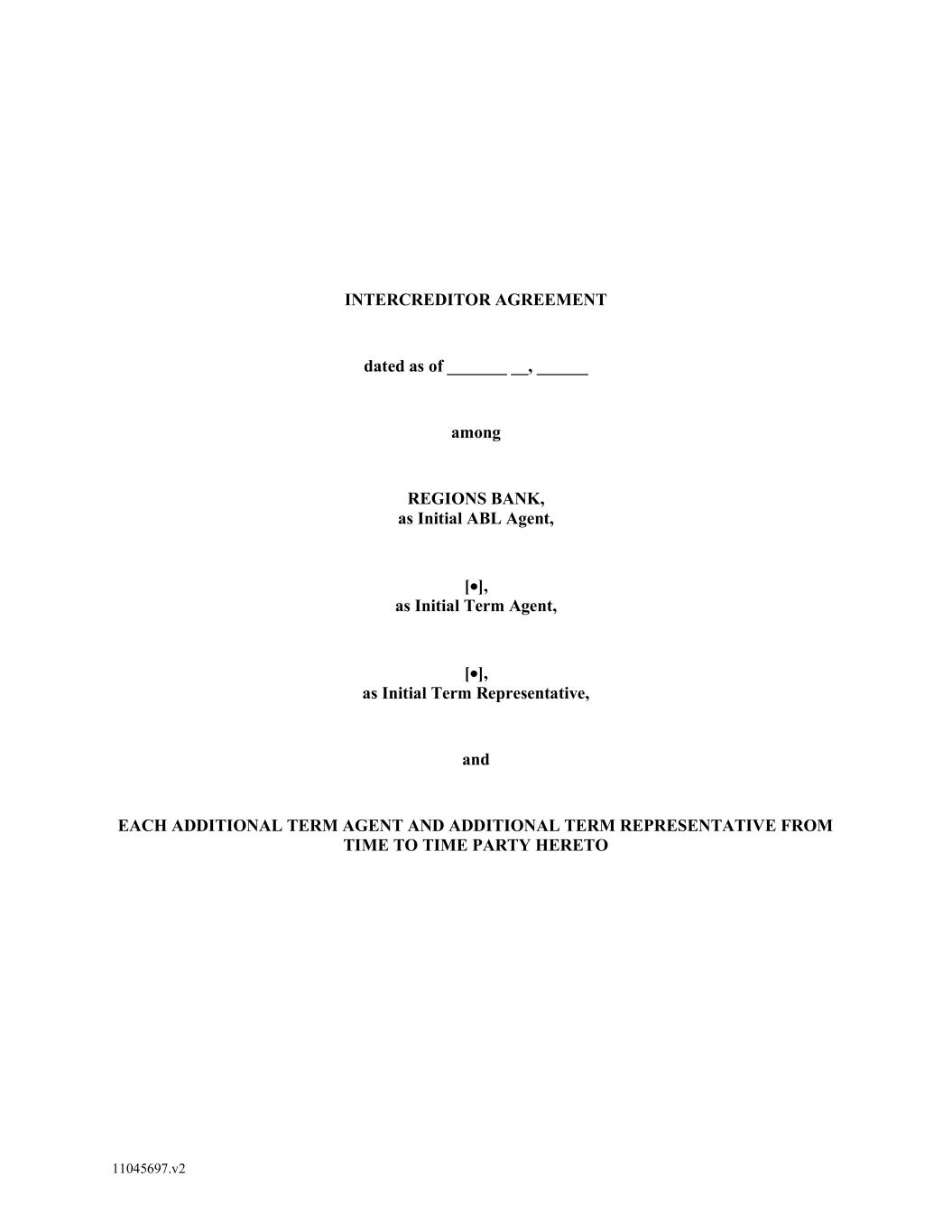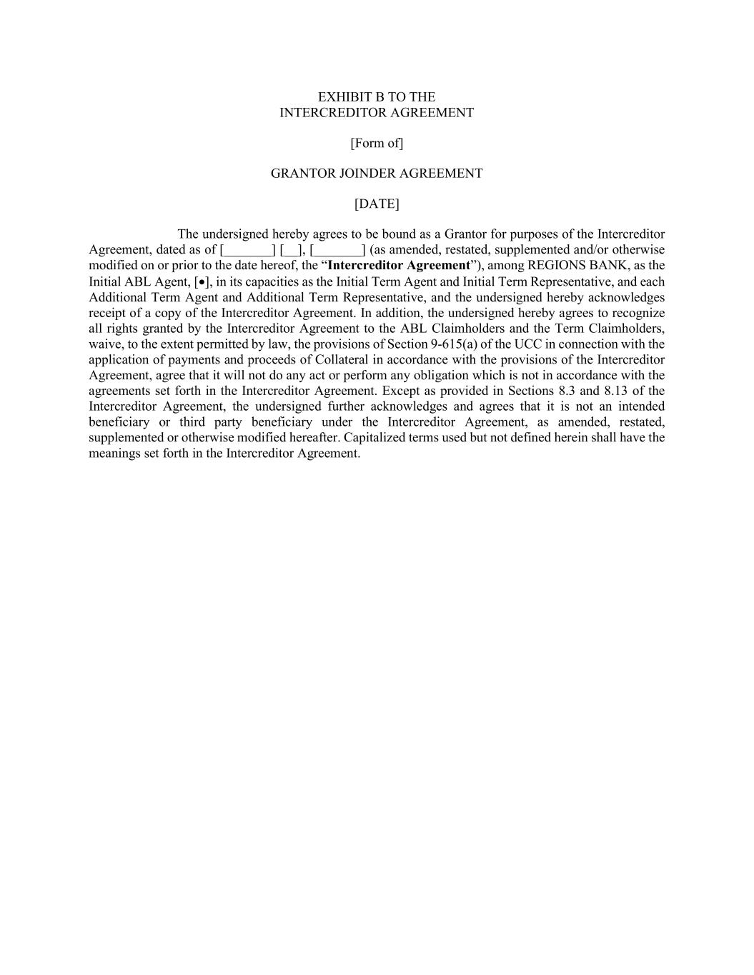 EXHIBIT B TO THE INTERCREDITOR AGREEMENT [Form of] GRANTOR JOINDER AGREEMENT [DATE] The undersigned hereby agrees to be bound as a Grantor for purposes of the Intercreditor Agreement, dated as of [_______] [__], [_______] (as amended, restated, supplemented and/or otherwise modified on or prior to the date hereof, the “Intercreditor Agreement”), among REGIONS BANK, as the Initial ABL Agent, [], in its capacities as the Initial Term Agent and Initial Term Representative, and each Additional Term Agent and Additional Term Representative, and the undersigned hereby acknowledges receipt of a copy of the Intercreditor Agreement. In addition, the undersigned hereby agrees to recognize all rights granted by the Intercreditor Agreement to the ABL Claimholders and the Term Claimholders, waive, to the extent permitted by law, the provisions of Section 9-615(a) of the UCC in connection with the application of payments and proceeds of Collateral in accordance with the provisions of the Intercreditor Agreement, agree that it will not do any act or perform any obligation which is not in accordance with the agreements set forth in the Intercreditor Agreement. Except as provided in Sections 8.3 and 8.13 of the Intercreditor Agreement, the undersigned further acknowledges and agrees that it is not an intended beneficiary or third party beneficiary under the Intercreditor Agreement, as amended, restated, supplemented or otherwise modified hereafter. Capitalized terms used but not defined herein shall have the meanings set forth in the Intercreditor Agreement.