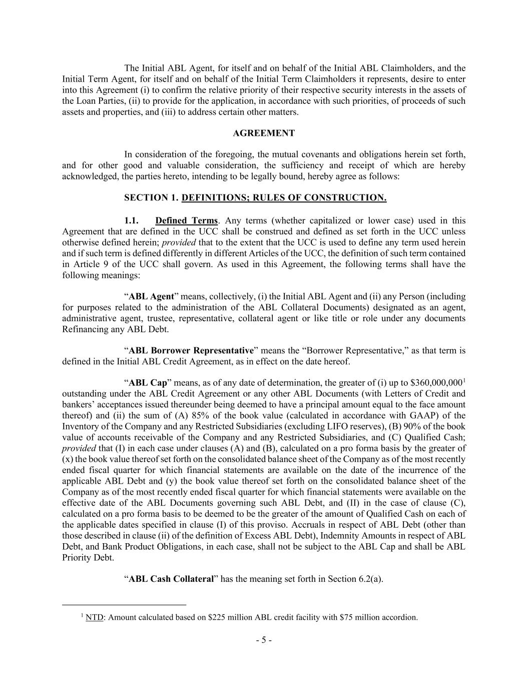 - 27 - (vi) any definition of, or reference to, ABL Collateral or Term Collateral herein shall not be construed as referring to any amounts recovered by a Grantor, as a debtor in possession, or a trustee for the estate of a Grantor, under Section 506(c) of the Bankruptcy Code (or by comparable Persons under any other Bankruptcy Law); (vii) any reference herein to any person shall be construed to include such person’s successors and assigns and as to any Grantor shall be deemed to include a receiver, trustee or debtor-in-possession on behalf of any of such person or on behalf of any such successor or assignee of such person; (viii) except as otherwise expressly provided herein, any reference to the ABL Agent agreeing to or having the right to do, or refraining from or having the right to refrain from doing, an act shall be construed as binding upon each of the ABL Claimholders, any reference to the ABL Agent shall be construed as referring to the ABL Agent, for itself and on behalf of the other ABL Claimholders, any reference to the Term Agent agreeing to or having the right to do, or refraining from or having the right to refrain from doing, an act shall be construed as binding upon each of the Term Claimholders for which such the Term Agent serves as agent, any reference to the Term Agent shall be construed as referring to the Term Agent, for itself and on behalf of the other Term Claimholders for which such the Term Agent serves as agent, any reference to the ABL Claimholders shall be construed as including the ABL Agent, and any reference to the Term Claimholders shall be construed as referring to the Term Agent; (ix) the words “herein,” “hereof” and “hereunder,” and words of similar import, shall be construed to refer to this Agreement in its entirety and not to any particular provision hereof; (x) all references herein to Sections shall be construed to refer to Sections of this Agreement unless otherwise specified; and (xi) the words “asset” and “property” shall be construed to have the same meaning and effect and to refer to any and all tangible and intangible assets and properties, including cash, securities, Accounts and contract rights. SECTION 2. LIEN PRIORITIES. 2.1. Relative Priorities. (a) Notwithstanding the date, time, method, manner, or order of grant, attachment, or perfection of any Liens in the Collateral securing the Term Debt or of any Liens in the Collateral securing the ABL Debt (including, in each case, notwithstanding whether any such Lien is granted (or secures Debt relating to the period) before or after the commencement of any Insolvency Proceeding) and notwithstanding any contrary provision of the UCC or any other applicable law or the Term Documents or the ABL Documents or any defect or deficiencies in, or failure to attach or perfect, the Liens securing or purporting to secure the ABL Debt or the Term Debt, the possession or control of the Collateral by any Claimholder, or any other circumstance whatsoever, the ABL Agent and the Term Agent hereby agree that: (i) any Lien with respect to the ABL Priority Collateral securing any ABL Priority Debt, whether such Lien is now or hereafter held by or on behalf of, or created for the benefit of, any of the ABL Claimholders or any agent or trustee therefor, regardless of how or when acquired, whether by grant, possession, statute, operation of law, subrogation or otherwise, shall be senior in all respects and prior to any Lien with respect to the ABL Priority Collateral securing (A) any Term Debt or (B) any Excess ABL Debt;
