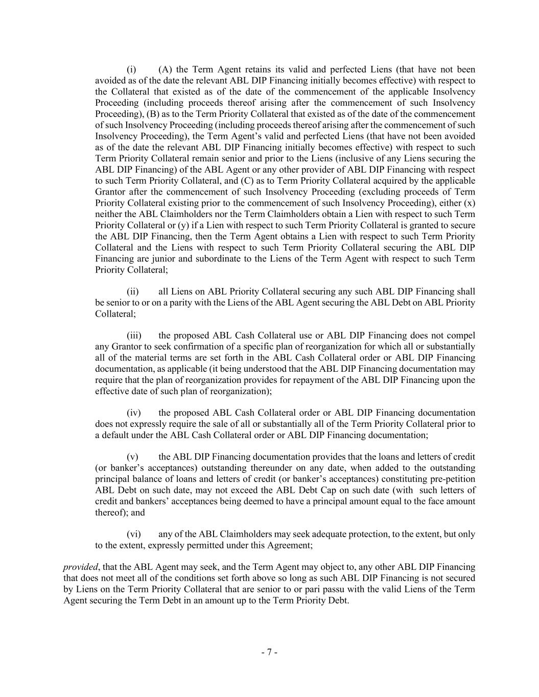 - 55 - any similar provision of any other Bankruptcy Law secured by a Lien on such Term Priority Collateral (such financing, a “Term DIP Financing”), and if such Term Cash Collateral use or Term DIP Financing, as applicable, meets the applicable Term DIP Financing Conditions, then, subject to the proviso in the definition of Term DIP Conditions, the ABL Agent will not be permitted to object and will be deemed to have consented to such Term Cash Collateral use and will raise no objection to such Term DIP Financing, as applicable, and, if Term DIP Financing is involved, the ABL Agent will subordinate and will be deemed to have subordinated its Liens in the Term Priority Collateral to the Liens securing such Term DIP Financing. If such Term Cash Collateral use or Term DIP Financing, as applicable, meets some, but not all, of the applicable Term DIP Financing Conditions, then the ABL Agent unconditionally agrees that it will only withhold its consent to such Term Cash Collateral use and will only raise an objection to such Term DIP Financing based upon the Term DIP Financing Condition(s) which are not met and will not withhold its consent or object on any other basis. If Term DIP Financing is involved and any permitted objection of the ABL Agent is withdrawn, overruled, or otherwise eliminated, the ABL Agent will subordinate and will be deemed to have subordinated its Liens in the Term Priority Collateral to the Liens securing such Term DIP Financing. The ABL Agent agrees that it shall not, and nor shall any of the ABL Claimholders, directly or indirectly, provide, offer to provide, or support any financing competing with the Term DIP Financing, that in each case would be secured by a Lien on the Term Priority Collateral that is senior to or pari passu with the Liens securing the Term Debt. If, in connection with any Term Cash Collateral use or Term DIP Financing, any Liens on the Term Priority Collateral held by the Term Claimholders to secure the Term Debt are subject to a surcharge or are subordinated to an administrative priority claim, a professional fee “carve-out,” or fees owed to the United States trustee in such proceeding, then the Liens on the Term Priority Collateral of the ABL Claimholders securing the ABL Debt shall also be subordinated to such interest or claim and shall remain subordinated to the Liens on the Term Priority Collateral of the Term Claimholders consistent with this Agreement. (c) All Liens granted to the ABL Agent or the Term Agent in any Insolvency Proceeding, whether as adequate protection or otherwise, are intended by the parties to be and shall be deemed to be subject to the Lien priorities in Section 2.1 and the other terms and conditions of this Agreement. Except as expressly set forth herein, nothing shall prevent the Agents or the Claimholders from objecting to any plan of reorganization under the Bankruptcy Code. (d) Notwithstanding anything to the contrary herein, including without limitation Sections 2.1 and 6.2(c) hereof, it is understood and agreed that the priority of the Liens securing (x) any ABL DIP Financing with respect to the ABL Priority Collateral shall at all times be senior to any Liens securing the Term Debt and such ABL DIP Financing shall not constitute (or be deemed to constitute) Excess ABL Debt and (y) any Term DIP Financing with respect to the Term Priority Collateral shall at all times be senior to any Liens securing the ABL Debt and such Term DIP Financing shall not constitute (or be deemed to constitute) Excess Term Debt. 6.3. Sales. Each Junior Agent agrees that it will consent to, and will not object to or oppose, or support, directly or indirectly, any other person seeking to object to or oppose, a motion that is supported by the Priority Agent (i) to Dispose of any of its Priority Collateral free and clear of the Liens of the Junior Agent under Section 363 or Section 1129 of the Bankruptcy Code or (ii) to approve any procedures for the sale or disposition of any of its Priority Collateral of any of the Grantors if (a) the Priority Agent has consented to the sale of such Collateral free and clear of the Liens of the Priority Agent, (b) such motion does not impair, subject to the priorities set forth in this Agreement, the rights of the Junior Claimholders under Section 363(k) of the Bankruptcy Code (so long as the right of the Junior Claimholders to offset their claims against the purchase price only arises after the Priority Debt has been paid in full in cash) and (c) either (i) pursuant to court order, the Liens of the Junior Agent attach to the net proceeds of the Disposition with the same priority and validity as the Liens held by such Junior Agent on such Priority Collateral, and the Liens remain subject to the terms of this Agreement, or (ii) the proceeds of the
