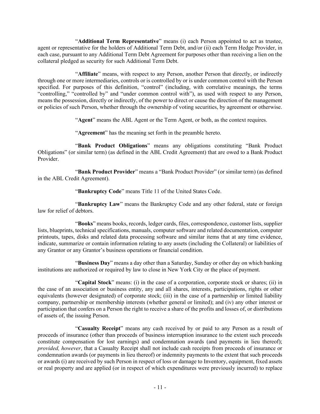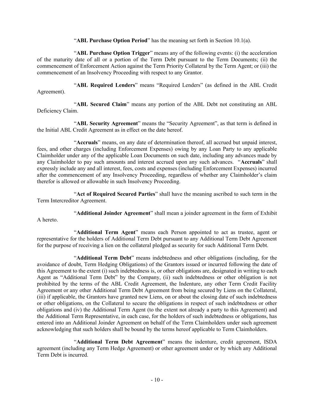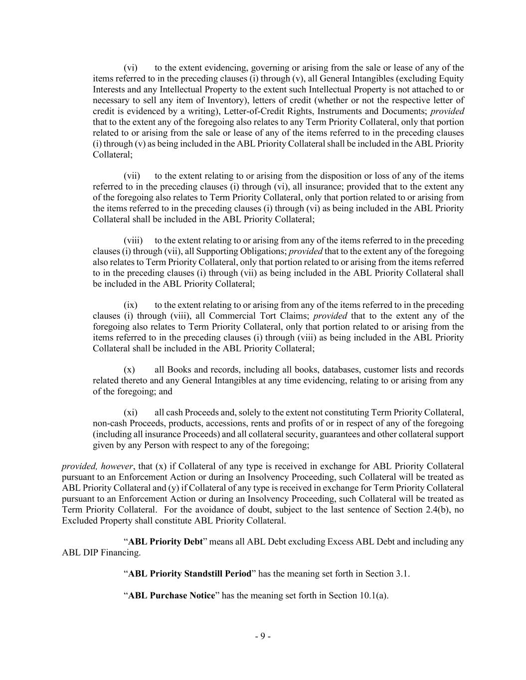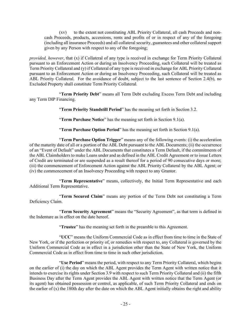 - 25 - (xv) to the extent not constituting ABL Priority Collateral, all cash Proceeds and non- cash Proceeds, products, accessions, rents and profits of or in respect of any of the foregoing (including all insurance Proceeds) and all collateral security, guarantees and other collateral support given by any Person with respect to any of the foregoing; provided, however, that (x) if Collateral of any type is received in exchange for Term Priority Collateral pursuant to an Enforcement Action or during an Insolvency Proceeding, such Collateral will be treated as Term Priority Collateral and (y) if Collateral of any type is received in exchange for ABL Priority Collateral pursuant to an Enforcement Action or during an Insolvency Proceeding, such Collateral will be treated as ABL Priority Collateral. For the avoidance of doubt, subject to the last sentence of Section 2.4(b), no Excluded Property shall constitute Term Priority Collateral. “Term Priority Debt” means all Term Debt excluding Excess Term Debt and including any Term DIP Financing. “Term Priority Standstill Period” has the meaning set forth in Section 3.2. “Term Purchase Notice” has the meaning set forth in Section 9.1(a). “Term Purchase Option Period” has the meaning set forth in Section 9.1(a). “Term Purchase Option Trigger” means any of the following events: (i) the acceleration of the maturity date of all or a portion of the ABL Debt pursuant to the ABL Documents; (ii) the occurrence of an “Event of Default” under the ABL Documents that constitutes a Term Default, if the commitments of the ABL Claimholders to make Loans under and as defined in the ABL Credit Agreement or to issue Letters of Credit are terminated or are suspended as a result thereof for a period of 90 consecutive days or more; (iii) the commencement of Enforcement Action against the ABL Priority Collateral by the ABL Agent; or (iv) the commencement of an Insolvency Proceeding with respect to any Grantor. “Term Representative” means, collectively, the Initial Term Representative and each Additional Term Representative. “Term Secured Claim” means any portion of the Term Debt not constituting a Term Deficiency Claim. “Term Security Agreement” means the “Security Agreement”, as that term is defined in the Indenture as in effect on the date hereof. “Trustee” has the meaning set forth in the preamble to this Agreement. “UCC” means the Uniform Commercial Code as in effect from time to time in the State of New York, or if the perfection or priority of, or remedies with respect to, any Collateral is governed by the Uniform Commercial Code as in effect in a jurisdiction other than the State of New York, the Uniform Commercial Code as in effect from time to time in such other jurisdiction. “Use Period” means the period, with respect to any Term Priority Collateral, which begins on the earlier of (i) the day on which the ABL Agent provides the Term Agent with written notice that it intends to exercise its rights under Section 3.9 with respect to such Term Priority Collateral and (ii) the fifth Business Day after the Term Agent provides the ABL Agent with written notice that the Term Agent (or its agent) has obtained possession or control, as applicable, of such Term Priority Collateral and ends on the earlier of (x) the 180th day after the date on which the ABL Agent initially obtains the right and ability