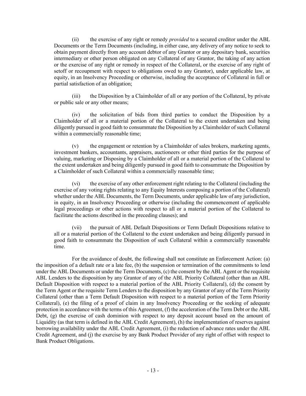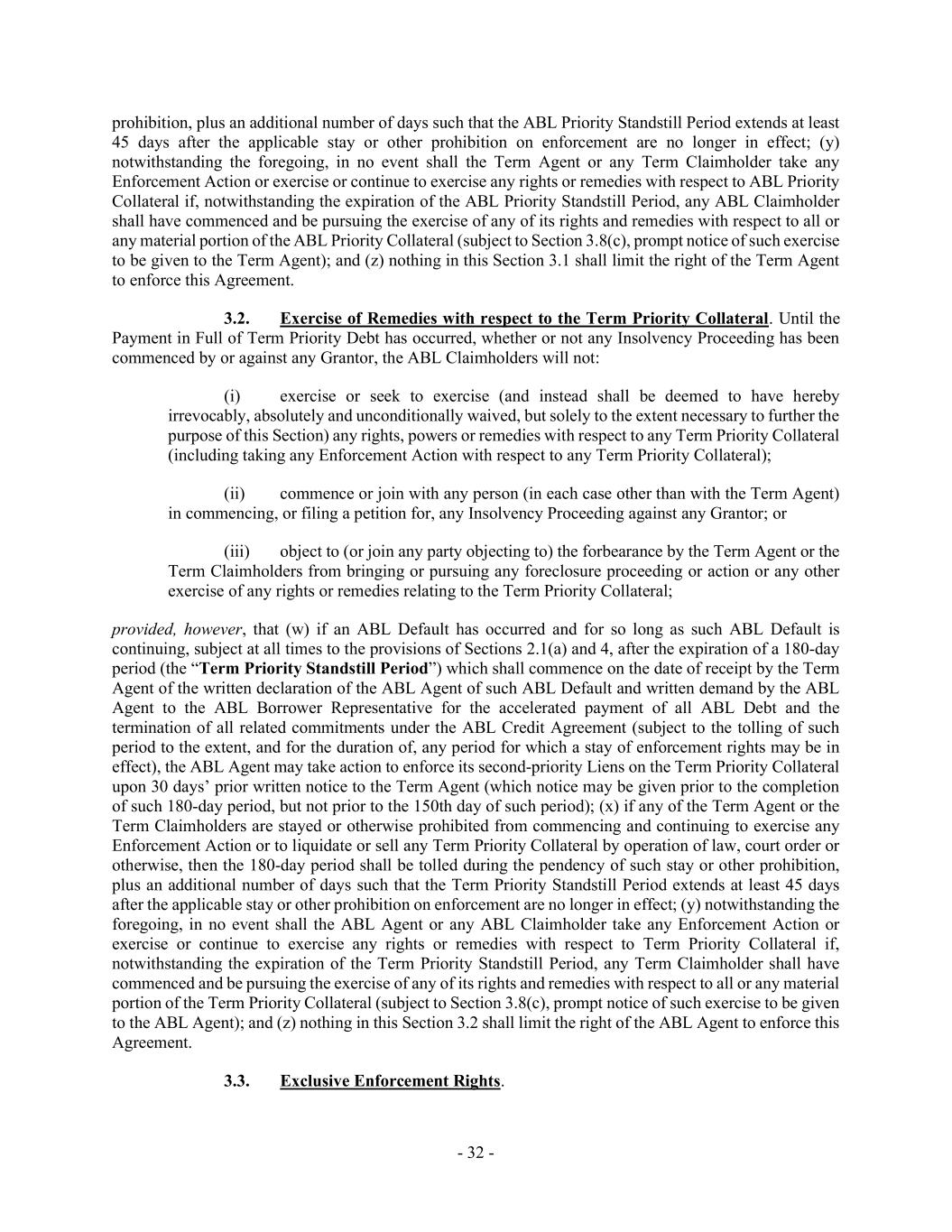 - 32 - prohibition, plus an additional number of days such that the ABL Priority Standstill Period extends at least 45 days after the applicable stay or other prohibition on enforcement are no longer in effect; (y) notwithstanding the foregoing, in no event shall the Term Agent or any Term Claimholder take any Enforcement Action or exercise or continue to exercise any rights or remedies with respect to ABL Priority Collateral if, notwithstanding the expiration of the ABL Priority Standstill Period, any ABL Claimholder shall have commenced and be pursuing the exercise of any of its rights and remedies with respect to all or any material portion of the ABL Priority Collateral (subject to Section 3.8(c), prompt notice of such exercise to be given to the Term Agent); and (z) nothing in this Section 3.1 shall limit the right of the Term Agent to enforce this Agreement. 3.2. Exercise of Remedies with respect to the Term Priority Collateral. Until the Payment in Full of Term Priority Debt has occurred, whether or not any Insolvency Proceeding has been commenced by or against any Grantor, the ABL Claimholders will not: (i) exercise or seek to exercise (and instead shall be deemed to have hereby irrevocably, absolutely and unconditionally waived, but solely to the extent necessary to further the purpose of this Section) any rights, powers or remedies with respect to any Term Priority Collateral (including taking any Enforcement Action with respect to any Term Priority Collateral); (ii) commence or join with any person (in each case other than with the Term Agent) in commencing, or filing a petition for, any Insolvency Proceeding against any Grantor; or (iii) object to (or join any party objecting to) the forbearance by the Term Agent or the Term Claimholders from bringing or pursuing any foreclosure proceeding or action or any other exercise of any rights or remedies relating to the Term Priority Collateral; provided, however, that (w) if an ABL Default has occurred and for so long as such ABL Default is continuing, subject at all times to the provisions of Sections 2.1(a) and 4, after the expiration of a 180-day period (the “Term Priority Standstill Period”) which shall commence on the date of receipt by the Term Agent of the written declaration of the ABL Agent of such ABL Default and written demand by the ABL Agent to the ABL Borrower Representative for the accelerated payment of all ABL Debt and the termination of all related commitments under the ABL Credit Agreement (subject to the tolling of such period to the extent, and for the duration of, any period for which a stay of enforcement rights may be in effect), the ABL Agent may take action to enforce its second-priority Liens on the Term Priority Collateral upon 30 days’ prior written notice to the Term Agent (which notice may be given prior to the completion of such 180-day period, but not prior to the 150th day of such period); (x) if any of the Term Agent or the Term Claimholders are stayed or otherwise prohibited from commencing and continuing to exercise any Enforcement Action or to liquidate or sell any Term Priority Collateral by operation of law, court order or otherwise, then the 180-day period shall be tolled during the pendency of such stay or other prohibition, plus an additional number of days such that the Term Priority Standstill Period extends at least 45 days after the applicable stay or other prohibition on enforcement are no longer in effect; (y) notwithstanding the foregoing, in no event shall the ABL Agent or any ABL Claimholder take any Enforcement Action or exercise or continue to exercise any rights or remedies with respect to Term Priority Collateral if, notwithstanding the expiration of the Term Priority Standstill Period, any Term Claimholder shall have commenced and be pursuing the exercise of any of its rights and remedies with respect to all or any material portion of the Term Priority Collateral (subject to Section 3.8(c), prompt notice of such exercise to be given to the ABL Agent); and (z) nothing in this Section 3.2 shall limit the right of the ABL Agent to enforce this Agreement. 3.3. Exclusive Enforcement Rights.