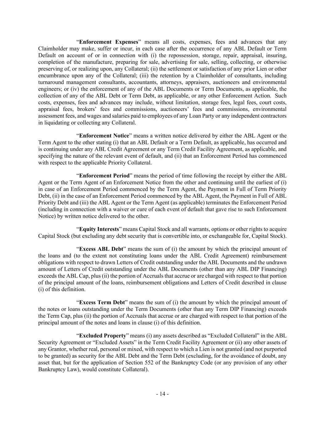 - 14 - “Enforcement Expenses” means all costs, expenses, fees and advances that any Claimholder may make, suffer or incur, in each case after the occurrence of any ABL Default or Term Default on account of or in connection with (i) the repossession, storage, repair, appraisal, insuring, completion of the manufacture, preparing for sale, advertising for sale, selling, collecting, or otherwise preserving of, or realizing upon, any Collateral; (ii) the settlement or satisfaction of any prior Lien or other encumbrance upon any of the Collateral; (iii) the retention by a Claimholder of consultants, including turnaround management consultants, accountants, attorneys, appraisers, auctioneers and environmental engineers; or (iv) the enforcement of any of the ABL Documents or Term Documents, as applicable, the collection of any of the ABL Debt or Term Debt, as applicable, or any other Enforcement Action. Such costs, expenses, fees and advances may include, without limitation, storage fees, legal fees, court costs, appraisal fees, brokers’ fees and commissions, auctioneers’ fees and commissions, environmental assessment fees, and wages and salaries paid to employees of any Loan Party or any independent contractors in liquidating or collecting any Collateral. “Enforcement Notice” means a written notice delivered by either the ABL Agent or the Term Agent to the other stating (i) that an ABL Default or a Term Default, as applicable, has occurred and is continuing under any ABL Credit Agreement or any Term Credit Facility Agreement, as applicable, and specifying the nature of the relevant event of default, and (ii) that an Enforcement Period has commenced with respect to the applicable Priority Collateral. “Enforcement Period” means the period of time following the receipt by either the ABL Agent or the Term Agent of an Enforcement Notice from the other and continuing until the earliest of (i) in case of an Enforcement Period commenced by the Term Agent, the Payment in Full of Term Priority Debt, (ii) in the case of an Enforcement Period commenced by the ABL Agent, the Payment in Full of ABL Priority Debt and (iii) the ABL Agent or the Term Agent (as applicable) terminates the Enforcement Period (including in connection with a waiver or cure of each event of default that gave rise to such Enforcement Notice) by written notice delivered to the other. “Equity Interests” means Capital Stock and all warrants, options or other rights to acquire Capital Stock (but excluding any debt security that is convertible into, or exchangeable for, Capital Stock). “Excess ABL Debt” means the sum of (i) the amount by which the principal amount of the loans and (to the extent not constituting loans under the ABL Credit Agreement) reimbursement obligations with respect to drawn Letters of Credit outstanding under the ABL Documents and the undrawn amount of Letters of Credit outstanding under the ABL Documents (other than any ABL DIP Financing) exceeds the ABL Cap, plus (ii) the portion of Accruals that accrue or are charged with respect to that portion of the principal amount of the loans, reimbursement obligations and Letters of Credit described in clause (i) of this definition. “Excess Term Debt” means the sum of (i) the amount by which the principal amount of the notes or loans outstanding under the Term Documents (other than any Term DIP Financing) exceeds the Term Cap, plus (ii) the portion of Accruals that accrue or are charged with respect to that portion of the principal amount of the notes and loans in clause (i) of this definition. “Excluded Property” means (i) any assets described as “Excluded Collateral” in the ABL Security Agreement or “Excluded Assets” in the Term Credit Facility Agreement or (ii) any other assets of any Grantor, whether real, personal or mixed, with respect to which a Lien is not granted (and not purported to be granted) as security for the ABL Debt and the Term Debt (excluding, for the avoidance of doubt, any asset that, but for the application of Section 552 of the Bankruptcy Code (or any provision of any other Bankruptcy Law), would constitute Collateral).