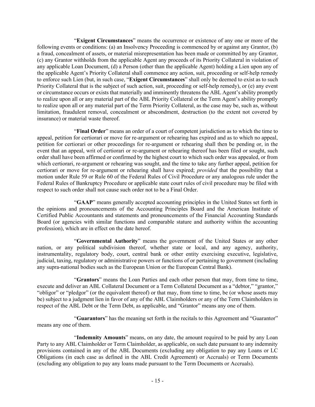 - 15 - “Exigent Circumstances” means the occurrence or existence of any one or more of the following events or conditions: (a) an Insolvency Proceeding is commenced by or against any Grantor, (b) a fraud, concealment of assets, or material misrepresentation has been made or committed by any Grantor, (c) any Grantor withholds from the applicable Agent any proceeds of its Priority Collateral in violation of any applicable Loan Document, (d) a Person (other than the applicable Agent) holding a Lien upon any of the applicable Agent’s Priority Collateral shall commence any action, suit, proceeding or self-help remedy to enforce such Lien (but, in such case, “Exigent Circumstances” shall only be deemed to exist as to such Priority Collateral that is the subject of such action, suit, proceeding or self-help remedy), or (e) any event or circumstance occurs or exists that materially and imminently threatens the ABL Agent’s ability promptly to realize upon all or any material part of the ABL Priority Collateral or the Term Agent’s ability promptly to realize upon all or any material part of the Term Priority Collateral, as the case may be, such as, without limitation, fraudulent removal, concealment or abscondment, destruction (to the extent not covered by insurance) or material waste thereof. “Final Order” means an order of a court of competent jurisdiction as to which the time to appeal, petition for certiorari or move for re-argument or rehearing has expired and as to which no appeal, petition for certiorari or other proceedings for re-argument or rehearing shall then be pending or, in the event that an appeal, writ of certiorari or re-argument or rehearing thereof has been filed or sought, such order shall have been affirmed or confirmed by the highest court to which such order was appealed, or from which certiorari, re-argument or rehearing was sought, and the time to take any further appeal, petition for certiorari or move for re-argument or rehearing shall have expired; provided that the possibility that a motion under Rule 59 or Rule 60 of the Federal Rules of Civil Procedure or any analogous rule under the Federal Rules of Bankruptcy Procedure or applicable state court rules of civil procedure may be filed with respect to such order shall not cause such order not to be a Final Order. “GAAP” means generally accepted accounting principles in the United States set forth in the opinions and pronouncements of the Accounting Principles Board and the American Institute of Certified Public Accountants and statements and pronouncements of the Financial Accounting Standards Board (or agencies with similar functions and comparable stature and authority within the accounting profession), which are in effect on the date hereof. “Governmental Authority” means the government of the United States or any other nation, or any political subdivision thereof, whether state or local, and any agency, authority, instrumentality, regulatory body, court, central bank or other entity exercising executive, legislative, judicial, taxing, regulatory or administrative powers or functions of or pertaining to government (including any supra-national bodies such as the European Union or the European Central Bank). “Grantors” means the Loan Parties and each other person that may, from time to time, execute and deliver an ABL Collateral Document or a Term Collateral Document as a “debtor,” “grantor,” “obligor” or “pledgor” (or the equivalent thereof) or that may, from time to time, be (or whose assets may be) subject to a judgment lien in favor of any of the ABL Claimholders or any of the Term Claimholders in respect of the ABL Debt or the Term Debt, as applicable, and “Grantor” means any one of them. “Guarantors” has the meaning set forth in the recitals to this Agreement and “Guarantor” means any one of them. “Indemnity Amounts” means, on any date, the amount required to be paid by any Loan Party to any ABL Claimholder or Term Claimholder, as applicable, on such date pursuant to any indemnity provisions contained in any of the ABL Documents (excluding any obligation to pay any Loans or LC Obligations (in each case as defined in the ABL Credit Agreement) or Accruals) or Term Documents (excluding any obligation to pay any loans made pursuant to the Term Documents or Accruals).