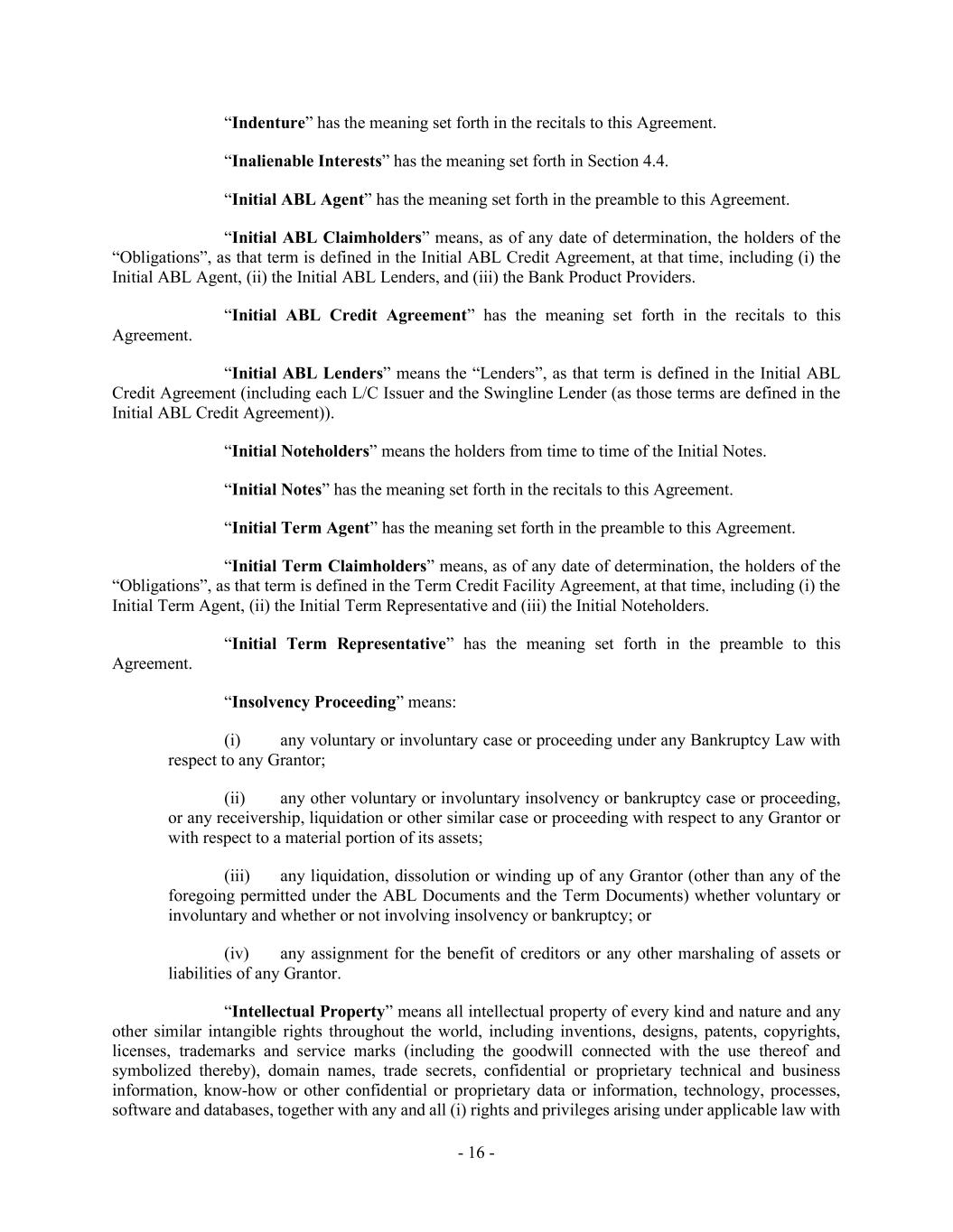 - 16 - “Indenture” has the meaning set forth in the recitals to this Agreement. “Inalienable Interests” has the meaning set forth in Section 4.4. “Initial ABL Agent” has the meaning set forth in the preamble to this Agreement. “Initial ABL Claimholders” means, as of any date of determination, the holders of the “Obligations”, as that term is defined in the Initial ABL Credit Agreement, at that time, including (i) the Initial ABL Agent, (ii) the Initial ABL Lenders, and (iii) the Bank Product Providers. “Initial ABL Credit Agreement” has the meaning set forth in the recitals to this Agreement. “Initial ABL Lenders” means the “Lenders”, as that term is defined in the Initial ABL Credit Agreement (including each L/C Issuer and the Swingline Lender (as those terms are defined in the Initial ABL Credit Agreement)). “Initial Noteholders” means the holders from time to time of the Initial Notes. “Initial Notes” has the meaning set forth in the recitals to this Agreement. “Initial Term Agent” has the meaning set forth in the preamble to this Agreement. “Initial Term Claimholders” means, as of any date of determination, the holders of the “Obligations”, as that term is defined in the Term Credit Facility Agreement, at that time, including (i) the Initial Term Agent, (ii) the Initial Term Representative and (iii) the Initial Noteholders. “Initial Term Representative” has the meaning set forth in the preamble to this Agreement. “Insolvency Proceeding” means: (i) any voluntary or involuntary case or proceeding under any Bankruptcy Law with respect to any Grantor; (ii) any other voluntary or involuntary insolvency or bankruptcy case or proceeding, or any receivership, liquidation or other similar case or proceeding with respect to any Grantor or with respect to a material portion of its assets; (iii) any liquidation, dissolution or winding up of any Grantor (other than any of the foregoing permitted under the ABL Documents and the Term Documents) whether voluntary or involuntary and whether or not involving insolvency or bankruptcy; or (iv) any assignment for the benefit of creditors or any other marshaling of assets or liabilities of any Grantor. “Intellectual Property” means all intellectual property of every kind and nature and any other similar intangible rights throughout the world, including inventions, designs, patents, copyrights, licenses, trademarks and service marks (including the goodwill connected with the use thereof and symbolized thereby), domain names, trade secrets, confidential or proprietary technical and business information, know-how or other confidential or proprietary data or information, technology, processes, software and databases, together with any and all (i) rights and privileges arising under applicable law with