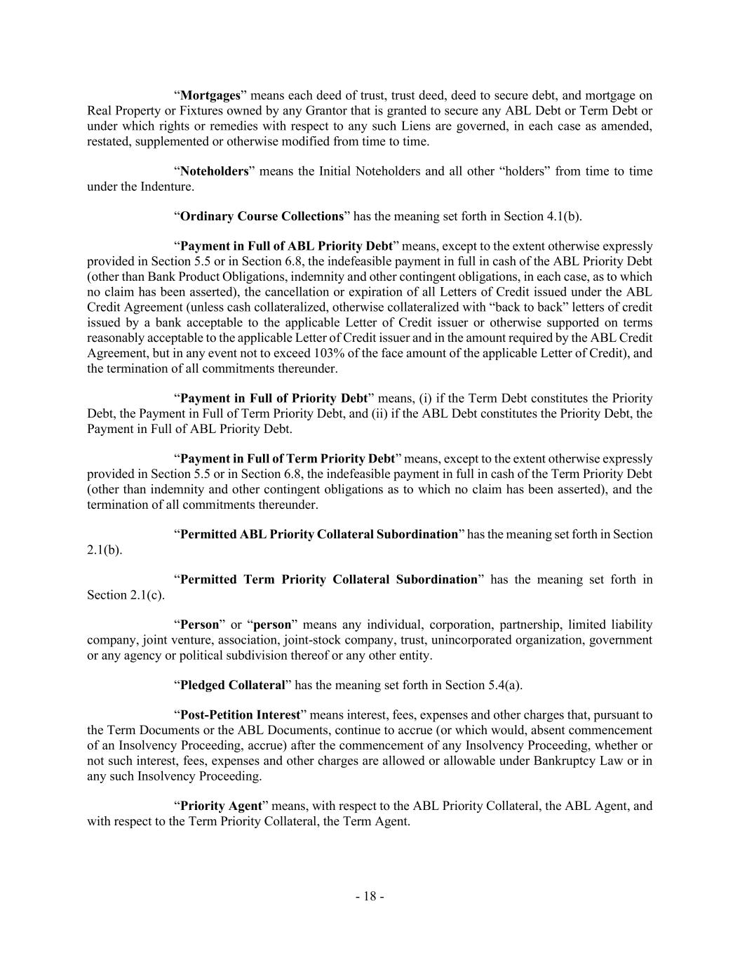 - 18 - “Mortgages” means each deed of trust, trust deed, deed to secure debt, and mortgage on Real Property or Fixtures owned by any Grantor that is granted to secure any ABL Debt or Term Debt or under which rights or remedies with respect to any such Liens are governed, in each case as amended, restated, supplemented or otherwise modified from time to time. “Noteholders” means the Initial Noteholders and all other “holders” from time to time under the Indenture. “Ordinary Course Collections” has the meaning set forth in Section 4.1(b). “Payment in Full of ABL Priority Debt” means, except to the extent otherwise expressly provided in Section 5.5 or in Section 6.8, the indefeasible payment in full in cash of the ABL Priority Debt (other than Bank Product Obligations, indemnity and other contingent obligations, in each case, as to which no claim has been asserted), the cancellation or expiration of all Letters of Credit issued under the ABL Credit Agreement (unless cash collateralized, otherwise collateralized with “back to back” letters of credit issued by a bank acceptable to the applicable Letter of Credit issuer or otherwise supported on terms reasonably acceptable to the applicable Letter of Credit issuer and in the amount required by the ABL Credit Agreement, but in any event not to exceed 103% of the face amount of the applicable Letter of Credit), and the termination of all commitments thereunder. “Payment in Full of Priority Debt” means, (i) if the Term Debt constitutes the Priority Debt, the Payment in Full of Term Priority Debt, and (ii) if the ABL Debt constitutes the Priority Debt, the Payment in Full of ABL Priority Debt. “Payment in Full of Term Priority Debt” means, except to the extent otherwise expressly provided in Section 5.5 or in Section 6.8, the indefeasible payment in full in cash of the Term Priority Debt (other than indemnity and other contingent obligations as to which no claim has been asserted), and the termination of all commitments thereunder. “Permitted ABL Priority Collateral Subordination” has the meaning set forth in Section 2.1(b). “Permitted Term Priority Collateral Subordination” has the meaning set forth in Section 2.1(c). “Person” or “person” means any individual, corporation, partnership, limited liability company, joint venture, association, joint-stock company, trust, unincorporated organization, government or any agency or political subdivision thereof or any other entity. “Pledged Collateral” has the meaning set forth in Section 5.4(a). “Post-Petition Interest” means interest, fees, expenses and other charges that, pursuant to the Term Documents or the ABL Documents, continue to accrue (or which would, absent commencement of an Insolvency Proceeding, accrue) after the commencement of any Insolvency Proceeding, whether or not such interest, fees, expenses and other charges are allowed or allowable under Bankruptcy Law or in any such Insolvency Proceeding. “Priority Agent” means, with respect to the ABL Priority Collateral, the ABL Agent, and with respect to the Term Priority Collateral, the Term Agent.