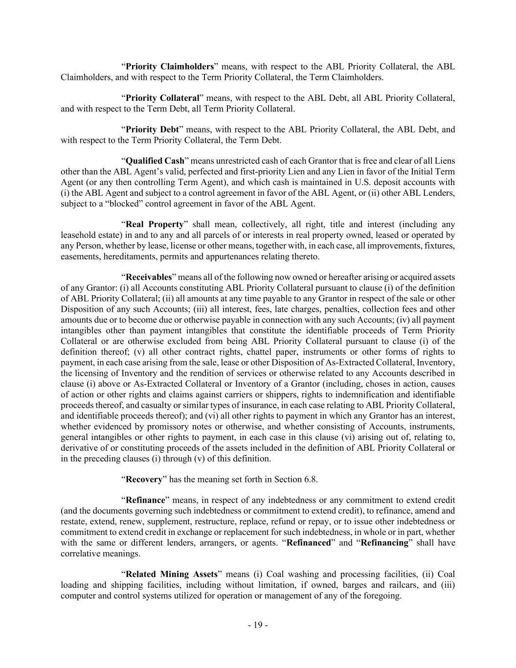 - 19 - “Priority Claimholders” means, with respect to the ABL Priority Collateral, the ABL Claimholders, and with respect to the Term Priority Collateral, the Term Claimholders. “Priority Collateral” means, with respect to the ABL Debt, all ABL Priority Collateral, and with respect to the Term Debt, all Term Priority Collateral. “Priority Debt” means, with respect to the ABL Priority Collateral, the ABL Debt, and with respect to the Term Priority Collateral, the Term Debt. “Qualified Cash” means unrestricted cash of each Grantor that is free and clear of all Liens other than the ABL Agent’s valid, perfected and first-priority Lien and any Lien in favor of the Initial Term Agent (or any then controlling Term Agent), and which cash is maintained in U.S. deposit accounts with (i) the ABL Agent and subject to a control agreement in favor of the ABL Agent, or (ii) other ABL Lenders, subject to a “blocked” control agreement in favor of the ABL Agent. “Real Property” shall mean, collectively, all right, title and interest (including any leasehold estate) in and to any and all parcels of or interests in real property owned, leased or operated by any Person, whether by lease, license or other means, together with, in each case, all improvements, fixtures, easements, hereditaments, permits and appurtenances relating thereto. “Receivables” means all of the following now owned or hereafter arising or acquired assets of any Grantor: (i) all Accounts constituting ABL Priority Collateral pursuant to clause (i) of the definition of ABL Priority Collateral; (ii) all amounts at any time payable to any Grantor in respect of the sale or other Disposition of any such Accounts; (iii) all interest, fees, late charges, penalties, collection fees and other amounts due or to become due or otherwise payable in connection with any such Accounts; (iv) all payment intangibles other than payment intangibles that constitute the identifiable proceeds of Term Priority Collateral or are otherwise excluded from being ABL Priority Collateral pursuant to clause (i) of the definition thereof; (v) all other contract rights, chattel paper, instruments or other forms of rights to payment, in each case arising from the sale, lease or other Disposition of As-Extracted Collateral, Inventory, the licensing of Inventory and the rendition of services or otherwise related to any Accounts described in clause (i) above or As-Extracted Collateral or Inventory of a Grantor (including, choses in action, causes of action or other rights and claims against carriers or shippers, rights to indemnification and identifiable proceeds thereof, and casualty or similar types of insurance, in each case relating to ABL Priority Collateral, and identifiable proceeds thereof); and (vi) all other rights to payment in which any Grantor has an interest, whether evidenced by promissory notes or otherwise, and whether consisting of Accounts, instruments, general intangibles or other rights to payment, in each case in this clause (vi) arising out of, relating to, derivative of or constituting proceeds of the assets included in the definition of ABL Priority Collateral or in the preceding clauses (i) through (v) of this definition. “Recovery” has the meaning set forth in Section 6.8. “Refinance” means, in respect of any indebtedness or any commitment to extend credit (and the documents governing such indebtedness or commitment to extend credit), to refinance, amend and restate, extend, renew, supplement, restructure, replace, refund or repay, or to issue other indebtedness or commitment to extend credit in exchange or replacement for such indebtedness, in whole or in part, whether with the same or different lenders, arrangers, or agents. “Refinanced” and “Refinancing” shall have correlative meanings. “Related Mining Assets” means (i) Coal washing and processing facilities, (ii) Coal loading and shipping facilities, including without limitation, if owned, barges and railcars, and (iii) computer and control systems utilized for operation or management of any of the foregoing.