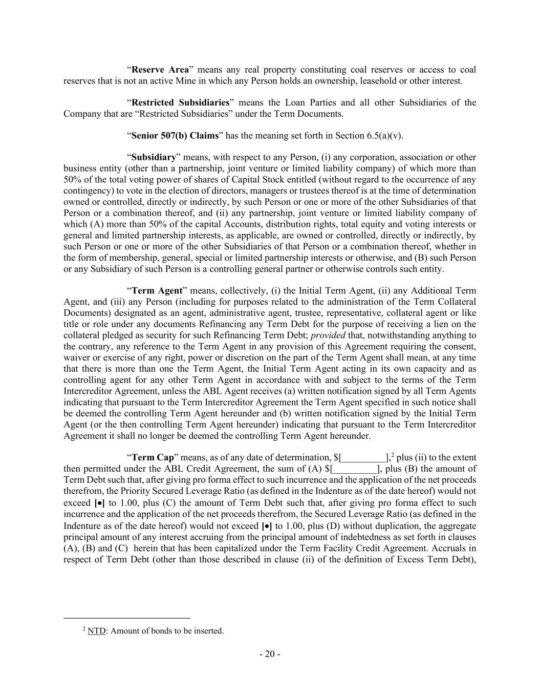 - 20 - “Reserve Area” means any real property constituting coal reserves or access to coal reserves that is not an active Mine in which any Person holds an ownership, leasehold or other interest. “Restricted Subsidiaries” means the Loan Parties and all other Subsidiaries of the Company that are “Restricted Subsidiaries” under the Term Documents. “Senior 507(b) Claims” has the meaning set forth in Section 6.5(a)(v). “Subsidiary” means, with respect to any Person, (i) any corporation, association or other business entity (other than a partnership, joint venture or limited liability company) of which more than 50% of the total voting power of shares of Capital Stock entitled (without regard to the occurrence of any contingency) to vote in the election of directors, managers or trustees thereof is at the time of determination owned or controlled, directly or indirectly, by such Person or one or more of the other Subsidiaries of that Person or a combination thereof, and (ii) any partnership, joint venture or limited liability company of which (A) more than 50% of the capital Accounts, distribution rights, total equity and voting interests or general and limited partnership interests, as applicable, are owned or controlled, directly or indirectly, by such Person or one or more of the other Subsidiaries of that Person or a combination thereof, whether in the form of membership, general, special or limited partnership interests or otherwise, and (B) such Person or any Subsidiary of such Person is a controlling general partner or otherwise controls such entity. “Term Agent” means, collectively, (i) the Initial Term Agent, (ii) any Additional Term Agent, and (iii) any Person (including for purposes related to the administration of the Term Collateral Documents) designated as an agent, administrative agent, trustee, representative, collateral agent or like title or role under any documents Refinancing any Term Debt for the purpose of receiving a lien on the collateral pledged as security for such Refinancing Term Debt; provided that, notwithstanding anything to the contrary, any reference to the Term Agent in any provision of this Agreement requiring the consent, waiver or exercise of any right, power or discretion on the part of the Term Agent shall mean, at any time that there is more than one the Term Agent, the Initial Term Agent acting in its own capacity and as controlling agent for any other Term Agent in accordance with and subject to the terms of the Term Intercreditor Agreement, unless the ABL Agent receives (a) written notification signed by all Term Agents indicating that pursuant to the Term Intercreditor Agreement the Term Agent specified in such notice shall be deemed the controlling Term Agent hereunder and (b) written notification signed by the Initial Term Agent (or the then controlling Term Agent hereunder) indicating that pursuant to the Term Intercreditor Agreement it shall no longer be deemed the controlling Term Agent hereunder. “Term Cap” means, as of any date of determination, $[_________],2 plus (ii) to the extent then permitted under the ABL Credit Agreement, the sum of (A) $[_________], plus (B) the amount of Term Debt such that, after giving pro forma effect to such incurrence and the application of the net proceeds therefrom, the Priority Secured Leverage Ratio (as defined in the Indenture as of the date hereof) would not exceed [] to 1.00, plus (C) the amount of Term Debt such that, after giving pro forma effect to such incurrence and the application of the net proceeds therefrom, the Secured Leverage Ratio (as defined in the Indenture as of the date hereof) would not exceed [] to 1.00, plus (D) without duplication, the aggregate principal amount of any interest accruing from the principal amount of indebtedness as set forth in clauses (A), (B) and (C) herein that has been capitalized under the Term Facility Credit Agreement. Accruals in respect of Term Debt (other than those described in clause (ii) of the definition of Excess Term Debt), 2 NTD: Amount of bonds to be inserted.