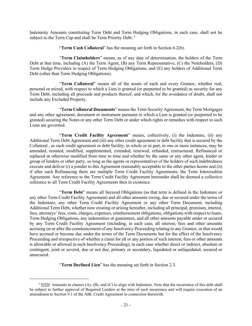 - 21 - Indemnity Amounts constituting Term Debt and Term Hedging Obligations, in each case, shall not be subject to the Term Cap and shall be Term Priority Debt. 3 “Term Cash Collateral” has the meaning set forth in Section 6.2(b). “Term Claimholders” means, as of any date of determination, the holders of the Term Debt at that time, including (A) the Term Agent, (B) any Term Representative, (C) the Noteholders, (D) Term Hedge Providers in respect of Term Hedging Obligations, and (E) any holders of Additional Term Debt (other than Term Hedging Obligations). “Term Collateral” means all of the assets of each and every Grantor, whether real, personal or mixed, with respect to which a Lien is granted (or purported to be granted) as security for any Term Debt, including all proceeds and products thereof, and which, for the avoidance of doubt, shall not include any Excluded Property. “Term Collateral Documents” means the Term Security Agreement, the Term Mortgages and any other agreement, document or instrument pursuant to which a Lien is granted (or purported to be granted) securing the Notes or any other Term Debt or under which rights or remedies with respect to such Liens are governed. “Term Credit Facility Agreement” means, collectively, (i) the Indenture, (ii) any Additional Term Debt Agreement and (iii) any other credit agreement or debt facility that is secured by the Collateral , as such credit agreement or debt facility, in whole or in part, in one or more instances, may be amended, restated, modified, supplemented, extended, renewed, refunded, restructured, Refinanced or replaced or otherwise modified from time to time and whether by the same or any other agent, lender or group of lenders or other party, so long as the agents or representatives of the holders of such indebtedness execute and deliver (i) a joinder to this Agreement reasonably acceptable to the other parties hereto and (ii) if after such Refinancing there are multiple Term Credit Facility Agreements, the Term Intercreditor Agreement. Any reference to the Term Credit Facility Agreement hereunder shall be deemed a collective reference to all Term Credit Facility Agreements then in existence. “Term Debt” means all Secured Obligations (as that term is defined in the Indenture or any other Term Credit Facility Agreement) and all other amounts owing, due or secured under the terms of the Indenture, any other Term Credit Facility Agreement or any other Term Document, including Additional Term Debt, whether now existing or arising hereafter, including all principal, premium, interest, fees, attorneys’ fees, costs, charges, expenses, reimbursement obligations, obligations with respect to loans, Term Hedging Obligations, any indemnities or guarantees, and all other amounts payable under or secured by any Term Credit Facility Agreement (including, in each case, all interest, fees and other amounts accruing on or after the commencement of any Insolvency Proceeding relating to any Grantor, or that would have accrued or become due under the terms of the Term Documents but for the effect of the Insolvency Proceeding and irrespective of whether a claim for all or any portion of such interest, fees or other amounts is allowable or allowed in such Insolvency Proceeding), in each case whether direct or indirect, absolute or contingent, joint or several, due or not due, primary or secondary, liquidated or unliquidated, secured or unsecured. “Term Declined Lien” has the meaning set forth in Section 2.3. 3 NTD: Amounts in clauses (A), (B), and (C) to align with Indenture. Note that the incurrence of this debt shall be subject to further approval of Required Lenders at the time of such incurrence and will require execution of an amendment to Section 9.1 of the ABL Credit Agreement in connection therewith.