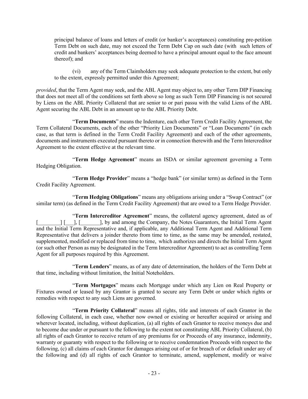 - 23 - principal balance of loans and letters of credit (or banker’s acceptances) constituting pre-petition Term Debt on such date, may not exceed the Term Debt Cap on such date (with such letters of credit and bankers’ acceptances being deemed to have a principal amount equal to the face amount thereof); and (vi) any of the Term Claimholders may seek adequate protection to the extent, but only to the extent, expressly permitted under this Agreement; provided, that the Term Agent may seek, and the ABL Agent may object to, any other Term DIP Financing that does not meet all of the conditions set forth above so long as such Term DIP Financing is not secured by Liens on the ABL Priority Collateral that are senior to or pari passu with the valid Liens of the ABL Agent securing the ABL Debt in an amount up to the ABL Priority Debt. “Term Documents” means the Indenture, each other Term Credit Facility Agreement, the Term Collateral Documents, each of the other “Priority Lien Documents” or “Loan Documents” (in each case, as that term is defined in the Term Credit Facility Agreement) and each of the other agreements, documents and instruments executed pursuant thereto or in connection therewith and the Term Intercreditor Agreement to the extent effective at the relevant time. “Term Hedge Agreement” means an ISDA or similar agreement governing a Term Hedging Obligation. “Term Hedge Provider” means a “hedge bank” (or similar term) as defined in the Term Credit Facility Agreement. “Term Hedging Obligations” means any obligations arising under a “Swap Contract” (or similar term) (as defined in the Term Credit Facility Agreement) that are owed to a Term Hedge Provider. “Term Intercreditor Agreement” means, the collateral agency agreement, dated as of [________] [___], [_______], by and among the Company, the Notes Guarantors, the Initial Term Agent and the Initial Term Representative and, if applicable, any Additional Term Agent and Additional Term Representative that delivers a joinder thereto from time to time, as the same may be amended, restated, supplemented, modified or replaced from time to time, which authorizes and directs the Initial Term Agent (or such other Person as may be designated in the Term Intercreditor Agreement) to act as controlling Term Agent for all purposes required by this Agreement. “Term Lenders” means, as of any date of determination, the holders of the Term Debt at that time, including without limitation, the Initial Noteholders. “Term Mortgages” means each Mortgage under which any Lien on Real Property or Fixtures owned or leased by any Grantor is granted to secure any Term Debt or under which rights or remedies with respect to any such Liens are governed. “Term Priority Collateral” means all rights, title and interests of each Grantor in the following Collateral, in each case, whether now owned or existing or hereafter acquired or arising and wherever located, including, without duplication, (a) all rights of each Grantor to receive moneys due and to become due under or pursuant to the following to the extent not constituting ABL Priority Collateral, (b) all rights of each Grantor to receive return of any premiums for or Proceeds of any insurance, indemnity, warranty or guaranty with respect to the following or to receive condemnation Proceeds with respect to the following, (c) all claims of each Grantor for damages arising out of or for breach of or default under any of the following and (d) all rights of each Grantor to terminate, amend, supplement, modify or waive