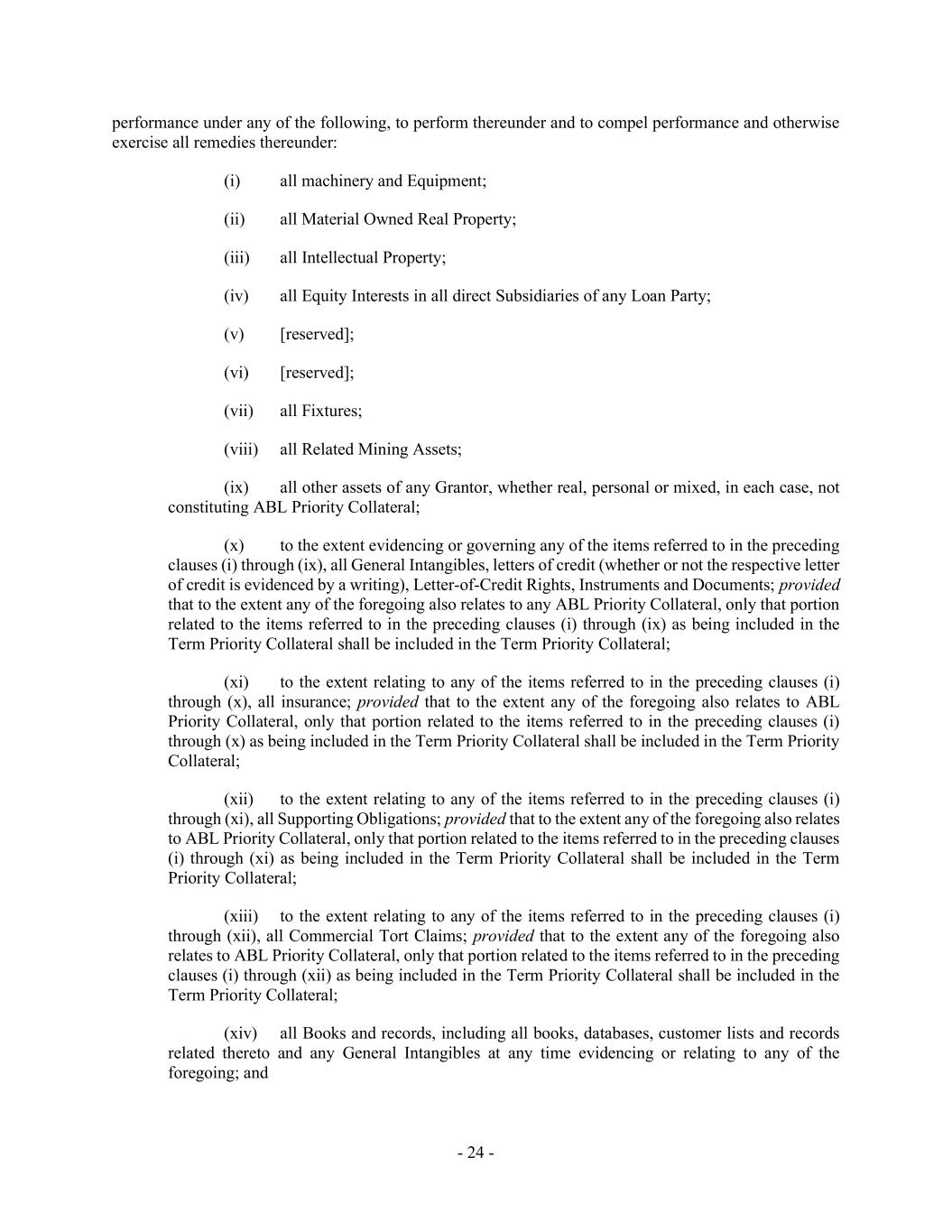 - 24 - performance under any of the following, to perform thereunder and to compel performance and otherwise exercise all remedies thereunder: (i) all machinery and Equipment; (ii) all Material Owned Real Property; (iii) all Intellectual Property; (iv) all Equity Interests in all direct Subsidiaries of any Loan Party; (v) [reserved]; (vi) [reserved]; (vii) all Fixtures; (viii) all Related Mining Assets; (ix) all other assets of any Grantor, whether real, personal or mixed, in each case, not constituting ABL Priority Collateral; (x) to the extent evidencing or governing any of the items referred to in the preceding clauses (i) through (ix), all General Intangibles, letters of credit (whether or not the respective letter of credit is evidenced by a writing), Letter-of-Credit Rights, Instruments and Documents; provided that to the extent any of the foregoing also relates to any ABL Priority Collateral, only that portion related to the items referred to in the preceding clauses (i) through (ix) as being included in the Term Priority Collateral shall be included in the Term Priority Collateral; (xi) to the extent relating to any of the items referred to in the preceding clauses (i) through (x), all insurance; provided that to the extent any of the foregoing also relates to ABL Priority Collateral, only that portion related to the items referred to in the preceding clauses (i) through (x) as being included in the Term Priority Collateral shall be included in the Term Priority Collateral; (xii) to the extent relating to any of the items referred to in the preceding clauses (i) through (xi), all Supporting Obligations; provided that to the extent any of the foregoing also relates to ABL Priority Collateral, only that portion related to the items referred to in the preceding clauses (i) through (xi) as being included in the Term Priority Collateral shall be included in the Term Priority Collateral; (xiii) to the extent relating to any of the items referred to in the preceding clauses (i) through (xii), all Commercial Tort Claims; provided that to the extent any of the foregoing also relates to ABL Priority Collateral, only that portion related to the items referred to in the preceding clauses (i) through (xii) as being included in the Term Priority Collateral shall be included in the Term Priority Collateral; (xiv) all Books and records, including all books, databases, customer lists and records related thereto and any General Intangibles at any time evidencing or relating to any of the foregoing; and