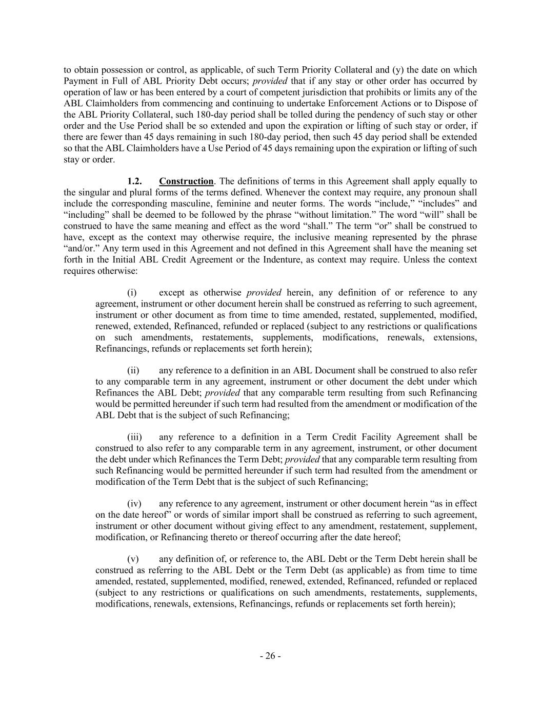 - 26 - to obtain possession or control, as applicable, of such Term Priority Collateral and (y) the date on which Payment in Full of ABL Priority Debt occurs; provided that if any stay or other order has occurred by operation of law or has been entered by a court of competent jurisdiction that prohibits or limits any of the ABL Claimholders from commencing and continuing to undertake Enforcement Actions or to Dispose of the ABL Priority Collateral, such 180-day period shall be tolled during the pendency of such stay or other order and the Use Period shall be so extended and upon the expiration or lifting of such stay or order, if there are fewer than 45 days remaining in such 180-day period, then such 45 day period shall be extended so that the ABL Claimholders have a Use Period of 45 days remaining upon the expiration or lifting of such stay or order. 1.2. Construction. The definitions of terms in this Agreement shall apply equally to the singular and plural forms of the terms defined. Whenever the context may require, any pronoun shall include the corresponding masculine, feminine and neuter forms. The words “include,” “includes” and “including” shall be deemed to be followed by the phrase “without limitation.” The word “will” shall be construed to have the same meaning and effect as the word “shall.” The term “or” shall be construed to have, except as the context may otherwise require, the inclusive meaning represented by the phrase “and/or.” Any term used in this Agreement and not defined in this Agreement shall have the meaning set forth in the Initial ABL Credit Agreement or the Indenture, as context may require. Unless the context requires otherwise: (i) except as otherwise provided herein, any definition of or reference to any agreement, instrument or other document herein shall be construed as referring to such agreement, instrument or other document as from time to time amended, restated, supplemented, modified, renewed, extended, Refinanced, refunded or replaced (subject to any restrictions or qualifications on such amendments, restatements, supplements, modifications, renewals, extensions, Refinancings, refunds or replacements set forth herein); (ii) any reference to a definition in an ABL Document shall be construed to also refer to any comparable term in any agreement, instrument or other document the debt under which Refinances the ABL Debt; provided that any comparable term resulting from such Refinancing would be permitted hereunder if such term had resulted from the amendment or modification of the ABL Debt that is the subject of such Refinancing; (iii) any reference to a definition in a Term Credit Facility Agreement shall be construed to also refer to any comparable term in any agreement, instrument, or other document the debt under which Refinances the Term Debt; provided that any comparable term resulting from such Refinancing would be permitted hereunder if such term had resulted from the amendment or modification of the Term Debt that is the subject of such Refinancing; (iv) any reference to any agreement, instrument or other document herein “as in effect on the date hereof” or words of similar import shall be construed as referring to such agreement, instrument or other document without giving effect to any amendment, restatement, supplement, modification, or Refinancing thereto or thereof occurring after the date hereof; (v) any definition of, or reference to, the ABL Debt or the Term Debt herein shall be construed as referring to the ABL Debt or the Term Debt (as applicable) as from time to time amended, restated, supplemented, modified, renewed, extended, Refinanced, refunded or replaced (subject to any restrictions or qualifications on such amendments, restatements, supplements, modifications, renewals, extensions, Refinancings, refunds or replacements set forth herein);