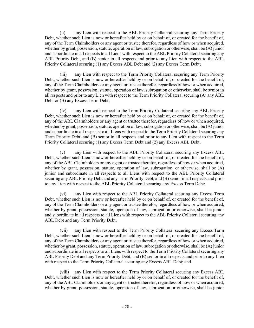 - 28 - (ii) any Lien with respect to the ABL Priority Collateral securing any Term Priority Debt, whether such Lien is now or hereafter held by or on behalf of, or created for the benefit of, any of the Term Claimholders or any agent or trustee therefor, regardless of how or when acquired, whether by grant, possession, statute, operation of law, subrogation or otherwise, shall be (A) junior and subordinate in all respects to all Liens with respect to the ABL Priority Collateral securing any ABL Priority Debt, and (B) senior in all respects and prior to any Lien with respect to the ABL Priority Collateral securing (1) any Excess ABL Debt and (2) any Excess Term Debt; (iii) any Lien with respect to the Term Priority Collateral securing any Term Priority Debt, whether such Lien is now or hereafter held by or on behalf of, or created for the benefit of, any of the Term Claimholders or any agent or trustee therefor, regardless of how or when acquired, whether by grant, possession, statute, operation of law, subrogation or otherwise, shall be senior in all respects and prior to any Lien with respect to the Term Priority Collateral securing (A) any ABL Debt or (B) any Excess Term Debt; (iv) any Lien with respect to the Term Priority Collateral securing any ABL Priority Debt, whether such Lien is now or hereafter held by or on behalf of, or created for the benefit of, any of the ABL Claimholders or any agent or trustee therefor, regardless of how or when acquired, whether by grant, possession, statute, operation of law, subrogation or otherwise, shall be (A) junior and subordinate in all respects to all Liens with respect to the Term Priority Collateral securing any Term Priority Debt, and (B) senior in all respects and prior to any Lien with respect to the Term Priority Collateral securing (1) any Excess Term Debt and (2) any Excess ABL Debt; (v) any Lien with respect to the ABL Priority Collateral securing any Excess ABL Debt, whether such Lien is now or hereafter held by or on behalf of, or created for the benefit of, any of the ABL Claimholders or any agent or trustee therefor, regardless of how or when acquired, whether by grant, possession, statute, operation of law, subrogation, or otherwise, shall be (A) junior and subordinate in all respects to all Liens with respect to the ABL Priority Collateral securing any ABL Priority Debt and any Term Priority Debt, and (B) senior in all respects and prior to any Lien with respect to the ABL Priority Collateral securing any Excess Term Debt; (vi) any Lien with respect to the ABL Priority Collateral securing any Excess Term Debt, whether such Lien is now or hereafter held by or on behalf of, or created for the benefit of, any of the Term Claimholders or any agent or trustee therefor, regardless of how or when acquired, whether by grant, possession, statute, operation of law, subrogation or otherwise, shall be junior and subordinate in all respects to all Liens with respect to the ABL Priority Collateral securing any ABL Debt and any Term Priority Debt; (vii) any Lien with respect to the Term Priority Collateral securing any Excess Term Debt, whether such Lien is now or hereafter held by or on behalf of, or created for the benefit of, any of the Term Claimholders or any agent or trustee therefor, regardless of how or when acquired, whether by grant, possession, statute, operation of law, subrogation or otherwise, shall be (A) junior and subordinate in all respects to all Liens with respect to the Term Priority Collateral securing any ABL Priority Debt and any Term Priority Debt, and (B) senior in all respects and prior to any Lien with respect to the Term Priority Collateral securing any Excess ABL Debt; and (viii) any Lien with respect to the Term Priority Collateral securing any Excess ABL Debt, whether such Lien is now or hereafter held by or on behalf of, or created for the benefit of, any of the ABL Claimholders or any agent or trustee therefor, regardless of how or when acquired, whether by grant, possession, statute, operation of law, subrogation or otherwise, shall be junior