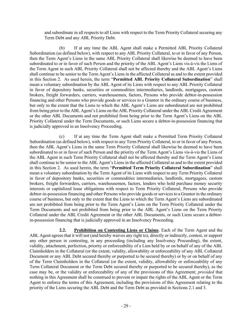 - 29 - and subordinate in all respects to all Liens with respect to the Term Priority Collateral securing any Term Debt and any ABL Priority Debt. (b) If at any time the ABL Agent shall make a Permitted ABL Priority Collateral Subordination (as defined below), with respect to any ABL Priority Collateral, to or in favor of any Person, then the Term Agent’s Liens in the same ABL Priority Collateral shall likewise be deemed to have been subordinated to or in favor of such Person and the priority of the ABL Agent’s Liens vis-à-vis the Liens of the Term Agent in such ABL Priority Collateral shall not be affected thereby and the ABL Agent’s Liens shall continue to be senior to the Term Agent’s Liens in the affected Collateral as and to the extent provided in this Section 2. As used herein, the term “Permitted ABL Priority Collateral Subordination” shall mean a voluntary subordination by the ABL Agent of its Liens with respect to any ABL Priority Collateral in favor of depository banks, securities or commodities intermediaries, landlords, mortgagees, custom brokers, freight forwarders, carriers, warehousemen, factors, Persons who provide debtor-in-possession financing and other Persons who provide goods or services to a Grantor in the ordinary course of business, but only to the extent that the Liens to which the ABL Agent’s Liens are subordinated are not prohibited from being prior to the ABL Agent’s Liens on the ABL Priority Collateral under the ABL Credit Agreement or the other ABL Documents and not prohibited from being prior to the Term Agent’s Liens on the ABL Priority Collateral under the Term Documents, or such Liens secure a debtor-in-possession financing that is judicially approved in an Insolvency Proceeding. (c) If at any time the Term Agent shall make a Permitted Term Priority Collateral Subordination (as defined below), with respect to any Term Priority Collateral, to or in favor of any Person, then the ABL Agent’s Liens in the same Term Priority Collateral shall likewise be deemed to have been subordinated to or in favor of such Person and the priority of the Term Agent’s Liens vis-à-vis the Liens of the ABL Agent in such Term Priority Collateral shall not be affected thereby and the Term Agent’s Liens shall continue to be senior to the ABL Agent’s Liens in the affected Collateral as and to the extent provided in this Section 2. As used herein, the term “Permitted Term Priority Collateral Subordination” shall mean a voluntary subordination by the Term Agent of its Liens with respect to any Term Priority Collateral in favor of depository banks, securities or commodities intermediaries, landlords, mortgagees, custom brokers, freight forwarders, carriers, warehousemen, factors, lenders who hold purchase money security interests or capitalized lease obligations with respect to Term Priority Collateral, Persons who provide debtor-in-possession financing and other Persons who provide goods or services to a Grantor in the ordinary course of business, but only to the extent that the Liens to which the Term Agent’s Liens are subordinated are not prohibited from being prior to the Term Agent’s Liens on the Term Priority Collateral under the Term Documents and not prohibited from being prior to the ABL Agent’s Liens on the Term Priority Collateral under the ABL Credit Agreement or the other ABL Documents, or such Liens secure a debtor- in-possession financing that is judicially approved in an Insolvency Proceeding. 2.2. Prohibition on Contesting Liens or Claims. Each of the Term Agent and the ABL Agent agrees that it will not (and hereby waives any right to), directly or indirectly, contest, or support any other person in contesting, in any proceeding (including any Insolvency Proceeding), the extent, validity, attachment, perfection, priority or enforceability of a Lien held by or on behalf of any of the ABL Claimholders in the Collateral (or the extent, validity, allowability or enforceability of any ABL Collateral Document or any ABL Debt secured thereby or purported to be secured thereby) or by or on behalf of any of the Term Claimholders in the Collateral (or the extent, validity, allowability or enforceability of any Term Collateral Document or the Term Debt secured thereby or purported to be secured thereby), as the case may be, or the validity or enforceability of any of the provisions of this Agreement; provided that nothing in this Agreement shall be construed to prevent or impair the rights of the ABL Agent or the Term Agent to enforce the terms of this Agreement, including the provisions of this Agreement relating to the priority of the Liens securing the ABL Debt and the Term Debt as provided in Sections 2.1 and 3.
