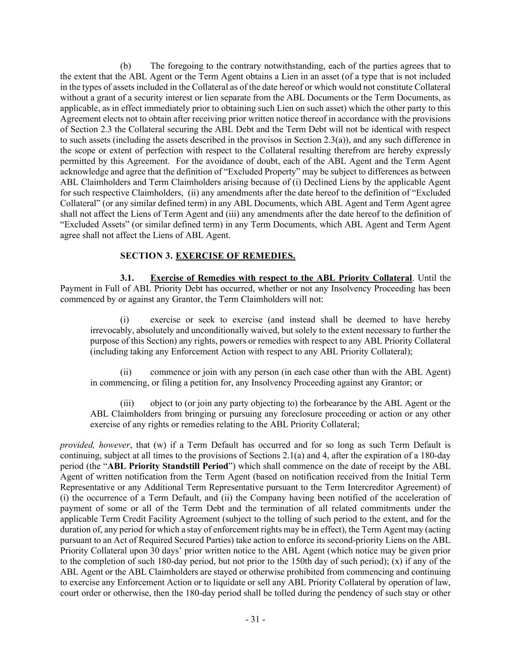 - 31 - (b) The foregoing to the contrary notwithstanding, each of the parties agrees that to the extent that the ABL Agent or the Term Agent obtains a Lien in an asset (of a type that is not included in the types of assets included in the Collateral as of the date hereof or which would not constitute Collateral without a grant of a security interest or lien separate from the ABL Documents or the Term Documents, as applicable, as in effect immediately prior to obtaining such Lien on such asset) which the other party to this Agreement elects not to obtain after receiving prior written notice thereof in accordance with the provisions of Section 2.3 the Collateral securing the ABL Debt and the Term Debt will not be identical with respect to such assets (including the assets described in the provisos in Section 2.3(a)), and any such difference in the scope or extent of perfection with respect to the Collateral resulting therefrom are hereby expressly permitted by this Agreement. For the avoidance of doubt, each of the ABL Agent and the Term Agent acknowledge and agree that the definition of “Excluded Property” may be subject to differences as between ABL Claimholders and Term Claimholders arising because of (i) Declined Liens by the applicable Agent for such respective Claimholders, (ii) any amendments after the date hereof to the definition of “Excluded Collateral” (or any similar defined term) in any ABL Documents, which ABL Agent and Term Agent agree shall not affect the Liens of Term Agent and (iii) any amendments after the date hereof to the definition of “Excluded Assets” (or similar defined term) in any Term Documents, which ABL Agent and Term Agent agree shall not affect the Liens of ABL Agent. SECTION 3. EXERCISE OF REMEDIES. 3.1. Exercise of Remedies with respect to the ABL Priority Collateral. Until the Payment in Full of ABL Priority Debt has occurred, whether or not any Insolvency Proceeding has been commenced by or against any Grantor, the Term Claimholders will not: (i) exercise or seek to exercise (and instead shall be deemed to have hereby irrevocably, absolutely and unconditionally waived, but solely to the extent necessary to further the purpose of this Section) any rights, powers or remedies with respect to any ABL Priority Collateral (including taking any Enforcement Action with respect to any ABL Priority Collateral); (ii) commence or join with any person (in each case other than with the ABL Agent) in commencing, or filing a petition for, any Insolvency Proceeding against any Grantor; or (iii) object to (or join any party objecting to) the forbearance by the ABL Agent or the ABL Claimholders from bringing or pursuing any foreclosure proceeding or action or any other exercise of any rights or remedies relating to the ABL Priority Collateral; provided, however, that (w) if a Term Default has occurred and for so long as such Term Default is continuing, subject at all times to the provisions of Sections 2.1(a) and 4, after the expiration of a 180-day period (the “ABL Priority Standstill Period”) which shall commence on the date of receipt by the ABL Agent of written notification from the Term Agent (based on notification received from the Initial Term Representative or any Additional Term Representative pursuant to the Term Intercreditor Agreement) of (i) the occurrence of a Term Default, and (ii) the Company having been notified of the acceleration of payment of some or all of the Term Debt and the termination of all related commitments under the applicable Term Credit Facility Agreement (subject to the tolling of such period to the extent, and for the duration of, any period for which a stay of enforcement rights may be in effect), the Term Agent may (acting pursuant to an Act of Required Secured Parties) take action to enforce its second-priority Liens on the ABL Priority Collateral upon 30 days’ prior written notice to the ABL Agent (which notice may be given prior to the completion of such 180-day period, but not prior to the 150th day of such period); (x) if any of the ABL Agent or the ABL Claimholders are stayed or otherwise prohibited from commencing and continuing to exercise any Enforcement Action or to liquidate or sell any ABL Priority Collateral by operation of law, court order or otherwise, then the 180-day period shall be tolled during the pendency of such stay or other