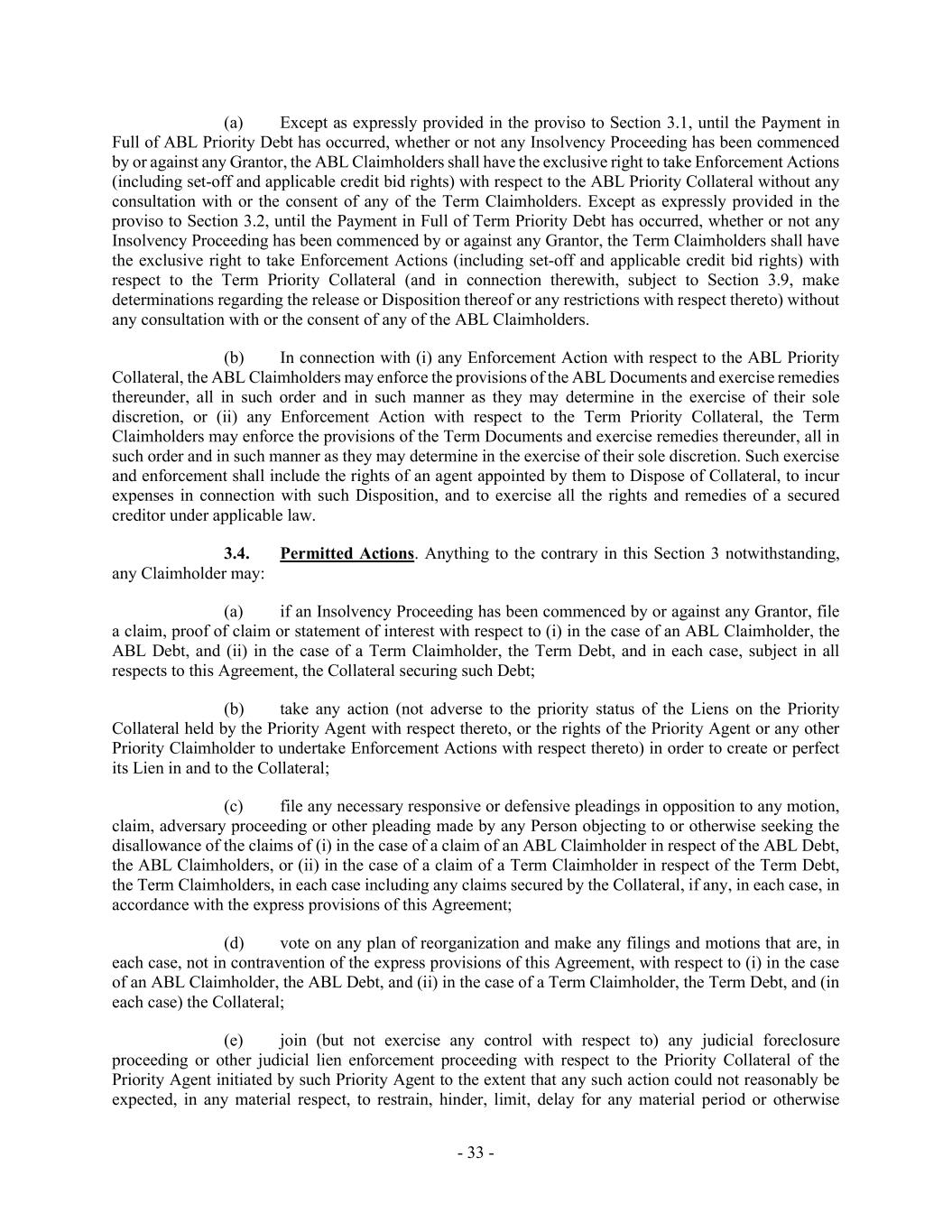 - 33 - (a) Except as expressly provided in the proviso to Section 3.1, until the Payment in Full of ABL Priority Debt has occurred, whether or not any Insolvency Proceeding has been commenced by or against any Grantor, the ABL Claimholders shall have the exclusive right to take Enforcement Actions (including set-off and applicable credit bid rights) with respect to the ABL Priority Collateral without any consultation with or the consent of any of the Term Claimholders. Except as expressly provided in the proviso to Section 3.2, until the Payment in Full of Term Priority Debt has occurred, whether or not any Insolvency Proceeding has been commenced by or against any Grantor, the Term Claimholders shall have the exclusive right to take Enforcement Actions (including set-off and applicable credit bid rights) with respect to the Term Priority Collateral (and in connection therewith, subject to Section 3.9, make determinations regarding the release or Disposition thereof or any restrictions with respect thereto) without any consultation with or the consent of any of the ABL Claimholders. (b) In connection with (i) any Enforcement Action with respect to the ABL Priority Collateral, the ABL Claimholders may enforce the provisions of the ABL Documents and exercise remedies thereunder, all in such order and in such manner as they may determine in the exercise of their sole discretion, or (ii) any Enforcement Action with respect to the Term Priority Collateral, the Term Claimholders may enforce the provisions of the Term Documents and exercise remedies thereunder, all in such order and in such manner as they may determine in the exercise of their sole discretion. Such exercise and enforcement shall include the rights of an agent appointed by them to Dispose of Collateral, to incur expenses in connection with such Disposition, and to exercise all the rights and remedies of a secured creditor under applicable law. 3.4. Permitted Actions. Anything to the contrary in this Section 3 notwithstanding, any Claimholder may: (a) if an Insolvency Proceeding has been commenced by or against any Grantor, file a claim, proof of claim or statement of interest with respect to (i) in the case of an ABL Claimholder, the ABL Debt, and (ii) in the case of a Term Claimholder, the Term Debt, and in each case, subject in all respects to this Agreement, the Collateral securing such Debt; (b) take any action (not adverse to the priority status of the Liens on the Priority Collateral held by the Priority Agent with respect thereto, or the rights of the Priority Agent or any other Priority Claimholder to undertake Enforcement Actions with respect thereto) in order to create or perfect its Lien in and to the Collateral; (c) file any necessary responsive or defensive pleadings in opposition to any motion, claim, adversary proceeding or other pleading made by any Person objecting to or otherwise seeking the disallowance of the claims of (i) in the case of a claim of an ABL Claimholder in respect of the ABL Debt, the ABL Claimholders, or (ii) in the case of a claim of a Term Claimholder in respect of the Term Debt, the Term Claimholders, in each case including any claims secured by the Collateral, if any, in each case, in accordance with the express provisions of this Agreement; (d) vote on any plan of reorganization and make any filings and motions that are, in each case, not in contravention of the express provisions of this Agreement, with respect to (i) in the case of an ABL Claimholder, the ABL Debt, and (ii) in the case of a Term Claimholder, the Term Debt, and (in each case) the Collateral; (e) join (but not exercise any control with respect to) any judicial foreclosure proceeding or other judicial lien enforcement proceeding with respect to the Priority Collateral of the Priority Agent initiated by such Priority Agent to the extent that any such action could not reasonably be expected, in any material respect, to restrain, hinder, limit, delay for any material period or otherwise