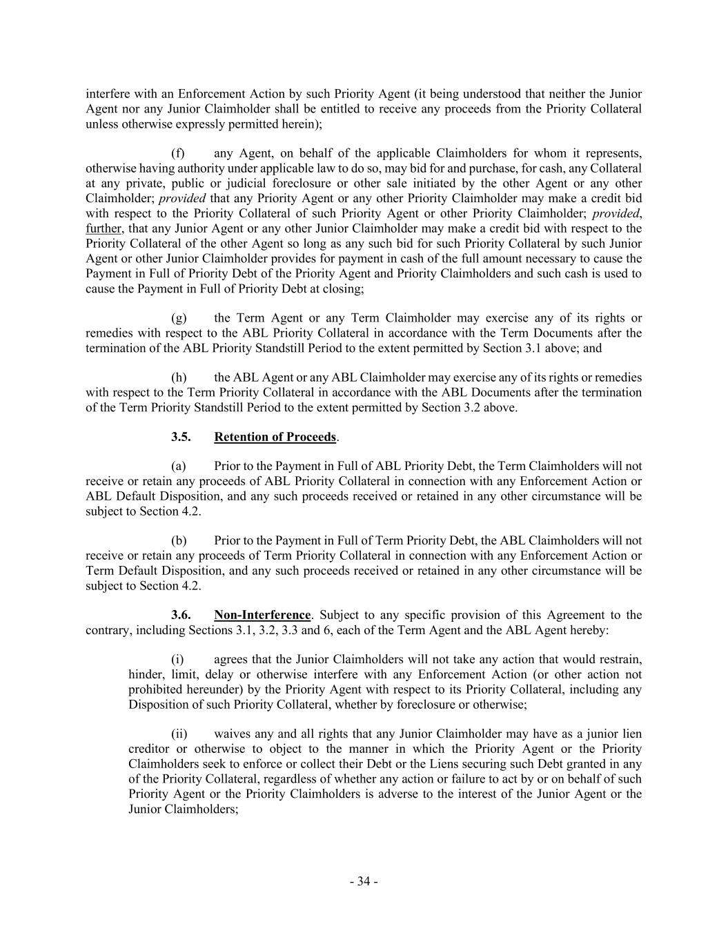 - 34 - interfere with an Enforcement Action by such Priority Agent (it being understood that neither the Junior Agent nor any Junior Claimholder shall be entitled to receive any proceeds from the Priority Collateral unless otherwise expressly permitted herein); (f) any Agent, on behalf of the applicable Claimholders for whom it represents, otherwise having authority under applicable law to do so, may bid for and purchase, for cash, any Collateral at any private, public or judicial foreclosure or other sale initiated by the other Agent or any other Claimholder; provided that any Priority Agent or any other Priority Claimholder may make a credit bid with respect to the Priority Collateral of such Priority Agent or other Priority Claimholder; provided, further, that any Junior Agent or any other Junior Claimholder may make a credit bid with respect to the Priority Collateral of the other Agent so long as any such bid for such Priority Collateral by such Junior Agent or other Junior Claimholder provides for payment in cash of the full amount necessary to cause the Payment in Full of Priority Debt of the Priority Agent and Priority Claimholders and such cash is used to cause the Payment in Full of Priority Debt at closing; (g) the Term Agent or any Term Claimholder may exercise any of its rights or remedies with respect to the ABL Priority Collateral in accordance with the Term Documents after the termination of the ABL Priority Standstill Period to the extent permitted by Section 3.1 above; and (h) the ABL Agent or any ABL Claimholder may exercise any of its rights or remedies with respect to the Term Priority Collateral in accordance with the ABL Documents after the termination of the Term Priority Standstill Period to the extent permitted by Section 3.2 above. 3.5. Retention of Proceeds. (a) Prior to the Payment in Full of ABL Priority Debt, the Term Claimholders will not receive or retain any proceeds of ABL Priority Collateral in connection with any Enforcement Action or ABL Default Disposition, and any such proceeds received or retained in any other circumstance will be subject to Section 4.2. (b) Prior to the Payment in Full of Term Priority Debt, the ABL Claimholders will not receive or retain any proceeds of Term Priority Collateral in connection with any Enforcement Action or Term Default Disposition, and any such proceeds received or retained in any other circumstance will be subject to Section 4.2. 3.6. Non-Interference. Subject to any specific provision of this Agreement to the contrary, including Sections 3.1, 3.2, 3.3 and 6, each of the Term Agent and the ABL Agent hereby: (i) agrees that the Junior Claimholders will not take any action that would restrain, hinder, limit, delay or otherwise interfere with any Enforcement Action (or other action not prohibited hereunder) by the Priority Agent with respect to its Priority Collateral, including any Disposition of such Priority Collateral, whether by foreclosure or otherwise; (ii) waives any and all rights that any Junior Claimholder may have as a junior lien creditor or otherwise to object to the manner in which the Priority Agent or the Priority Claimholders seek to enforce or collect their Debt or the Liens securing such Debt granted in any of the Priority Collateral, regardless of whether any action or failure to act by or on behalf of such Priority Agent or the Priority Claimholders is adverse to the interest of the Junior Agent or the Junior Claimholders;