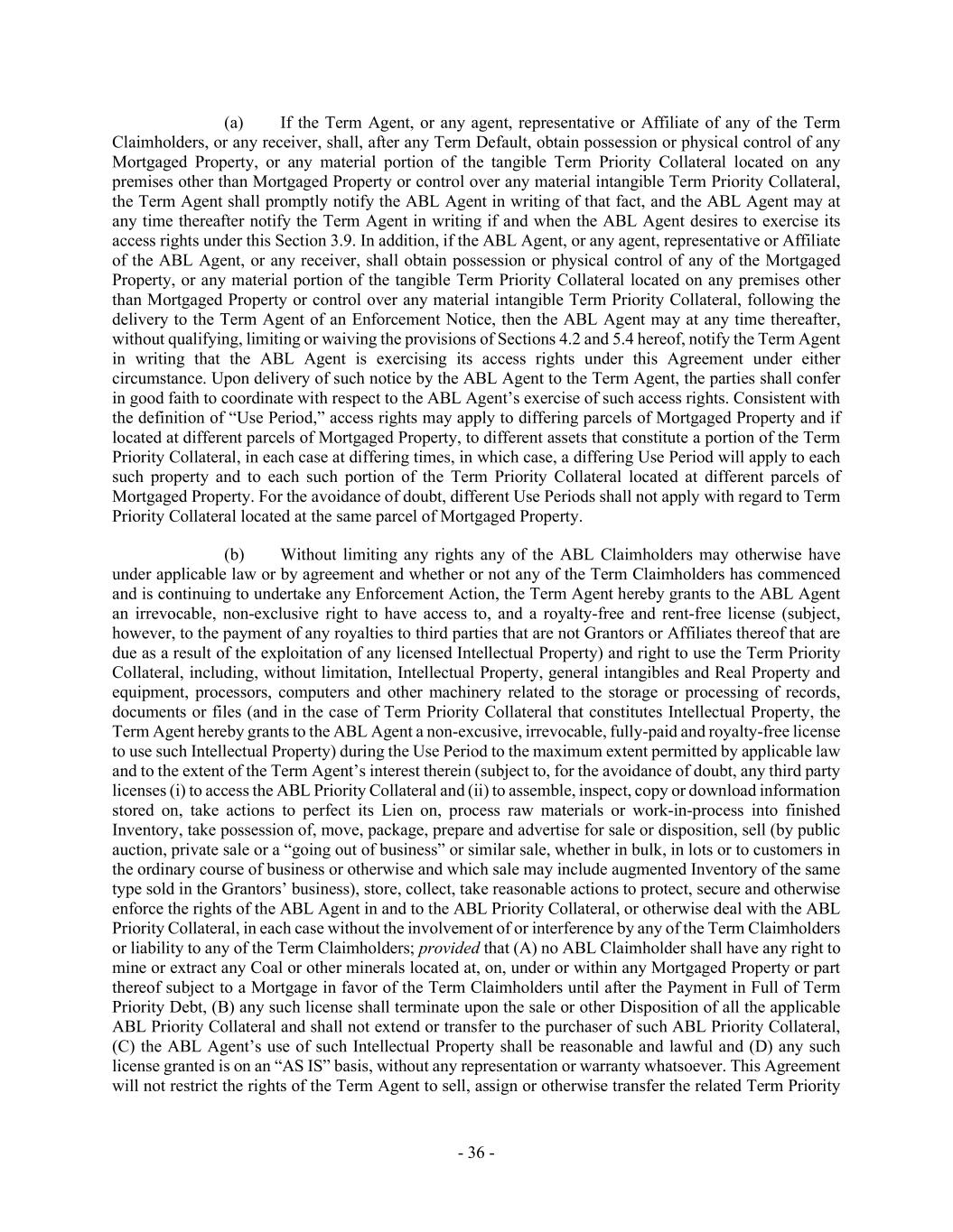 - 36 - (a) If the Term Agent, or any agent, representative or Affiliate of any of the Term Claimholders, or any receiver, shall, after any Term Default, obtain possession or physical control of any Mortgaged Property, or any material portion of the tangible Term Priority Collateral located on any premises other than Mortgaged Property or control over any material intangible Term Priority Collateral, the Term Agent shall promptly notify the ABL Agent in writing of that fact, and the ABL Agent may at any time thereafter notify the Term Agent in writing if and when the ABL Agent desires to exercise its access rights under this Section 3.9. In addition, if the ABL Agent, or any agent, representative or Affiliate of the ABL Agent, or any receiver, shall obtain possession or physical control of any of the Mortgaged Property, or any material portion of the tangible Term Priority Collateral located on any premises other than Mortgaged Property or control over any material intangible Term Priority Collateral, following the delivery to the Term Agent of an Enforcement Notice, then the ABL Agent may at any time thereafter, without qualifying, limiting or waiving the provisions of Sections 4.2 and 5.4 hereof, notify the Term Agent in writing that the ABL Agent is exercising its access rights under this Agreement under either circumstance. Upon delivery of such notice by the ABL Agent to the Term Agent, the parties shall confer in good faith to coordinate with respect to the ABL Agent’s exercise of such access rights. Consistent with the definition of “Use Period,” access rights may apply to differing parcels of Mortgaged Property and if located at different parcels of Mortgaged Property, to different assets that constitute a portion of the Term Priority Collateral, in each case at differing times, in which case, a differing Use Period will apply to each such property and to each such portion of the Term Priority Collateral located at different parcels of Mortgaged Property. For the avoidance of doubt, different Use Periods shall not apply with regard to Term Priority Collateral located at the same parcel of Mortgaged Property. (b) Without limiting any rights any of the ABL Claimholders may otherwise have under applicable law or by agreement and whether or not any of the Term Claimholders has commenced and is continuing to undertake any Enforcement Action, the Term Agent hereby grants to the ABL Agent an irrevocable, non-exclusive right to have access to, and a royalty-free and rent-free license (subject, however, to the payment of any royalties to third parties that are not Grantors or Affiliates thereof that are due as a result of the exploitation of any licensed Intellectual Property) and right to use the Term Priority Collateral, including, without limitation, Intellectual Property, general intangibles and Real Property and equipment, processors, computers and other machinery related to the storage or processing of records, documents or files (and in the case of Term Priority Collateral that constitutes Intellectual Property, the Term Agent hereby grants to the ABL Agent a non-excusive, irrevocable, fully-paid and royalty-free license to use such Intellectual Property) during the Use Period to the maximum extent permitted by applicable law and to the extent of the Term Agent’s interest therein (subject to, for the avoidance of doubt, any third party licenses (i) to access the ABL Priority Collateral and (ii) to assemble, inspect, copy or download information stored on, take actions to perfect its Lien on, process raw materials or work-in-process into finished Inventory, take possession of, move, package, prepare and advertise for sale or disposition, sell (by public auction, private sale or a “going out of business” or similar sale, whether in bulk, in lots or to customers in the ordinary course of business or otherwise and which sale may include augmented Inventory of the same type sold in the Grantors’ business), store, collect, take reasonable actions to protect, secure and otherwise enforce the rights of the ABL Agent in and to the ABL Priority Collateral, or otherwise deal with the ABL Priority Collateral, in each case without the involvement of or interference by any of the Term Claimholders or liability to any of the Term Claimholders; provided that (A) no ABL Claimholder shall have any right to mine or extract any Coal or other minerals located at, on, under or within any Mortgaged Property or part thereof subject to a Mortgage in favor of the Term Claimholders until after the Payment in Full of Term Priority Debt, (B) any such license shall terminate upon the sale or other Disposition of all the applicable ABL Priority Collateral and shall not extend or transfer to the purchaser of such ABL Priority Collateral, (C) the ABL Agent’s use of such Intellectual Property shall be reasonable and lawful and (D) any such license granted is on an “AS IS” basis, without any representation or warranty whatsoever. This Agreement will not restrict the rights of the Term Agent to sell, assign or otherwise transfer the related Term Priority