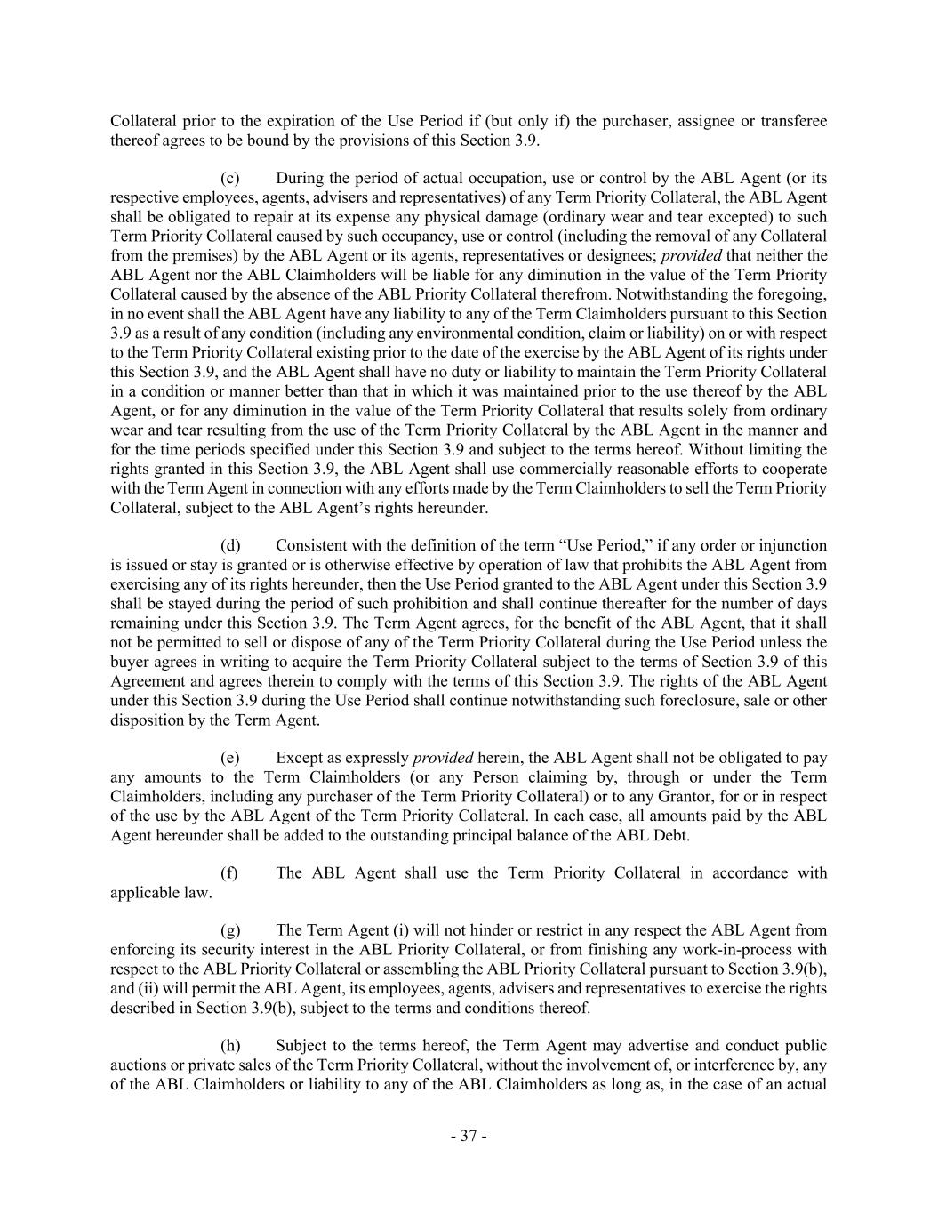 - 37 - Collateral prior to the expiration of the Use Period if (but only if) the purchaser, assignee or transferee thereof agrees to be bound by the provisions of this Section 3.9. (c) During the period of actual occupation, use or control by the ABL Agent (or its respective employees, agents, advisers and representatives) of any Term Priority Collateral, the ABL Agent shall be obligated to repair at its expense any physical damage (ordinary wear and tear excepted) to such Term Priority Collateral caused by such occupancy, use or control (including the removal of any Collateral from the premises) by the ABL Agent or its agents, representatives or designees; provided that neither the ABL Agent nor the ABL Claimholders will be liable for any diminution in the value of the Term Priority Collateral caused by the absence of the ABL Priority Collateral therefrom. Notwithstanding the foregoing, in no event shall the ABL Agent have any liability to any of the Term Claimholders pursuant to this Section 3.9 as a result of any condition (including any environmental condition, claim or liability) on or with respect to the Term Priority Collateral existing prior to the date of the exercise by the ABL Agent of its rights under this Section 3.9, and the ABL Agent shall have no duty or liability to maintain the Term Priority Collateral in a condition or manner better than that in which it was maintained prior to the use thereof by the ABL Agent, or for any diminution in the value of the Term Priority Collateral that results solely from ordinary wear and tear resulting from the use of the Term Priority Collateral by the ABL Agent in the manner and for the time periods specified under this Section 3.9 and subject to the terms hereof. Without limiting the rights granted in this Section 3.9, the ABL Agent shall use commercially reasonable efforts to cooperate with the Term Agent in connection with any efforts made by the Term Claimholders to sell the Term Priority Collateral, subject to the ABL Agent’s rights hereunder. (d) Consistent with the definition of the term “Use Period,” if any order or injunction is issued or stay is granted or is otherwise effective by operation of law that prohibits the ABL Agent from exercising any of its rights hereunder, then the Use Period granted to the ABL Agent under this Section 3.9 shall be stayed during the period of such prohibition and shall continue thereafter for the number of days remaining under this Section 3.9. The Term Agent agrees, for the benefit of the ABL Agent, that it shall not be permitted to sell or dispose of any of the Term Priority Collateral during the Use Period unless the buyer agrees in writing to acquire the Term Priority Collateral subject to the terms of Section 3.9 of this Agreement and agrees therein to comply with the terms of this Section 3.9. The rights of the ABL Agent under this Section 3.9 during the Use Period shall continue notwithstanding such foreclosure, sale or other disposition by the Term Agent. (e) Except as expressly provided herein, the ABL Agent shall not be obligated to pay any amounts to the Term Claimholders (or any Person claiming by, through or under the Term Claimholders, including any purchaser of the Term Priority Collateral) or to any Grantor, for or in respect of the use by the ABL Agent of the Term Priority Collateral. In each case, all amounts paid by the ABL Agent hereunder shall be added to the outstanding principal balance of the ABL Debt. (f) The ABL Agent shall use the Term Priority Collateral in accordance with applicable law. (g) The Term Agent (i) will not hinder or restrict in any respect the ABL Agent from enforcing its security interest in the ABL Priority Collateral, or from finishing any work-in-process with respect to the ABL Priority Collateral or assembling the ABL Priority Collateral pursuant to Section 3.9(b), and (ii) will permit the ABL Agent, its employees, agents, advisers and representatives to exercise the rights described in Section 3.9(b), subject to the terms and conditions thereof. (h) Subject to the terms hereof, the Term Agent may advertise and conduct public auctions or private sales of the Term Priority Collateral, without the involvement of, or interference by, any of the ABL Claimholders or liability to any of the ABL Claimholders as long as, in the case of an actual