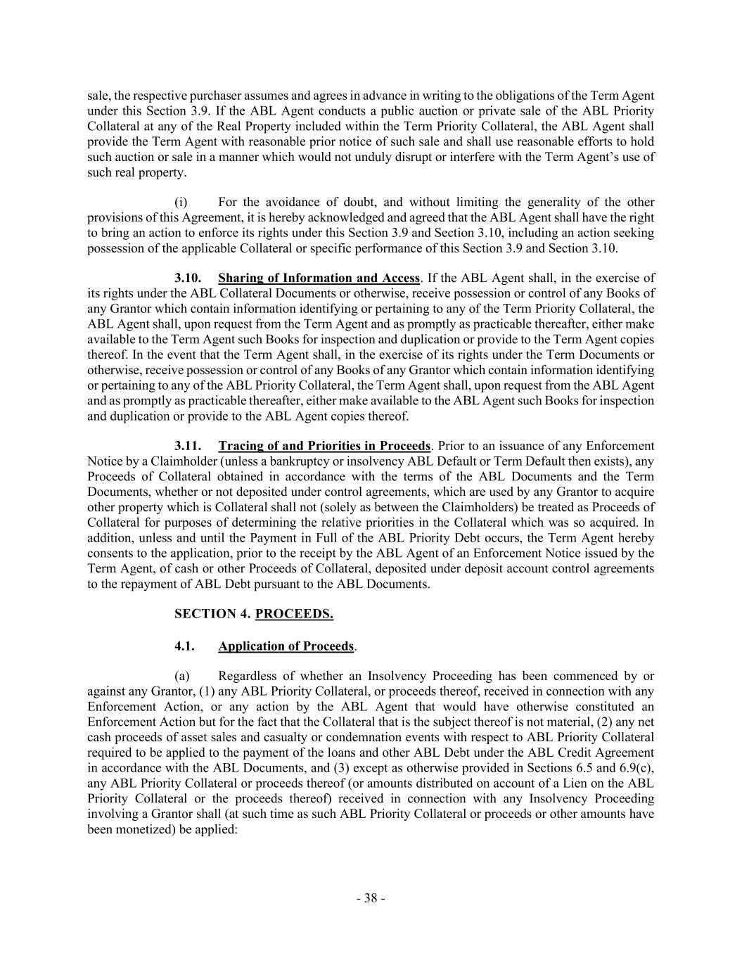 - 38 - sale, the respective purchaser assumes and agrees in advance in writing to the obligations of the Term Agent under this Section 3.9. If the ABL Agent conducts a public auction or private sale of the ABL Priority Collateral at any of the Real Property included within the Term Priority Collateral, the ABL Agent shall provide the Term Agent with reasonable prior notice of such sale and shall use reasonable efforts to hold such auction or sale in a manner which would not unduly disrupt or interfere with the Term Agent’s use of such real property. (i) For the avoidance of doubt, and without limiting the generality of the other provisions of this Agreement, it is hereby acknowledged and agreed that the ABL Agent shall have the right to bring an action to enforce its rights under this Section 3.9 and Section 3.10, including an action seeking possession of the applicable Collateral or specific performance of this Section 3.9 and Section 3.10. 3.10. Sharing of Information and Access. If the ABL Agent shall, in the exercise of its rights under the ABL Collateral Documents or otherwise, receive possession or control of any Books of any Grantor which contain information identifying or pertaining to any of the Term Priority Collateral, the ABL Agent shall, upon request from the Term Agent and as promptly as practicable thereafter, either make available to the Term Agent such Books for inspection and duplication or provide to the Term Agent copies thereof. In the event that the Term Agent shall, in the exercise of its rights under the Term Documents or otherwise, receive possession or control of any Books of any Grantor which contain information identifying or pertaining to any of the ABL Priority Collateral, the Term Agent shall, upon request from the ABL Agent and as promptly as practicable thereafter, either make available to the ABL Agent such Books for inspection and duplication or provide to the ABL Agent copies thereof. 3.11. Tracing of and Priorities in Proceeds. Prior to an issuance of any Enforcement Notice by a Claimholder (unless a bankruptcy or insolvency ABL Default or Term Default then exists), any Proceeds of Collateral obtained in accordance with the terms of the ABL Documents and the Term Documents, whether or not deposited under control agreements, which are used by any Grantor to acquire other property which is Collateral shall not (solely as between the Claimholders) be treated as Proceeds of Collateral for purposes of determining the relative priorities in the Collateral which was so acquired. In addition, unless and until the Payment in Full of the ABL Priority Debt occurs, the Term Agent hereby consents to the application, prior to the receipt by the ABL Agent of an Enforcement Notice issued by the Term Agent, of cash or other Proceeds of Collateral, deposited under deposit account control agreements to the repayment of ABL Debt pursuant to the ABL Documents. SECTION 4. PROCEEDS. 4.1. Application of Proceeds. (a) Regardless of whether an Insolvency Proceeding has been commenced by or against any Grantor, (1) any ABL Priority Collateral, or proceeds thereof, received in connection with any Enforcement Action, or any action by the ABL Agent that would have otherwise constituted an Enforcement Action but for the fact that the Collateral that is the subject thereof is not material, (2) any net cash proceeds of asset sales and casualty or condemnation events with respect to ABL Priority Collateral required to be applied to the payment of the loans and other ABL Debt under the ABL Credit Agreement in accordance with the ABL Documents, and (3) except as otherwise provided in Sections 6.5 and 6.9(c), any ABL Priority Collateral or proceeds thereof (or amounts distributed on account of a Lien on the ABL Priority Collateral or the proceeds thereof) received in connection with any Insolvency Proceeding involving a Grantor shall (at such time as such ABL Priority Collateral or proceeds or other amounts have been monetized) be applied: