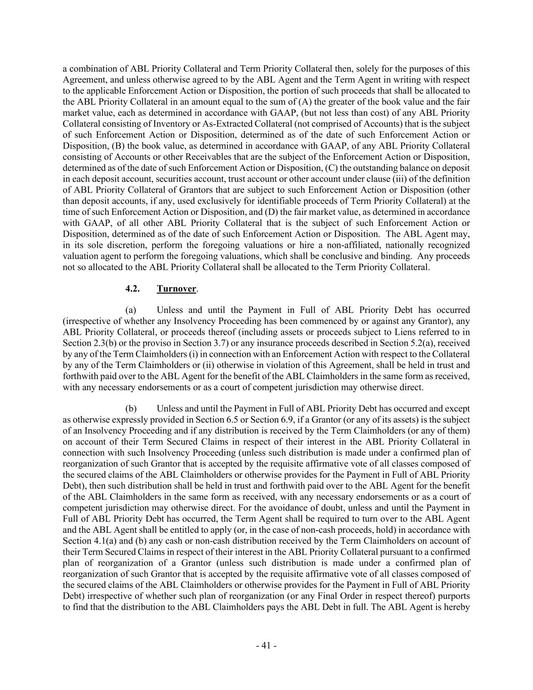 - 41 - a combination of ABL Priority Collateral and Term Priority Collateral then, solely for the purposes of this Agreement, and unless otherwise agreed to by the ABL Agent and the Term Agent in writing with respect to the applicable Enforcement Action or Disposition, the portion of such proceeds that shall be allocated to the ABL Priority Collateral in an amount equal to the sum of (A) the greater of the book value and the fair market value, each as determined in accordance with GAAP, (but not less than cost) of any ABL Priority Collateral consisting of Inventory or As-Extracted Collateral (not comprised of Accounts) that is the subject of such Enforcement Action or Disposition, determined as of the date of such Enforcement Action or Disposition, (B) the book value, as determined in accordance with GAAP, of any ABL Priority Collateral consisting of Accounts or other Receivables that are the subject of the Enforcement Action or Disposition, determined as of the date of such Enforcement Action or Disposition, (C) the outstanding balance on deposit in each deposit account, securities account, trust account or other account under clause (iii) of the definition of ABL Priority Collateral of Grantors that are subject to such Enforcement Action or Disposition (other than deposit accounts, if any, used exclusively for identifiable proceeds of Term Priority Collateral) at the time of such Enforcement Action or Disposition, and (D) the fair market value, as determined in accordance with GAAP, of all other ABL Priority Collateral that is the subject of such Enforcement Action or Disposition, determined as of the date of such Enforcement Action or Disposition. The ABL Agent may, in its sole discretion, perform the foregoing valuations or hire a non-affiliated, nationally recognized valuation agent to perform the foregoing valuations, which shall be conclusive and binding. Any proceeds not so allocated to the ABL Priority Collateral shall be allocated to the Term Priority Collateral. 4.2. Turnover. (a) Unless and until the Payment in Full of ABL Priority Debt has occurred (irrespective of whether any Insolvency Proceeding has been commenced by or against any Grantor), any ABL Priority Collateral, or proceeds thereof (including assets or proceeds subject to Liens referred to in Section 2.3(b) or the proviso in Section 3.7) or any insurance proceeds described in Section 5.2(a), received by any of the Term Claimholders (i) in connection with an Enforcement Action with respect to the Collateral by any of the Term Claimholders or (ii) otherwise in violation of this Agreement, shall be held in trust and forthwith paid over to the ABL Agent for the benefit of the ABL Claimholders in the same form as received, with any necessary endorsements or as a court of competent jurisdiction may otherwise direct. (b) Unless and until the Payment in Full of ABL Priority Debt has occurred and except as otherwise expressly provided in Section 6.5 or Section 6.9, if a Grantor (or any of its assets) is the subject of an Insolvency Proceeding and if any distribution is received by the Term Claimholders (or any of them) on account of their Term Secured Claims in respect of their interest in the ABL Priority Collateral in connection with such Insolvency Proceeding (unless such distribution is made under a confirmed plan of reorganization of such Grantor that is accepted by the requisite affirmative vote of all classes composed of the secured claims of the ABL Claimholders or otherwise provides for the Payment in Full of ABL Priority Debt), then such distribution shall be held in trust and forthwith paid over to the ABL Agent for the benefit of the ABL Claimholders in the same form as received, with any necessary endorsements or as a court of competent jurisdiction may otherwise direct. For the avoidance of doubt, unless and until the Payment in Full of ABL Priority Debt has occurred, the Term Agent shall be required to turn over to the ABL Agent and the ABL Agent shall be entitled to apply (or, in the case of non-cash proceeds, hold) in accordance with Section 4.1(a) and (b) any cash or non-cash distribution received by the Term Claimholders on account of their Term Secured Claims in respect of their interest in the ABL Priority Collateral pursuant to a confirmed plan of reorganization of a Grantor (unless such distribution is made under a confirmed plan of reorganization of such Grantor that is accepted by the requisite affirmative vote of all classes composed of the secured claims of the ABL Claimholders or otherwise provides for the Payment in Full of ABL Priority Debt) irrespective of whether such plan of reorganization (or any Final Order in respect thereof) purports to find that the distribution to the ABL Claimholders pays the ABL Debt in full. The ABL Agent is hereby