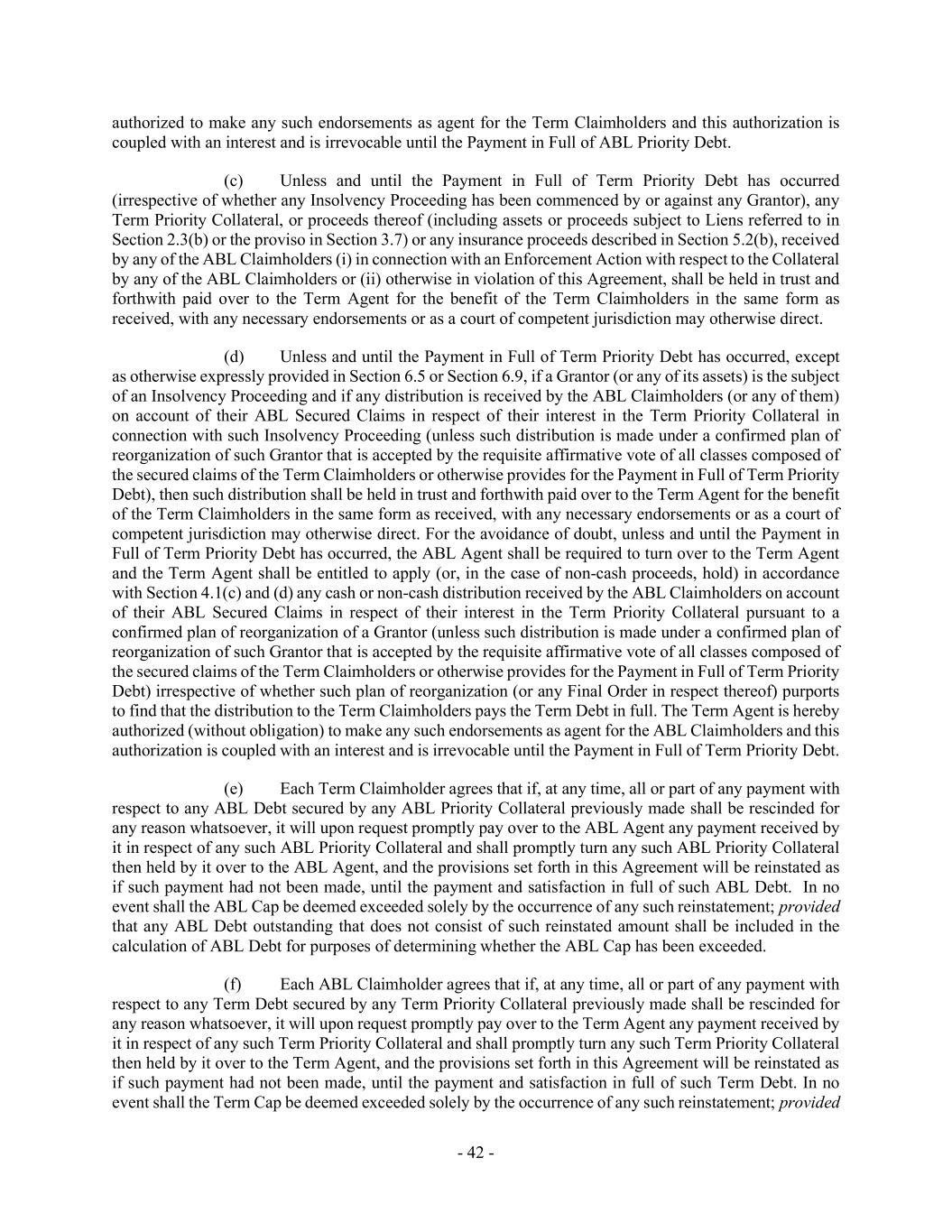 - 42 - authorized to make any such endorsements as agent for the Term Claimholders and this authorization is coupled with an interest and is irrevocable until the Payment in Full of ABL Priority Debt. (c) Unless and until the Payment in Full of Term Priority Debt has occurred (irrespective of whether any Insolvency Proceeding has been commenced by or against any Grantor), any Term Priority Collateral, or proceeds thereof (including assets or proceeds subject to Liens referred to in Section 2.3(b) or the proviso in Section 3.7) or any insurance proceeds described in Section 5.2(b), received by any of the ABL Claimholders (i) in connection with an Enforcement Action with respect to the Collateral by any of the ABL Claimholders or (ii) otherwise in violation of this Agreement, shall be held in trust and forthwith paid over to the Term Agent for the benefit of the Term Claimholders in the same form as received, with any necessary endorsements or as a court of competent jurisdiction may otherwise direct. (d) Unless and until the Payment in Full of Term Priority Debt has occurred, except as otherwise expressly provided in Section 6.5 or Section 6.9, if a Grantor (or any of its assets) is the subject of an Insolvency Proceeding and if any distribution is received by the ABL Claimholders (or any of them) on account of their ABL Secured Claims in respect of their interest in the Term Priority Collateral in connection with such Insolvency Proceeding (unless such distribution is made under a confirmed plan of reorganization of such Grantor that is accepted by the requisite affirmative vote of all classes composed of the secured claims of the Term Claimholders or otherwise provides for the Payment in Full of Term Priority Debt), then such distribution shall be held in trust and forthwith paid over to the Term Agent for the benefit of the Term Claimholders in the same form as received, with any necessary endorsements or as a court of competent jurisdiction may otherwise direct. For the avoidance of doubt, unless and until the Payment in Full of Term Priority Debt has occurred, the ABL Agent shall be required to turn over to the Term Agent and the Term Agent shall be entitled to apply (or, in the case of non-cash proceeds, hold) in accordance with Section 4.1(c) and (d) any cash or non-cash distribution received by the ABL Claimholders on account of their ABL Secured Claims in respect of their interest in the Term Priority Collateral pursuant to a confirmed plan of reorganization of a Grantor (unless such distribution is made under a confirmed plan of reorganization of such Grantor that is accepted by the requisite affirmative vote of all classes composed of the secured claims of the Term Claimholders or otherwise provides for the Payment in Full of Term Priority Debt) irrespective of whether such plan of reorganization (or any Final Order in respect thereof) purports to find that the distribution to the Term Claimholders pays the Term Debt in full. The Term Agent is hereby authorized (without obligation) to make any such endorsements as agent for the ABL Claimholders and this authorization is coupled with an interest and is irrevocable until the Payment in Full of Term Priority Debt. (e) Each Term Claimholder agrees that if, at any time, all or part of any payment with respect to any ABL Debt secured by any ABL Priority Collateral previously made shall be rescinded for any reason whatsoever, it will upon request promptly pay over to the ABL Agent any payment received by it in respect of any such ABL Priority Collateral and shall promptly turn any such ABL Priority Collateral then held by it over to the ABL Agent, and the provisions set forth in this Agreement will be reinstated as if such payment had not been made, until the payment and satisfaction in full of such ABL Debt. In no event shall the ABL Cap be deemed exceeded solely by the occurrence of any such reinstatement; provided that any ABL Debt outstanding that does not consist of such reinstated amount shall be included in the calculation of ABL Debt for purposes of determining whether the ABL Cap has been exceeded. (f) Each ABL Claimholder agrees that if, at any time, all or part of any payment with respect to any Term Debt secured by any Term Priority Collateral previously made shall be rescinded for any reason whatsoever, it will upon request promptly pay over to the Term Agent any payment received by it in respect of any such Term Priority Collateral and shall promptly turn any such Term Priority Collateral then held by it over to the Term Agent, and the provisions set forth in this Agreement will be reinstated as if such payment had not been made, until the payment and satisfaction in full of such Term Debt. In no event shall the Term Cap be deemed exceeded solely by the occurrence of any such reinstatement; provided