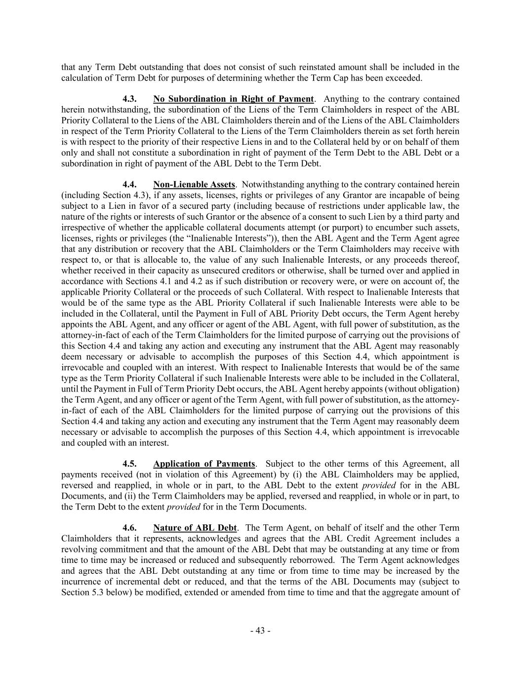 - 43 - that any Term Debt outstanding that does not consist of such reinstated amount shall be included in the calculation of Term Debt for purposes of determining whether the Term Cap has been exceeded. 4.3. No Subordination in Right of Payment. Anything to the contrary contained herein notwithstanding, the subordination of the Liens of the Term Claimholders in respect of the ABL Priority Collateral to the Liens of the ABL Claimholders therein and of the Liens of the ABL Claimholders in respect of the Term Priority Collateral to the Liens of the Term Claimholders therein as set forth herein is with respect to the priority of their respective Liens in and to the Collateral held by or on behalf of them only and shall not constitute a subordination in right of payment of the Term Debt to the ABL Debt or a subordination in right of payment of the ABL Debt to the Term Debt. 4.4. Non-Lienable Assets. Notwithstanding anything to the contrary contained herein (including Section 4.3), if any assets, licenses, rights or privileges of any Grantor are incapable of being subject to a Lien in favor of a secured party (including because of restrictions under applicable law, the nature of the rights or interests of such Grantor or the absence of a consent to such Lien by a third party and irrespective of whether the applicable collateral documents attempt (or purport) to encumber such assets, licenses, rights or privileges (the “Inalienable Interests”)), then the ABL Agent and the Term Agent agree that any distribution or recovery that the ABL Claimholders or the Term Claimholders may receive with respect to, or that is allocable to, the value of any such Inalienable Interests, or any proceeds thereof, whether received in their capacity as unsecured creditors or otherwise, shall be turned over and applied in accordance with Sections 4.1 and 4.2 as if such distribution or recovery were, or were on account of, the applicable Priority Collateral or the proceeds of such Collateral. With respect to Inalienable Interests that would be of the same type as the ABL Priority Collateral if such Inalienable Interests were able to be included in the Collateral, until the Payment in Full of ABL Priority Debt occurs, the Term Agent hereby appoints the ABL Agent, and any officer or agent of the ABL Agent, with full power of substitution, as the attorney-in-fact of each of the Term Claimholders for the limited purpose of carrying out the provisions of this Section 4.4 and taking any action and executing any instrument that the ABL Agent may reasonably deem necessary or advisable to accomplish the purposes of this Section 4.4, which appointment is irrevocable and coupled with an interest. With respect to Inalienable Interests that would be of the same type as the Term Priority Collateral if such Inalienable Interests were able to be included in the Collateral, until the Payment in Full of Term Priority Debt occurs, the ABL Agent hereby appoints (without obligation) the Term Agent, and any officer or agent of the Term Agent, with full power of substitution, as the attorney- in-fact of each of the ABL Claimholders for the limited purpose of carrying out the provisions of this Section 4.4 and taking any action and executing any instrument that the Term Agent may reasonably deem necessary or advisable to accomplish the purposes of this Section 4.4, which appointment is irrevocable and coupled with an interest. 4.5. Application of Payments. Subject to the other terms of this Agreement, all payments received (not in violation of this Agreement) by (i) the ABL Claimholders may be applied, reversed and reapplied, in whole or in part, to the ABL Debt to the extent provided for in the ABL Documents, and (ii) the Term Claimholders may be applied, reversed and reapplied, in whole or in part, to the Term Debt to the extent provided for in the Term Documents. 4.6. Nature of ABL Debt. The Term Agent, on behalf of itself and the other Term Claimholders that it represents, acknowledges and agrees that the ABL Credit Agreement includes a revolving commitment and that the amount of the ABL Debt that may be outstanding at any time or from time to time may be increased or reduced and subsequently reborrowed. The Term Agent acknowledges and agrees that the ABL Debt outstanding at any time or from time to time may be increased by the incurrence of incremental debt or reduced, and that the terms of the ABL Documents may (subject to Section 5.3 below) be modified, extended or amended from time to time and that the aggregate amount of
