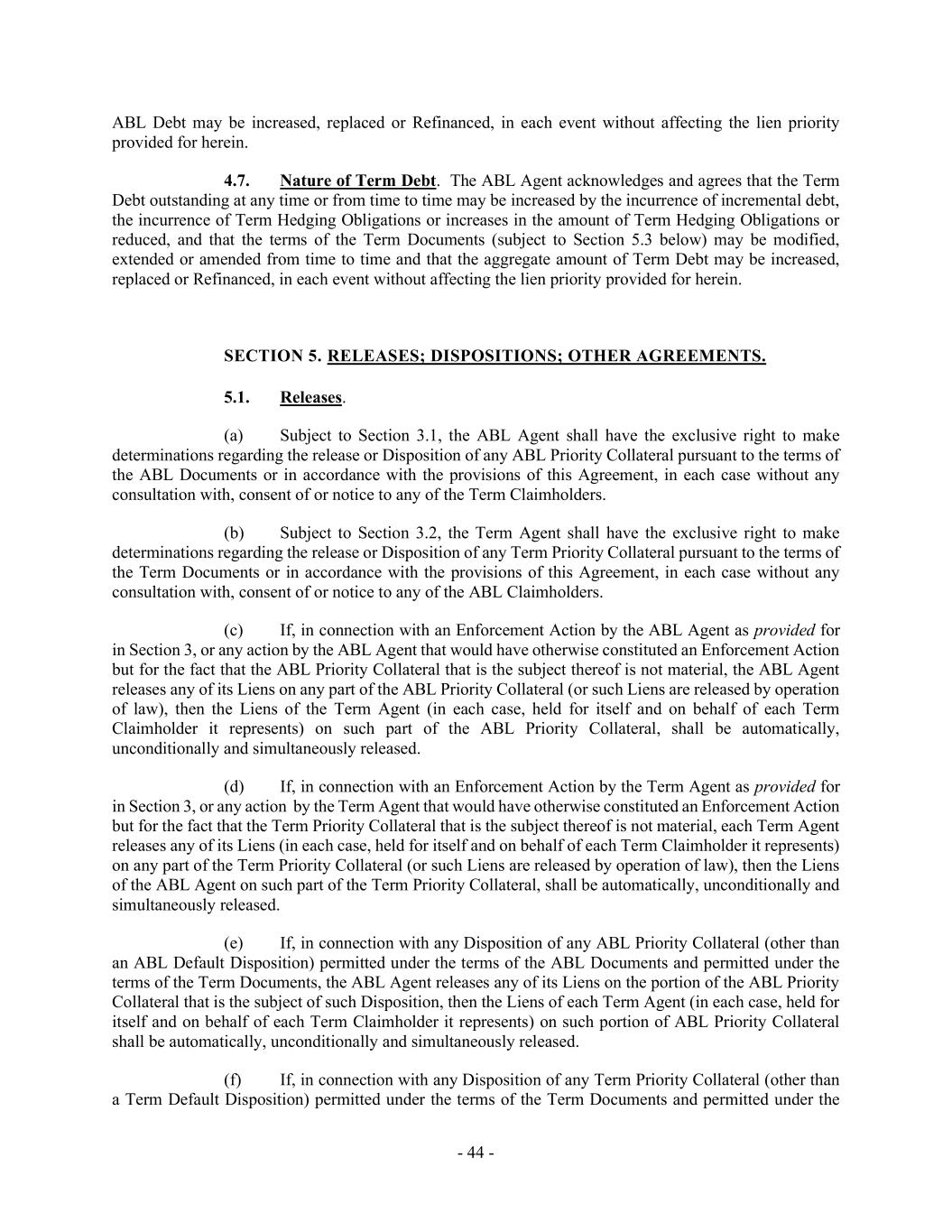- 44 - ABL Debt may be increased, replaced or Refinanced, in each event without affecting the lien priority provided for herein. 4.7. Nature of Term Debt. The ABL Agent acknowledges and agrees that the Term Debt outstanding at any time or from time to time may be increased by the incurrence of incremental debt, the incurrence of Term Hedging Obligations or increases in the amount of Term Hedging Obligations or reduced, and that the terms of the Term Documents (subject to Section 5.3 below) may be modified, extended or amended from time to time and that the aggregate amount of Term Debt may be increased, replaced or Refinanced, in each event without affecting the lien priority provided for herein. SECTION 5. RELEASES; DISPOSITIONS; OTHER AGREEMENTS. 5.1. Releases. (a) Subject to Section 3.1, the ABL Agent shall have the exclusive right to make determinations regarding the release or Disposition of any ABL Priority Collateral pursuant to the terms of the ABL Documents or in accordance with the provisions of this Agreement, in each case without any consultation with, consent of or notice to any of the Term Claimholders. (b) Subject to Section 3.2, the Term Agent shall have the exclusive right to make determinations regarding the release or Disposition of any Term Priority Collateral pursuant to the terms of the Term Documents or in accordance with the provisions of this Agreement, in each case without any consultation with, consent of or notice to any of the ABL Claimholders. (c) If, in connection with an Enforcement Action by the ABL Agent as provided for in Section 3, or any action by the ABL Agent that would have otherwise constituted an Enforcement Action but for the fact that the ABL Priority Collateral that is the subject thereof is not material, the ABL Agent releases any of its Liens on any part of the ABL Priority Collateral (or such Liens are released by operation of law), then the Liens of the Term Agent (in each case, held for itself and on behalf of each Term Claimholder it represents) on such part of the ABL Priority Collateral, shall be automatically, unconditionally and simultaneously released. (d) If, in connection with an Enforcement Action by the Term Agent as provided for in Section 3, or any action by the Term Agent that would have otherwise constituted an Enforcement Action but for the fact that the Term Priority Collateral that is the subject thereof is not material, each Term Agent releases any of its Liens (in each case, held for itself and on behalf of each Term Claimholder it represents) on any part of the Term Priority Collateral (or such Liens are released by operation of law), then the Liens of the ABL Agent on such part of the Term Priority Collateral, shall be automatically, unconditionally and simultaneously released. (e) If, in connection with any Disposition of any ABL Priority Collateral (other than an ABL Default Disposition) permitted under the terms of the ABL Documents and permitted under the terms of the Term Documents, the ABL Agent releases any of its Liens on the portion of the ABL Priority Collateral that is the subject of such Disposition, then the Liens of each Term Agent (in each case, held for itself and on behalf of each Term Claimholder it represents) on such portion of ABL Priority Collateral shall be automatically, unconditionally and simultaneously released. (f) If, in connection with any Disposition of any Term Priority Collateral (other than a Term Default Disposition) permitted under the terms of the Term Documents and permitted under the