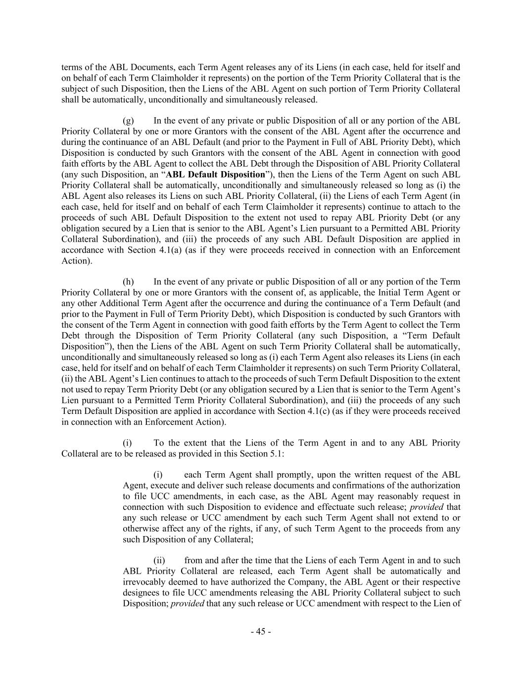 - 45 - terms of the ABL Documents, each Term Agent releases any of its Liens (in each case, held for itself and on behalf of each Term Claimholder it represents) on the portion of the Term Priority Collateral that is the subject of such Disposition, then the Liens of the ABL Agent on such portion of Term Priority Collateral shall be automatically, unconditionally and simultaneously released. (g) In the event of any private or public Disposition of all or any portion of the ABL Priority Collateral by one or more Grantors with the consent of the ABL Agent after the occurrence and during the continuance of an ABL Default (and prior to the Payment in Full of ABL Priority Debt), which Disposition is conducted by such Grantors with the consent of the ABL Agent in connection with good faith efforts by the ABL Agent to collect the ABL Debt through the Disposition of ABL Priority Collateral (any such Disposition, an “ABL Default Disposition”), then the Liens of the Term Agent on such ABL Priority Collateral shall be automatically, unconditionally and simultaneously released so long as (i) the ABL Agent also releases its Liens on such ABL Priority Collateral, (ii) the Liens of each Term Agent (in each case, held for itself and on behalf of each Term Claimholder it represents) continue to attach to the proceeds of such ABL Default Disposition to the extent not used to repay ABL Priority Debt (or any obligation secured by a Lien that is senior to the ABL Agent’s Lien pursuant to a Permitted ABL Priority Collateral Subordination), and (iii) the proceeds of any such ABL Default Disposition are applied in accordance with Section 4.1(a) (as if they were proceeds received in connection with an Enforcement Action). (h) In the event of any private or public Disposition of all or any portion of the Term Priority Collateral by one or more Grantors with the consent of, as applicable, the Initial Term Agent or any other Additional Term Agent after the occurrence and during the continuance of a Term Default (and prior to the Payment in Full of Term Priority Debt), which Disposition is conducted by such Grantors with the consent of the Term Agent in connection with good faith efforts by the Term Agent to collect the Term Debt through the Disposition of Term Priority Collateral (any such Disposition, a “Term Default Disposition”), then the Liens of the ABL Agent on such Term Priority Collateral shall be automatically, unconditionally and simultaneously released so long as (i) each Term Agent also releases its Liens (in each case, held for itself and on behalf of each Term Claimholder it represents) on such Term Priority Collateral, (ii) the ABL Agent’s Lien continues to attach to the proceeds of such Term Default Disposition to the extent not used to repay Term Priority Debt (or any obligation secured by a Lien that is senior to the Term Agent’s Lien pursuant to a Permitted Term Priority Collateral Subordination), and (iii) the proceeds of any such Term Default Disposition are applied in accordance with Section 4.1(c) (as if they were proceeds received in connection with an Enforcement Action). (i) To the extent that the Liens of the Term Agent in and to any ABL Priority Collateral are to be released as provided in this Section 5.1: (i) each Term Agent shall promptly, upon the written request of the ABL Agent, execute and deliver such release documents and confirmations of the authorization to file UCC amendments, in each case, as the ABL Agent may reasonably request in connection with such Disposition to evidence and effectuate such release; provided that any such release or UCC amendment by each such Term Agent shall not extend to or otherwise affect any of the rights, if any, of such Term Agent to the proceeds from any such Disposition of any Collateral; (ii) from and after the time that the Liens of each Term Agent in and to such ABL Priority Collateral are released, each Term Agent shall be automatically and irrevocably deemed to have authorized the Company, the ABL Agent or their respective designees to file UCC amendments releasing the ABL Priority Collateral subject to such Disposition; provided that any such release or UCC amendment with respect to the Lien of