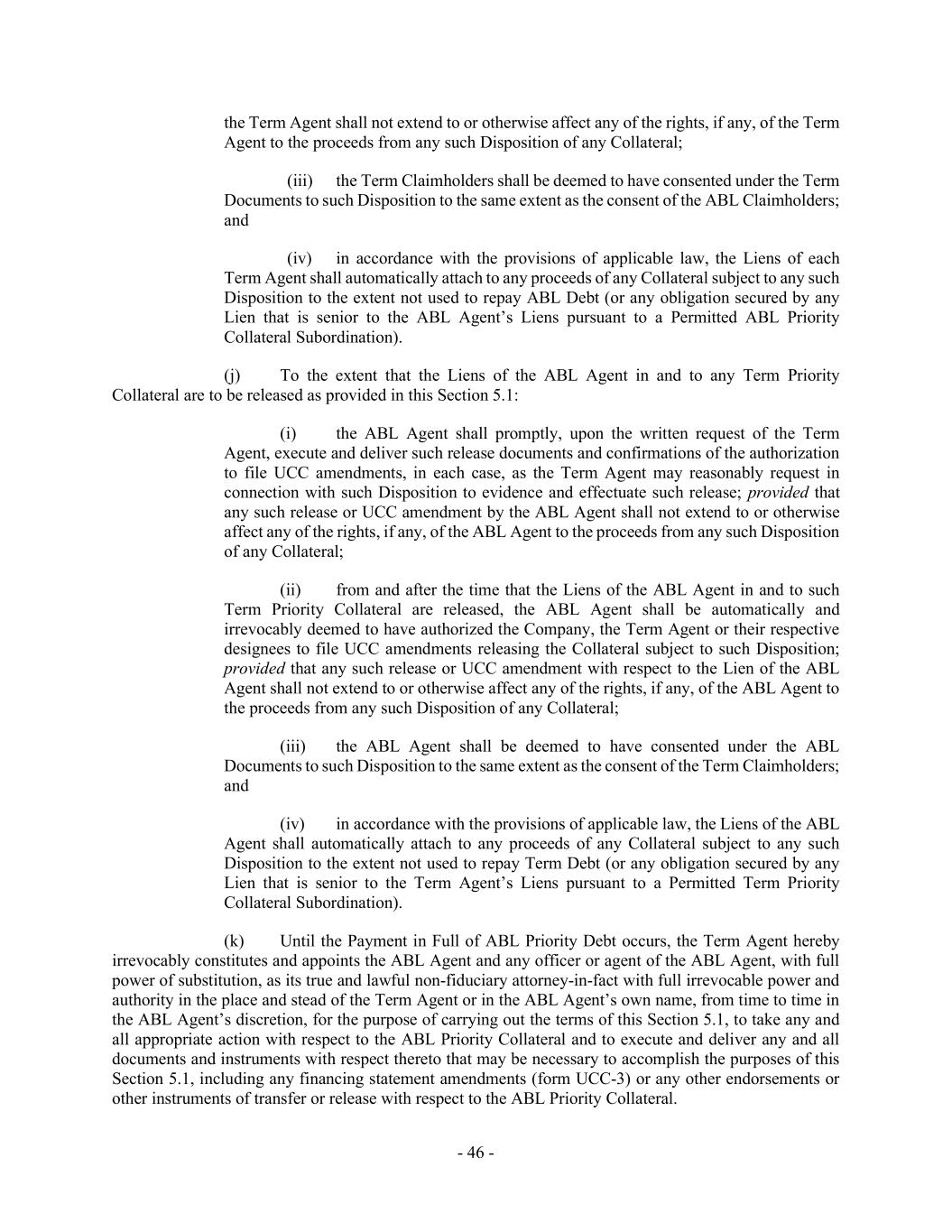 - 46 - the Term Agent shall not extend to or otherwise affect any of the rights, if any, of the Term Agent to the proceeds from any such Disposition of any Collateral; (iii) the Term Claimholders shall be deemed to have consented under the Term Documents to such Disposition to the same extent as the consent of the ABL Claimholders; and (iv) in accordance with the provisions of applicable law, the Liens of each Term Agent shall automatically attach to any proceeds of any Collateral subject to any such Disposition to the extent not used to repay ABL Debt (or any obligation secured by any Lien that is senior to the ABL Agent’s Liens pursuant to a Permitted ABL Priority Collateral Subordination). (j) To the extent that the Liens of the ABL Agent in and to any Term Priority Collateral are to be released as provided in this Section 5.1: (i) the ABL Agent shall promptly, upon the written request of the Term Agent, execute and deliver such release documents and confirmations of the authorization to file UCC amendments, in each case, as the Term Agent may reasonably request in connection with such Disposition to evidence and effectuate such release; provided that any such release or UCC amendment by the ABL Agent shall not extend to or otherwise affect any of the rights, if any, of the ABL Agent to the proceeds from any such Disposition of any Collateral; (ii) from and after the time that the Liens of the ABL Agent in and to such Term Priority Collateral are released, the ABL Agent shall be automatically and irrevocably deemed to have authorized the Company, the Term Agent or their respective designees to file UCC amendments releasing the Collateral subject to such Disposition; provided that any such release or UCC amendment with respect to the Lien of the ABL Agent shall not extend to or otherwise affect any of the rights, if any, of the ABL Agent to the proceeds from any such Disposition of any Collateral; (iii) the ABL Agent shall be deemed to have consented under the ABL Documents to such Disposition to the same extent as the consent of the Term Claimholders; and (iv) in accordance with the provisions of applicable law, the Liens of the ABL Agent shall automatically attach to any proceeds of any Collateral subject to any such Disposition to the extent not used to repay Term Debt (or any obligation secured by any Lien that is senior to the Term Agent’s Liens pursuant to a Permitted Term Priority Collateral Subordination). (k) Until the Payment in Full of ABL Priority Debt occurs, the Term Agent hereby irrevocably constitutes and appoints the ABL Agent and any officer or agent of the ABL Agent, with full power of substitution, as its true and lawful non-fiduciary attorney-in-fact with full irrevocable power and authority in the place and stead of the Term Agent or in the ABL Agent’s own name, from time to time in the ABL Agent’s discretion, for the purpose of carrying out the terms of this Section 5.1, to take any and all appropriate action with respect to the ABL Priority Collateral and to execute and deliver any and all documents and instruments with respect thereto that may be necessary to accomplish the purposes of this Section 5.1, including any financing statement amendments (form UCC-3) or any other endorsements or other instruments of transfer or release with respect to the ABL Priority Collateral.