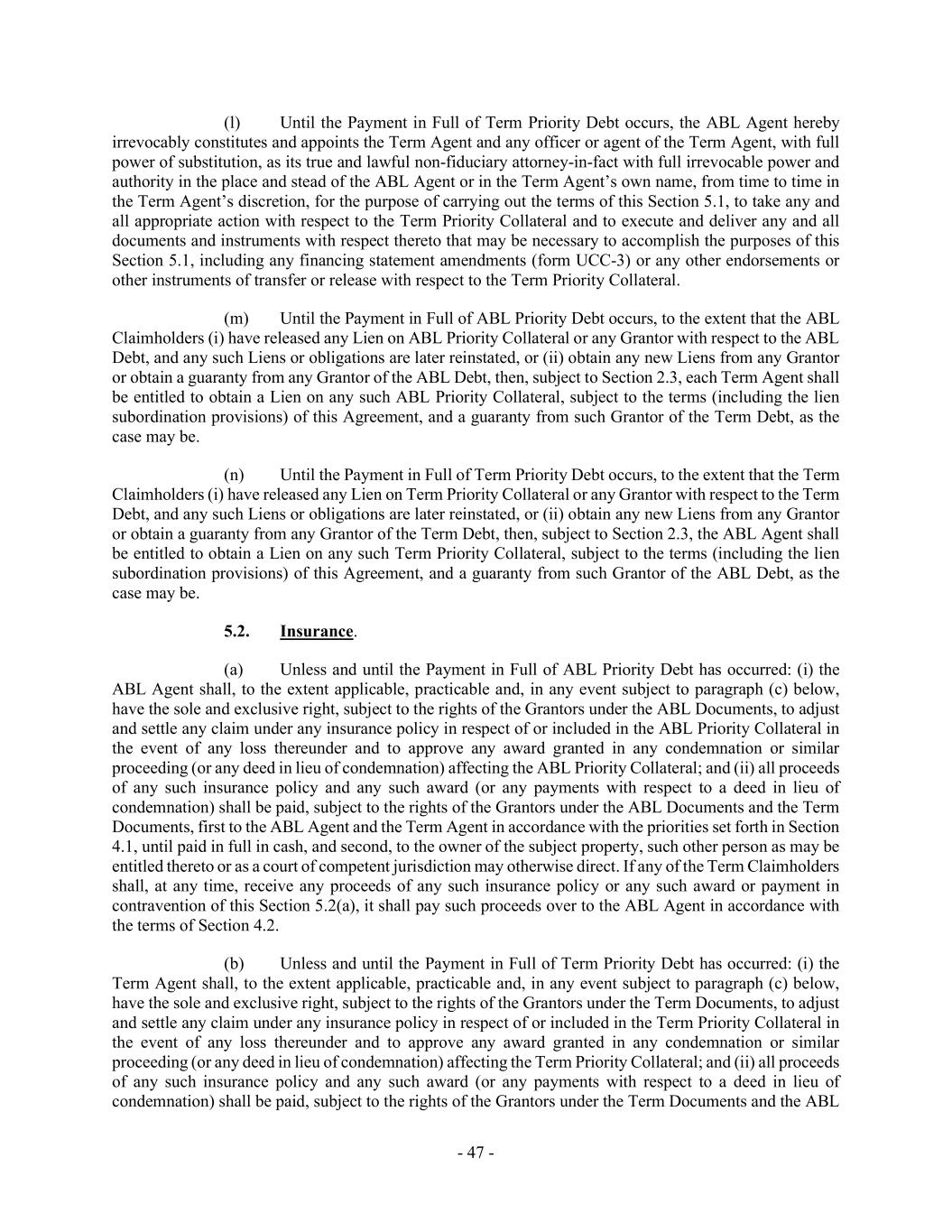 - 47 - (l) Until the Payment in Full of Term Priority Debt occurs, the ABL Agent hereby irrevocably constitutes and appoints the Term Agent and any officer or agent of the Term Agent, with full power of substitution, as its true and lawful non-fiduciary attorney-in-fact with full irrevocable power and authority in the place and stead of the ABL Agent or in the Term Agent’s own name, from time to time in the Term Agent’s discretion, for the purpose of carrying out the terms of this Section 5.1, to take any and all appropriate action with respect to the Term Priority Collateral and to execute and deliver any and all documents and instruments with respect thereto that may be necessary to accomplish the purposes of this Section 5.1, including any financing statement amendments (form UCC-3) or any other endorsements or other instruments of transfer or release with respect to the Term Priority Collateral. (m) Until the Payment in Full of ABL Priority Debt occurs, to the extent that the ABL Claimholders (i) have released any Lien on ABL Priority Collateral or any Grantor with respect to the ABL Debt, and any such Liens or obligations are later reinstated, or (ii) obtain any new Liens from any Grantor or obtain a guaranty from any Grantor of the ABL Debt, then, subject to Section 2.3, each Term Agent shall be entitled to obtain a Lien on any such ABL Priority Collateral, subject to the terms (including the lien subordination provisions) of this Agreement, and a guaranty from such Grantor of the Term Debt, as the case may be. (n) Until the Payment in Full of Term Priority Debt occurs, to the extent that the Term Claimholders (i) have released any Lien on Term Priority Collateral or any Grantor with respect to the Term Debt, and any such Liens or obligations are later reinstated, or (ii) obtain any new Liens from any Grantor or obtain a guaranty from any Grantor of the Term Debt, then, subject to Section 2.3, the ABL Agent shall be entitled to obtain a Lien on any such Term Priority Collateral, subject to the terms (including the lien subordination provisions) of this Agreement, and a guaranty from such Grantor of the ABL Debt, as the case may be. 5.2. Insurance. (a) Unless and until the Payment in Full of ABL Priority Debt has occurred: (i) the ABL Agent shall, to the extent applicable, practicable and, in any event subject to paragraph (c) below, have the sole and exclusive right, subject to the rights of the Grantors under the ABL Documents, to adjust and settle any claim under any insurance policy in respect of or included in the ABL Priority Collateral in the event of any loss thereunder and to approve any award granted in any condemnation or similar proceeding (or any deed in lieu of condemnation) affecting the ABL Priority Collateral; and (ii) all proceeds of any such insurance policy and any such award (or any payments with respect to a deed in lieu of condemnation) shall be paid, subject to the rights of the Grantors under the ABL Documents and the Term Documents, first to the ABL Agent and the Term Agent in accordance with the priorities set forth in Section 4.1, until paid in full in cash, and second, to the owner of the subject property, such other person as may be entitled thereto or as a court of competent jurisdiction may otherwise direct. If any of the Term Claimholders shall, at any time, receive any proceeds of any such insurance policy or any such award or payment in contravention of this Section 5.2(a), it shall pay such proceeds over to the ABL Agent in accordance with the terms of Section 4.2. (b) Unless and until the Payment in Full of Term Priority Debt has occurred: (i) the Term Agent shall, to the extent applicable, practicable and, in any event subject to paragraph (c) below, have the sole and exclusive right, subject to the rights of the Grantors under the Term Documents, to adjust and settle any claim under any insurance policy in respect of or included in the Term Priority Collateral in the event of any loss thereunder and to approve any award granted in any condemnation or similar proceeding (or any deed in lieu of condemnation) affecting the Term Priority Collateral; and (ii) all proceeds of any such insurance policy and any such award (or any payments with respect to a deed in lieu of condemnation) shall be paid, subject to the rights of the Grantors under the Term Documents and the ABL