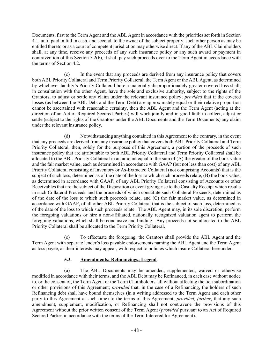 - 48 - Documents, first to the Term Agent and the ABL Agent in accordance with the priorities set forth in Section 4.1, until paid in full in cash, and second, to the owner of the subject property, such other person as may be entitled thereto or as a court of competent jurisdiction may otherwise direct. If any of the ABL Claimholders shall, at any time, receive any proceeds of any such insurance policy or any such award or payment in contravention of this Section 5.2(b), it shall pay such proceeds over to the Term Agent in accordance with the terms of Section 4.2. (c) In the event that any proceeds are derived from any insurance policy that covers both ABL Priority Collateral and Term Priority Collateral, the Term Agent or the ABL Agent, as determined by whichever facility’s Priority Collateral bore a materially disproportionately greater covered loss shall, in consultation with the other Agent, have the sole and exclusive authority, subject to the rights of the Grantors, to adjust or settle any claim under the relevant insurance policy; provided that if the covered losses (as between the ABL Debt and the Term Debt) are approximately equal or their relative proportion cannot be ascertained with reasonable certainty, then the ABL Agent and the Term Agent (acting at the direction of an Act of Required Secured Parties) will work jointly and in good faith to collect, adjust or settle (subject to the rights of the Grantors under the ABL Documents and the Term Documents) any claim under the relevant insurance policy. (d) Notwithstanding anything contained in this Agreement to the contrary, in the event that any proceeds are derived from any insurance policy that covers both ABL Priority Collateral and Term Priority Collateral, then, solely for the purposes of this Agreement, a portion of the proceeds of such insurance policy that are attributable to both ABL Priority Collateral and Term Priority Collateral shall be allocated to the ABL Priority Collateral in an amount equal to the sum of (A) the greater of the book value and the fair market value, each as determined in accordance with GAAP (but not less than cost) of any ABL Priority Collateral consisting of Inventory or As-Extracted Collateral (not comprising Accounts) that is the subject of such loss, determined as of the date of the loss to which such proceeds relate, (B) the book value, as determined in accordance with GAAP, of any ABL Priority Collateral consisting of Accounts or other Receivables that are the subject of the Disposition or event giving rise to the Casualty Receipt which results in such Collateral Proceeds and the proceeds of which constitute such Collateral Proceeds, determined as of the date of the loss to which such proceeds relate, and (C) the fair market value, as determined in accordance with GAAP, of all other ABL Priority Collateral that is the subject of such loss, determined as of the date of the loss to which such proceeds relate. The ABL Agent may, in its sole discretion, perform the foregoing valuations or hire a non-affiliated, nationally recognized valuation agent to perform the foregoing valuations, which shall be conclusive and binding. Any proceeds not so allocated to the ABL Priority Collateral shall be allocated to the Term Priority Collateral. (e) To effectuate the foregoing, the Grantors shall provide the ABL Agent and the Term Agent with separate lender’s loss payable endorsements naming the ABL Agent and the Term Agent as loss payee, as their interests may appear, with respect to policies which insure Collateral hereunder. 5.3. Amendments; Refinancings; Legend. (a) The ABL Documents may be amended, supplemented, waived or otherwise modified in accordance with their terms, and the ABL Debt may be Refinanced, in each case without notice to, or the consent of, the Term Agent or the Term Claimholders, all without affecting the lien subordination or other provisions of this Agreement; provided that, in the case of a Refinancing, the holders of such Refinancing debt shall have bound themselves (in a writing addressed to the Term Agent and each other party to this Agreement at such time) to the terms of this Agreement; provided, further, that any such amendment, supplement, modification, or Refinancing shall not contravene the provisions of this Agreement without the prior written consent of the Term Agent (provided pursuant to an Act of Required Secured Parties in accordance with the terms of the Term Intercreditor Agreement).