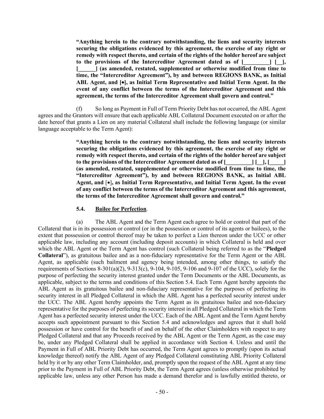 - 50 - “Anything herein to the contrary notwithstanding, the liens and security interests securing the obligations evidenced by this agreement, the exercise of any right or remedy with respect thereto, and certain of the rights of the holder hereof are subject to the provisions of the Intercreditor Agreement dated as of [_________] [__], [______] (as amended, restated, supplemented or otherwise modified from time to time, the “Intercreditor Agreement”), by and between REGIONS BANK, as Initial ABL Agent, and [], as Initial Term Representative and Initial Term Agent. In the event of any conflict between the terms of the Intercreditor Agreement and this agreement, the terms of the Intercreditor Agreement shall govern and control.” (f) So long as Payment in Full of Term Priority Debt has not occurred, the ABL Agent agrees and the Grantors will ensure that each applicable ABL Collateral Document executed on or after the date hereof that grants a Lien on any material Collateral shall include the following language (or similar language acceptable to the Term Agent): “Anything herein to the contrary notwithstanding, the liens and security interests securing the obligations evidenced by this agreement, the exercise of any right or remedy with respect thereto, and certain of the rights of the holder hereof are subject to the provisions of the Intercreditor Agreement dated as of [_________] [__], [_____] (as amended, restated, supplemented or otherwise modified from time to time, the “Intercreditor Agreement”), by and between REGIONS BANK, as Initial ABL Agent, and [], as Initial Term Representative, and Initial Term Agent. In the event of any conflict between the terms of the Intercreditor Agreement and this agreement, the terms of the Intercreditor Agreement shall govern and control.” 5.4. Bailee for Perfection. (a) The ABL Agent and the Term Agent each agree to hold or control that part of the Collateral that is in its possession or control (or in the possession or control of its agents or bailees), to the extent that possession or control thereof may be taken to perfect a Lien thereon under the UCC or other applicable law, including any account (including deposit accounts) in which Collateral is held and over which the ABL Agent or the Term Agent has control (such Collateral being referred to as the “Pledged Collateral”), as gratuitous bailee and as a non-fiduciary representative for the Term Agent or the ABL Agent, as applicable (such bailment and agency being intended, among other things, to satisfy the requirements of Sections 8-301(a)(2), 9-313(c), 9-104, 9-105, 9-106 and 9-107 of the UCC), solely for the purpose of perfecting the security interest granted under the Term Documents or the ABL Documents, as applicable, subject to the terms and conditions of this Section 5.4. Each Term Agent hereby appoints the ABL Agent as its gratuitous bailee and non-fiduciary representative for the purposes of perfecting its security interest in all Pledged Collateral in which the ABL Agent has a perfected security interest under the UCC. The ABL Agent hereby appoints the Term Agent as its gratuitous bailee and non-fiduciary representative for the purposes of perfecting its security interest in all Pledged Collateral in which the Term Agent has a perfected security interest under the UCC. Each of the ABL Agent and the Term Agent hereby accepts such appointment pursuant to this Section 5.4 and acknowledges and agrees that it shall hold possession or have control for the benefit of and on behalf of the other Claimholders with respect to any Pledged Collateral and that any Proceeds received by the ABL Agent or the Term Agent, as the case may be, under any Pledged Collateral shall be applied in accordance with Section 4. Unless and until the Payment in Full of ABL Priority Debt has occurred, the Term Agent agrees to promptly (upon its actual knowledge thereof) notify the ABL Agent of any Pledged Collateral constituting ABL Priority Collateral held by it or by any other Term Claimholder, and, promptly upon the request of the ABL Agent at any time prior to the Payment in Full of ABL Priority Debt, the Term Agent agrees (unless otherwise prohibited by applicable law, unless any other Person has made a demand therefor and is lawfully entitled thereto, or