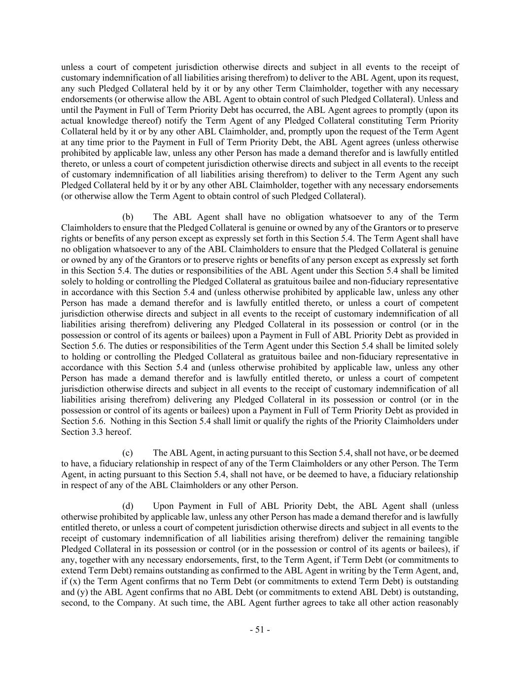 - 51 - unless a court of competent jurisdiction otherwise directs and subject in all events to the receipt of customary indemnification of all liabilities arising therefrom) to deliver to the ABL Agent, upon its request, any such Pledged Collateral held by it or by any other Term Claimholder, together with any necessary endorsements (or otherwise allow the ABL Agent to obtain control of such Pledged Collateral). Unless and until the Payment in Full of Term Priority Debt has occurred, the ABL Agent agrees to promptly (upon its actual knowledge thereof) notify the Term Agent of any Pledged Collateral constituting Term Priority Collateral held by it or by any other ABL Claimholder, and, promptly upon the request of the Term Agent at any time prior to the Payment in Full of Term Priority Debt, the ABL Agent agrees (unless otherwise prohibited by applicable law, unless any other Person has made a demand therefor and is lawfully entitled thereto, or unless a court of competent jurisdiction otherwise directs and subject in all events to the receipt of customary indemnification of all liabilities arising therefrom) to deliver to the Term Agent any such Pledged Collateral held by it or by any other ABL Claimholder, together with any necessary endorsements (or otherwise allow the Term Agent to obtain control of such Pledged Collateral). (b) The ABL Agent shall have no obligation whatsoever to any of the Term Claimholders to ensure that the Pledged Collateral is genuine or owned by any of the Grantors or to preserve rights or benefits of any person except as expressly set forth in this Section 5.4. The Term Agent shall have no obligation whatsoever to any of the ABL Claimholders to ensure that the Pledged Collateral is genuine or owned by any of the Grantors or to preserve rights or benefits of any person except as expressly set forth in this Section 5.4. The duties or responsibilities of the ABL Agent under this Section 5.4 shall be limited solely to holding or controlling the Pledged Collateral as gratuitous bailee and non-fiduciary representative in accordance with this Section 5.4 and (unless otherwise prohibited by applicable law, unless any other Person has made a demand therefor and is lawfully entitled thereto, or unless a court of competent jurisdiction otherwise directs and subject in all events to the receipt of customary indemnification of all liabilities arising therefrom) delivering any Pledged Collateral in its possession or control (or in the possession or control of its agents or bailees) upon a Payment in Full of ABL Priority Debt as provided in Section 5.6. The duties or responsibilities of the Term Agent under this Section 5.4 shall be limited solely to holding or controlling the Pledged Collateral as gratuitous bailee and non-fiduciary representative in accordance with this Section 5.4 and (unless otherwise prohibited by applicable law, unless any other Person has made a demand therefor and is lawfully entitled thereto, or unless a court of competent jurisdiction otherwise directs and subject in all events to the receipt of customary indemnification of all liabilities arising therefrom) delivering any Pledged Collateral in its possession or control (or in the possession or control of its agents or bailees) upon a Payment in Full of Term Priority Debt as provided in Section 5.6. Nothing in this Section 5.4 shall limit or qualify the rights of the Priority Claimholders under Section 3.3 hereof. (c) The ABL Agent, in acting pursuant to this Section 5.4, shall not have, or be deemed to have, a fiduciary relationship in respect of any of the Term Claimholders or any other Person. The Term Agent, in acting pursuant to this Section 5.4, shall not have, or be deemed to have, a fiduciary relationship in respect of any of the ABL Claimholders or any other Person. (d) Upon Payment in Full of ABL Priority Debt, the ABL Agent shall (unless otherwise prohibited by applicable law, unless any other Person has made a demand therefor and is lawfully entitled thereto, or unless a court of competent jurisdiction otherwise directs and subject in all events to the receipt of customary indemnification of all liabilities arising therefrom) deliver the remaining tangible Pledged Collateral in its possession or control (or in the possession or control of its agents or bailees), if any, together with any necessary endorsements, first, to the Term Agent, if Term Debt (or commitments to extend Term Debt) remains outstanding as confirmed to the ABL Agent in writing by the Term Agent, and, if (x) the Term Agent confirms that no Term Debt (or commitments to extend Term Debt) is outstanding and (y) the ABL Agent confirms that no ABL Debt (or commitments to extend ABL Debt) is outstanding, second, to the Company. At such time, the ABL Agent further agrees to take all other action reasonably