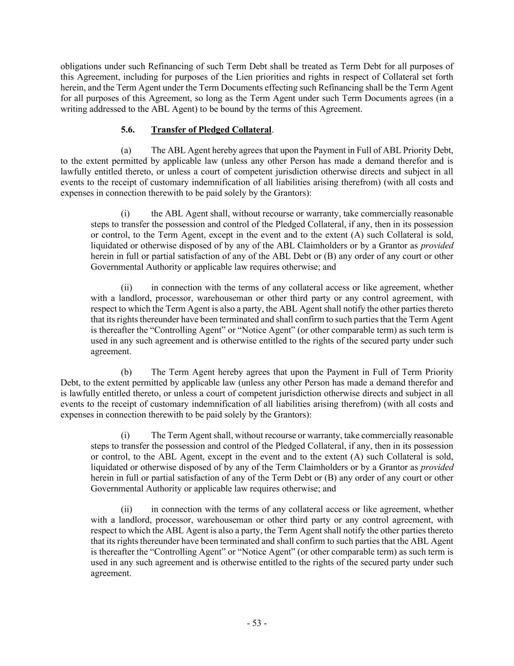 - 53 - obligations under such Refinancing of such Term Debt shall be treated as Term Debt for all purposes of this Agreement, including for purposes of the Lien priorities and rights in respect of Collateral set forth herein, and the Term Agent under the Term Documents effecting such Refinancing shall be the Term Agent for all purposes of this Agreement, so long as the Term Agent under such Term Documents agrees (in a writing addressed to the ABL Agent) to be bound by the terms of this Agreement. 5.6. Transfer of Pledged Collateral. (a) The ABL Agent hereby agrees that upon the Payment in Full of ABL Priority Debt, to the extent permitted by applicable law (unless any other Person has made a demand therefor and is lawfully entitled thereto, or unless a court of competent jurisdiction otherwise directs and subject in all events to the receipt of customary indemnification of all liabilities arising therefrom) (with all costs and expenses in connection therewith to be paid solely by the Grantors): (i) the ABL Agent shall, without recourse or warranty, take commercially reasonable steps to transfer the possession and control of the Pledged Collateral, if any, then in its possession or control, to the Term Agent, except in the event and to the extent (A) such Collateral is sold, liquidated or otherwise disposed of by any of the ABL Claimholders or by a Grantor as provided herein in full or partial satisfaction of any of the ABL Debt or (B) any order of any court or other Governmental Authority or applicable law requires otherwise; and (ii) in connection with the terms of any collateral access or like agreement, whether with a landlord, processor, warehouseman or other third party or any control agreement, with respect to which the Term Agent is also a party, the ABL Agent shall notify the other parties thereto that its rights thereunder have been terminated and shall confirm to such parties that the Term Agent is thereafter the “Controlling Agent” or “Notice Agent” (or other comparable term) as such term is used in any such agreement and is otherwise entitled to the rights of the secured party under such agreement. (b) The Term Agent hereby agrees that upon the Payment in Full of Term Priority Debt, to the extent permitted by applicable law (unless any other Person has made a demand therefor and is lawfully entitled thereto, or unless a court of competent jurisdiction otherwise directs and subject in all events to the receipt of customary indemnification of all liabilities arising therefrom) (with all costs and expenses in connection therewith to be paid solely by the Grantors): (i) The Term Agent shall, without recourse or warranty, take commercially reasonable steps to transfer the possession and control of the Pledged Collateral, if any, then in its possession or control, to the ABL Agent, except in the event and to the extent (A) such Collateral is sold, liquidated or otherwise disposed of by any of the Term Claimholders or by a Grantor as provided herein in full or partial satisfaction of any of the Term Debt or (B) any order of any court or other Governmental Authority or applicable law requires otherwise; and (ii) in connection with the terms of any collateral access or like agreement, whether with a landlord, processor, warehouseman or other third party or any control agreement, with respect to which the ABL Agent is also a party, the Term Agent shall notify the other parties thereto that its rights thereunder have been terminated and shall confirm to such parties that the ABL Agent is thereafter the “Controlling Agent” or “Notice Agent” (or other comparable term) as such term is used in any such agreement and is otherwise entitled to the rights of the secured party under such agreement.