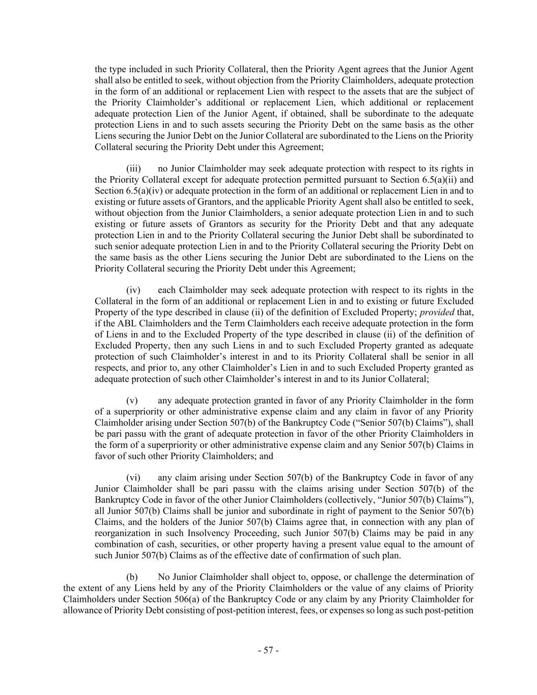 - 57 - the type included in such Priority Collateral, then the Priority Agent agrees that the Junior Agent shall also be entitled to seek, without objection from the Priority Claimholders, adequate protection in the form of an additional or replacement Lien with respect to the assets that are the subject of the Priority Claimholder’s additional or replacement Lien, which additional or replacement adequate protection Lien of the Junior Agent, if obtained, shall be subordinate to the adequate protection Liens in and to such assets securing the Priority Debt on the same basis as the other Liens securing the Junior Debt on the Junior Collateral are subordinated to the Liens on the Priority Collateral securing the Priority Debt under this Agreement; (iii) no Junior Claimholder may seek adequate protection with respect to its rights in the Priority Collateral except for adequate protection permitted pursuant to Section 6.5(a)(ii) and Section 6.5(a)(iv) or adequate protection in the form of an additional or replacement Lien in and to existing or future assets of Grantors, and the applicable Priority Agent shall also be entitled to seek, without objection from the Junior Claimholders, a senior adequate protection Lien in and to such existing or future assets of Grantors as security for the Priority Debt and that any adequate protection Lien in and to the Priority Collateral securing the Junior Debt shall be subordinated to such senior adequate protection Lien in and to the Priority Collateral securing the Priority Debt on the same basis as the other Liens securing the Junior Debt are subordinated to the Liens on the Priority Collateral securing the Priority Debt under this Agreement; (iv) each Claimholder may seek adequate protection with respect to its rights in the Collateral in the form of an additional or replacement Lien in and to existing or future Excluded Property of the type described in clause (ii) of the definition of Excluded Property; provided that, if the ABL Claimholders and the Term Claimholders each receive adequate protection in the form of Liens in and to the Excluded Property of the type described in clause (ii) of the definition of Excluded Property, then any such Liens in and to such Excluded Property granted as adequate protection of such Claimholder’s interest in and to its Priority Collateral shall be senior in all respects, and prior to, any other Claimholder’s Lien in and to such Excluded Property granted as adequate protection of such other Claimholder’s interest in and to its Junior Collateral; (v) any adequate protection granted in favor of any Priority Claimholder in the form of a superpriority or other administrative expense claim and any claim in favor of any Priority Claimholder arising under Section 507(b) of the Bankruptcy Code (“Senior 507(b) Claims”), shall be pari passu with the grant of adequate protection in favor of the other Priority Claimholders in the form of a superpriority or other administrative expense claim and any Senior 507(b) Claims in favor of such other Priority Claimholders; and (vi) any claim arising under Section 507(b) of the Bankruptcy Code in favor of any Junior Claimholder shall be pari passu with the claims arising under Section 507(b) of the Bankruptcy Code in favor of the other Junior Claimholders (collectively, “Junior 507(b) Claims”), all Junior 507(b) Claims shall be junior and subordinate in right of payment to the Senior 507(b) Claims, and the holders of the Junior 507(b) Claims agree that, in connection with any plan of reorganization in such Insolvency Proceeding, such Junior 507(b) Claims may be paid in any combination of cash, securities, or other property having a present value equal to the amount of such Junior 507(b) Claims as of the effective date of confirmation of such plan. (b) No Junior Claimholder shall object to, oppose, or challenge the determination of the extent of any Liens held by any of the Priority Claimholders or the value of any claims of Priority Claimholders under Section 506(a) of the Bankruptcy Code or any claim by any Priority Claimholder for allowance of Priority Debt consisting of post-petition interest, fees, or expenses so long as such post-petition