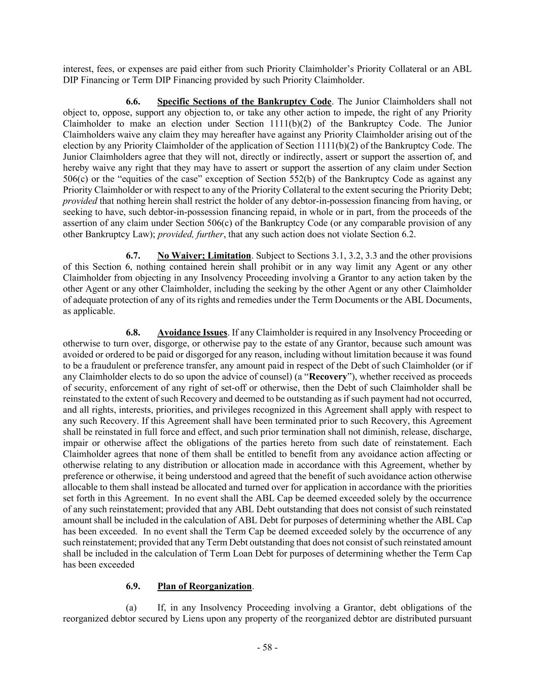 - 58 - interest, fees, or expenses are paid either from such Priority Claimholder’s Priority Collateral or an ABL DIP Financing or Term DIP Financing provided by such Priority Claimholder. 6.6. Specific Sections of the Bankruptcy Code. The Junior Claimholders shall not object to, oppose, support any objection to, or take any other action to impede, the right of any Priority Claimholder to make an election under Section 1111(b)(2) of the Bankruptcy Code. The Junior Claimholders waive any claim they may hereafter have against any Priority Claimholder arising out of the election by any Priority Claimholder of the application of Section 1111(b)(2) of the Bankruptcy Code. The Junior Claimholders agree that they will not, directly or indirectly, assert or support the assertion of, and hereby waive any right that they may have to assert or support the assertion of any claim under Section 506(c) or the “equities of the case” exception of Section 552(b) of the Bankruptcy Code as against any Priority Claimholder or with respect to any of the Priority Collateral to the extent securing the Priority Debt; provided that nothing herein shall restrict the holder of any debtor-in-possession financing from having, or seeking to have, such debtor-in-possession financing repaid, in whole or in part, from the proceeds of the assertion of any claim under Section 506(c) of the Bankruptcy Code (or any comparable provision of any other Bankruptcy Law); provided, further, that any such action does not violate Section 6.2. 6.7. No Waiver; Limitation. Subject to Sections 3.1, 3.2, 3.3 and the other provisions of this Section 6, nothing contained herein shall prohibit or in any way limit any Agent or any other Claimholder from objecting in any Insolvency Proceeding involving a Grantor to any action taken by the other Agent or any other Claimholder, including the seeking by the other Agent or any other Claimholder of adequate protection of any of its rights and remedies under the Term Documents or the ABL Documents, as applicable. 6.8. Avoidance Issues. If any Claimholder is required in any Insolvency Proceeding or otherwise to turn over, disgorge, or otherwise pay to the estate of any Grantor, because such amount was avoided or ordered to be paid or disgorged for any reason, including without limitation because it was found to be a fraudulent or preference transfer, any amount paid in respect of the Debt of such Claimholder (or if any Claimholder elects to do so upon the advice of counsel) (a “Recovery”), whether received as proceeds of security, enforcement of any right of set-off or otherwise, then the Debt of such Claimholder shall be reinstated to the extent of such Recovery and deemed to be outstanding as if such payment had not occurred, and all rights, interests, priorities, and privileges recognized in this Agreement shall apply with respect to any such Recovery. If this Agreement shall have been terminated prior to such Recovery, this Agreement shall be reinstated in full force and effect, and such prior termination shall not diminish, release, discharge, impair or otherwise affect the obligations of the parties hereto from such date of reinstatement. Each Claimholder agrees that none of them shall be entitled to benefit from any avoidance action affecting or otherwise relating to any distribution or allocation made in accordance with this Agreement, whether by preference or otherwise, it being understood and agreed that the benefit of such avoidance action otherwise allocable to them shall instead be allocated and turned over for application in accordance with the priorities set forth in this Agreement. In no event shall the ABL Cap be deemed exceeded solely by the occurrence of any such reinstatement; provided that any ABL Debt outstanding that does not consist of such reinstated amount shall be included in the calculation of ABL Debt for purposes of determining whether the ABL Cap has been exceeded. In no event shall the Term Cap be deemed exceeded solely by the occurrence of any such reinstatement; provided that any Term Debt outstanding that does not consist of such reinstated amount shall be included in the calculation of Term Loan Debt for purposes of determining whether the Term Cap has been exceeded 6.9. Plan of Reorganization. (a) If, in any Insolvency Proceeding involving a Grantor, debt obligations of the reorganized debtor secured by Liens upon any property of the reorganized debtor are distributed pursuant