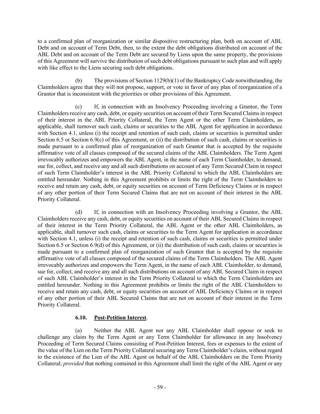 - 59 - to a confirmed plan of reorganization or similar dispositive restructuring plan, both on account of ABL Debt and on account of Term Debt, then, to the extent the debt obligations distributed on account of the ABL Debt and on account of the Term Debt are secured by Liens upon the same property, the provisions of this Agreement will survive the distribution of such debt obligations pursuant to such plan and will apply with like effect to the Liens securing such debt obligations. (b) The provisions of Section 1129(b)(1) of the Bankruptcy Code notwithstanding, the Claimholders agree that they will not propose, support, or vote in favor of any plan of reorganization of a Grantor that is inconsistent with the priorities or other provisions of this Agreement. (c) If, in connection with an Insolvency Proceeding involving a Grantor, the Term Claimholders receive any cash, debt, or equity securities on account of their Term Secured Claims in respect of their interest in the ABL Priority Collateral, the Term Agent or the other Term Claimholders, as applicable, shall turnover such cash, claims or securities to the ABL Agent for application in accordance with Section 4.1, unless (i) the receipt and retention of such cash, claims or securities is permitted under Section 6.5 or Section 6.9(c) of this Agreement, or (ii) the distribution of such cash, claims or securities is made pursuant to a confirmed plan of reorganization of such Grantor that is accepted by the requisite affirmative vote of all classes composed of the secured claims of the ABL Claimholders. The Term Agent irrevocably authorizes and empowers the ABL Agent, in the name of each Term Claimholder, to demand, sue for, collect, and receive any and all such distributions on account of any Term Secured Claim in respect of such Term Claimholder’s interest in the ABL Priority Collateral to which the ABL Claimholders are entitled hereunder. Nothing in this Agreement prohibits or limits the right of the Term Claimholders to receive and retain any cash, debt, or equity securities on account of Term Deficiency Claims or in respect of any other portion of their Term Secured Claims that are not on account of their interest in the ABL Priority Collateral. (d) If, in connection with an Insolvency Proceeding involving a Grantor, the ABL Claimholders receive any cash, debt, or equity securities on account of their ABL Secured Claims in respect of their interest in the Term Priority Collateral, the ABL Agent or the other ABL Claimholders, as applicable, shall turnover such cash, claims or securities to the Term Agent for application in accordance with Section 4.1, unless (i) the receipt and retention of such cash, claims or securities is permitted under Section 6.5 or Section 6.9(d) of this Agreement, or (ii) the distribution of such cash, claims or securities is made pursuant to a confirmed plan of reorganization of such Grantor that is accepted by the requisite affirmative vote of all classes composed of the secured claims of the Term Claimholders. The ABL Agent irrevocably authorizes and empowers the Term Agent, in the name of each ABL Claimholder, to demand, sue for, collect, and receive any and all such distributions on account of any ABL Secured Claim in respect of such ABL Claimholder’s interest in the Term Priority Collateral to which the Term Claimholders are entitled hereunder. Nothing in this Agreement prohibits or limits the right of the ABL Claimholders to receive and retain any cash, debt, or equity securities on account of ABL Deficiency Claims or in respect of any other portion of their ABL Secured Claims that are not on account of their interest in the Term Priority Collateral. 6.10. Post-Petition Interest. (a) Neither the ABL Agent nor any ABL Claimholder shall oppose or seek to challenge any claim by the Term Agent or any Term Claimholder for allowance in any Insolvency Proceeding of Term Secured Claims consisting of Post-Petition Interest, fees or expenses to the extent of the value of the Lien on the Term Priority Collateral securing any Term Claimholder’s claim, without regard to the existence of the Lien of the ABL Agent on behalf of the ABL Claimholders on the Term Priority Collateral; provided that nothing contained in this Agreement shall limit the right of the ABL Agent or any