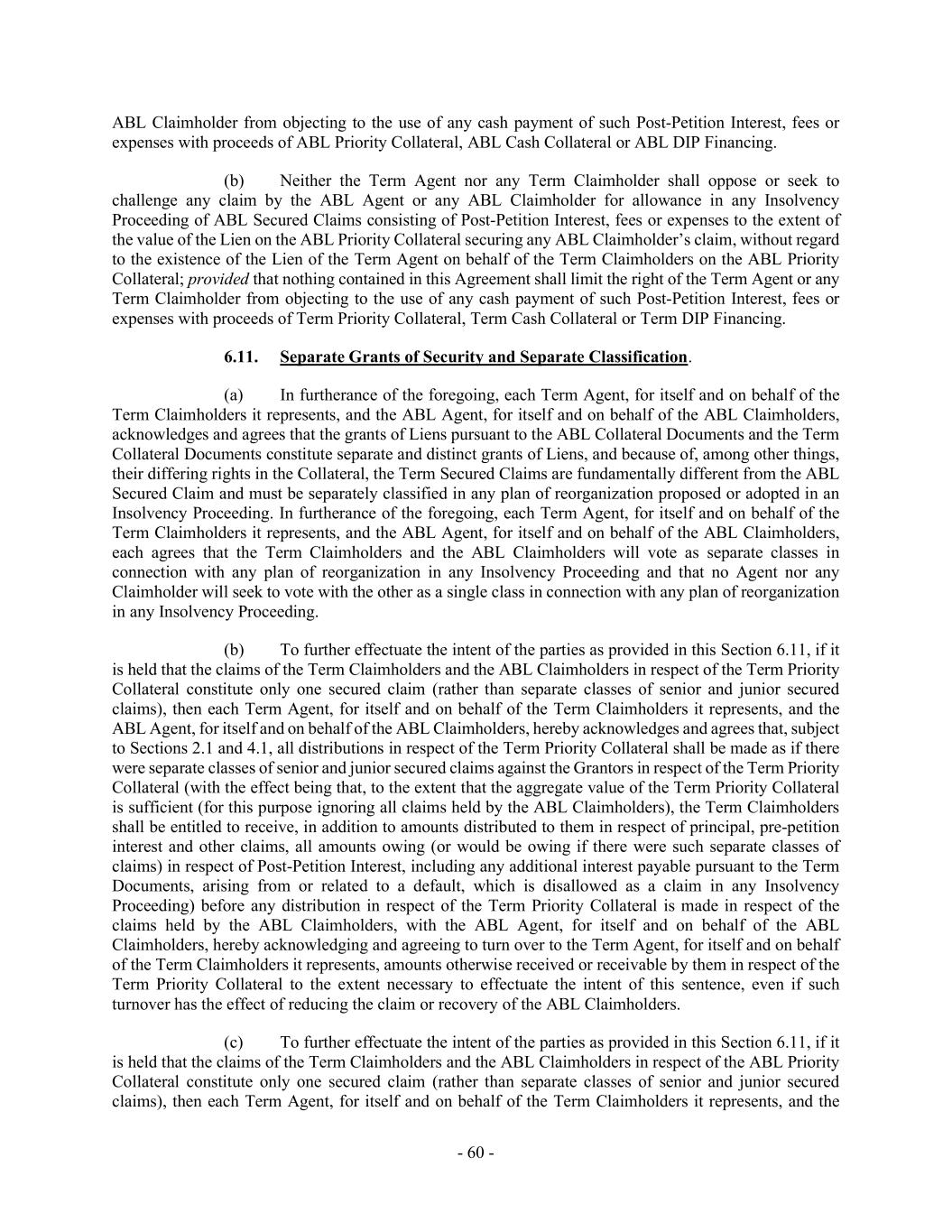 - 60 - ABL Claimholder from objecting to the use of any cash payment of such Post-Petition Interest, fees or expenses with proceeds of ABL Priority Collateral, ABL Cash Collateral or ABL DIP Financing. (b) Neither the Term Agent nor any Term Claimholder shall oppose or seek to challenge any claim by the ABL Agent or any ABL Claimholder for allowance in any Insolvency Proceeding of ABL Secured Claims consisting of Post-Petition Interest, fees or expenses to the extent of the value of the Lien on the ABL Priority Collateral securing any ABL Claimholder’s claim, without regard to the existence of the Lien of the Term Agent on behalf of the Term Claimholders on the ABL Priority Collateral; provided that nothing contained in this Agreement shall limit the right of the Term Agent or any Term Claimholder from objecting to the use of any cash payment of such Post-Petition Interest, fees or expenses with proceeds of Term Priority Collateral, Term Cash Collateral or Term DIP Financing. 6.11. Separate Grants of Security and Separate Classification. (a) In furtherance of the foregoing, each Term Agent, for itself and on behalf of the Term Claimholders it represents, and the ABL Agent, for itself and on behalf of the ABL Claimholders, acknowledges and agrees that the grants of Liens pursuant to the ABL Collateral Documents and the Term Collateral Documents constitute separate and distinct grants of Liens, and because of, among other things, their differing rights in the Collateral, the Term Secured Claims are fundamentally different from the ABL Secured Claim and must be separately classified in any plan of reorganization proposed or adopted in an Insolvency Proceeding. In furtherance of the foregoing, each Term Agent, for itself and on behalf of the Term Claimholders it represents, and the ABL Agent, for itself and on behalf of the ABL Claimholders, each agrees that the Term Claimholders and the ABL Claimholders will vote as separate classes in connection with any plan of reorganization in any Insolvency Proceeding and that no Agent nor any Claimholder will seek to vote with the other as a single class in connection with any plan of reorganization in any Insolvency Proceeding. (b) To further effectuate the intent of the parties as provided in this Section 6.11, if it is held that the claims of the Term Claimholders and the ABL Claimholders in respect of the Term Priority Collateral constitute only one secured claim (rather than separate classes of senior and junior secured claims), then each Term Agent, for itself and on behalf of the Term Claimholders it represents, and the ABL Agent, for itself and on behalf of the ABL Claimholders, hereby acknowledges and agrees that, subject to Sections 2.1 and 4.1, all distributions in respect of the Term Priority Collateral shall be made as if there were separate classes of senior and junior secured claims against the Grantors in respect of the Term Priority Collateral (with the effect being that, to the extent that the aggregate value of the Term Priority Collateral is sufficient (for this purpose ignoring all claims held by the ABL Claimholders), the Term Claimholders shall be entitled to receive, in addition to amounts distributed to them in respect of principal, pre-petition interest and other claims, all amounts owing (or would be owing if there were such separate classes of claims) in respect of Post-Petition Interest, including any additional interest payable pursuant to the Term Documents, arising from or related to a default, which is disallowed as a claim in any Insolvency Proceeding) before any distribution in respect of the Term Priority Collateral is made in respect of the claims held by the ABL Claimholders, with the ABL Agent, for itself and on behalf of the ABL Claimholders, hereby acknowledging and agreeing to turn over to the Term Agent, for itself and on behalf of the Term Claimholders it represents, amounts otherwise received or receivable by them in respect of the Term Priority Collateral to the extent necessary to effectuate the intent of this sentence, even if such turnover has the effect of reducing the claim or recovery of the ABL Claimholders. (c) To further effectuate the intent of the parties as provided in this Section 6.11, if it is held that the claims of the Term Claimholders and the ABL Claimholders in respect of the ABL Priority Collateral constitute only one secured claim (rather than separate classes of senior and junior secured claims), then each Term Agent, for itself and on behalf of the Term Claimholders it represents, and the