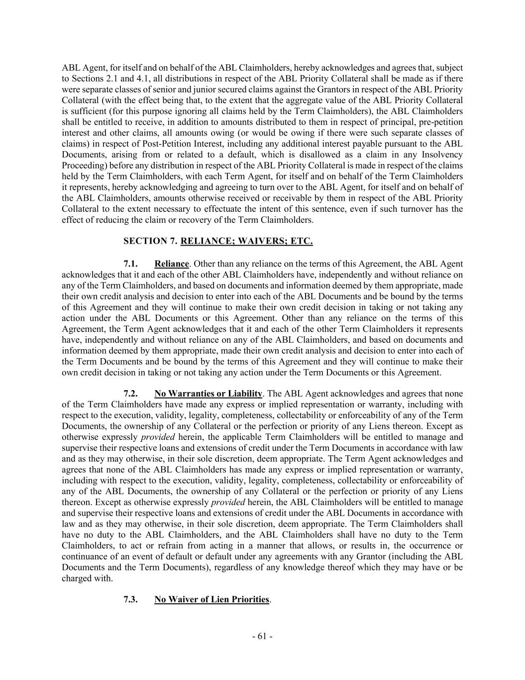 - 61 - ABL Agent, for itself and on behalf of the ABL Claimholders, hereby acknowledges and agrees that, subject to Sections 2.1 and 4.1, all distributions in respect of the ABL Priority Collateral shall be made as if there were separate classes of senior and junior secured claims against the Grantors in respect of the ABL Priority Collateral (with the effect being that, to the extent that the aggregate value of the ABL Priority Collateral is sufficient (for this purpose ignoring all claims held by the Term Claimholders), the ABL Claimholders shall be entitled to receive, in addition to amounts distributed to them in respect of principal, pre-petition interest and other claims, all amounts owing (or would be owing if there were such separate classes of claims) in respect of Post-Petition Interest, including any additional interest payable pursuant to the ABL Documents, arising from or related to a default, which is disallowed as a claim in any Insolvency Proceeding) before any distribution in respect of the ABL Priority Collateral is made in respect of the claims held by the Term Claimholders, with each Term Agent, for itself and on behalf of the Term Claimholders it represents, hereby acknowledging and agreeing to turn over to the ABL Agent, for itself and on behalf of the ABL Claimholders, amounts otherwise received or receivable by them in respect of the ABL Priority Collateral to the extent necessary to effectuate the intent of this sentence, even if such turnover has the effect of reducing the claim or recovery of the Term Claimholders. SECTION 7. RELIANCE; WAIVERS; ETC. 7.1. Reliance. Other than any reliance on the terms of this Agreement, the ABL Agent acknowledges that it and each of the other ABL Claimholders have, independently and without reliance on any of the Term Claimholders, and based on documents and information deemed by them appropriate, made their own credit analysis and decision to enter into each of the ABL Documents and be bound by the terms of this Agreement and they will continue to make their own credit decision in taking or not taking any action under the ABL Documents or this Agreement. Other than any reliance on the terms of this Agreement, the Term Agent acknowledges that it and each of the other Term Claimholders it represents have, independently and without reliance on any of the ABL Claimholders, and based on documents and information deemed by them appropriate, made their own credit analysis and decision to enter into each of the Term Documents and be bound by the terms of this Agreement and they will continue to make their own credit decision in taking or not taking any action under the Term Documents or this Agreement. 7.2. No Warranties or Liability. The ABL Agent acknowledges and agrees that none of the Term Claimholders have made any express or implied representation or warranty, including with respect to the execution, validity, legality, completeness, collectability or enforceability of any of the Term Documents, the ownership of any Collateral or the perfection or priority of any Liens thereon. Except as otherwise expressly provided herein, the applicable Term Claimholders will be entitled to manage and supervise their respective loans and extensions of credit under the Term Documents in accordance with law and as they may otherwise, in their sole discretion, deem appropriate. The Term Agent acknowledges and agrees that none of the ABL Claimholders has made any express or implied representation or warranty, including with respect to the execution, validity, legality, completeness, collectability or enforceability of any of the ABL Documents, the ownership of any Collateral or the perfection or priority of any Liens thereon. Except as otherwise expressly provided herein, the ABL Claimholders will be entitled to manage and supervise their respective loans and extensions of credit under the ABL Documents in accordance with law and as they may otherwise, in their sole discretion, deem appropriate. The Term Claimholders shall have no duty to the ABL Claimholders, and the ABL Claimholders shall have no duty to the Term Claimholders, to act or refrain from acting in a manner that allows, or results in, the occurrence or continuance of an event of default or default under any agreements with any Grantor (including the ABL Documents and the Term Documents), regardless of any knowledge thereof which they may have or be charged with. 7.3. No Waiver of Lien Priorities.