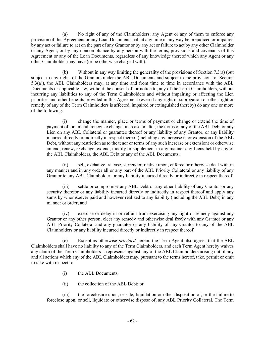 - 62 - (a) No right of any of the Claimholders, any Agent or any of them to enforce any provision of this Agreement or any Loan Document shall at any time in any way be prejudiced or impaired by any act or failure to act on the part of any Grantor or by any act or failure to act by any other Claimholder or any Agent, or by any noncompliance by any person with the terms, provisions and covenants of this Agreement or any of the Loan Documents, regardless of any knowledge thereof which any Agent or any other Claimholder may have (or be otherwise charged with). (b) Without in any way limiting the generality of the provisions of Section 7.3(a) (but subject to any rights of the Grantors under the ABL Documents and subject to the provisions of Section 5.3(a)), the ABL Claimholders may, at any time and from time to time in accordance with the ABL Documents or applicable law, without the consent of, or notice to, any of the Term Claimholders, without incurring any liabilities to any of the Term Claimholders and without impairing or affecting the Lien priorities and other benefits provided in this Agreement (even if any right of subrogation or other right or remedy of any of the Term Claimholders is affected, impaired or extinguished thereby) do any one or more of the following: (i) change the manner, place or terms of payment or change or extend the time of payment of, or amend, renew, exchange, increase or alter, the terms of any of the ABL Debt or any Lien on any ABL Collateral or guarantee thereof or any liability of any Grantor, or any liability incurred directly or indirectly in respect thereof (including any increase in or extension of the ABL Debt, without any restriction as to the tenor or terms of any such increase or extension) or otherwise amend, renew, exchange, extend, modify or supplement in any manner any Liens held by any of the ABL Claimholders, the ABL Debt or any of the ABL Documents; (ii) sell, exchange, release, surrender, realize upon, enforce or otherwise deal with in any manner and in any order all or any part of the ABL Priority Collateral or any liability of any Grantor to any ABL Claimholder, or any liability incurred directly or indirectly in respect thereof; (iii) settle or compromise any ABL Debt or any other liability of any Grantor or any security therefor or any liability incurred directly or indirectly in respect thereof and apply any sums by whomsoever paid and however realized to any liability (including the ABL Debt) in any manner or order; and (iv) exercise or delay in or refrain from exercising any right or remedy against any Grantor or any other person, elect any remedy and otherwise deal freely with any Grantor or any ABL Priority Collateral and any guarantor or any liability of any Grantor to any of the ABL Claimholders or any liability incurred directly or indirectly in respect thereof. (c) Except as otherwise provided herein, the Term Agent also agrees that the ABL Claimholders shall have no liability to any of the Term Claimholders, and each Term Agent hereby waives any claim of the Term Claimholders it represents against any of the ABL Claimholders arising out of any and all actions which any of the ABL Claimholders may, pursuant to the terms hereof, take, permit or omit to take with respect to: (i) the ABL Documents; (ii) the collection of the ABL Debt; or (iii) the foreclosure upon, or sale, liquidation or other disposition of, or the failure to foreclose upon, or sell, liquidate or otherwise dispose of, any ABL Priority Collateral. The Term