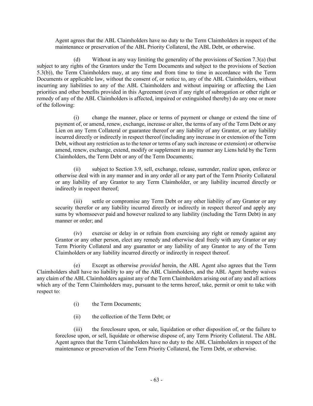 - 63 - Agent agrees that the ABL Claimholders have no duty to the Term Claimholders in respect of the maintenance or preservation of the ABL Priority Collateral, the ABL Debt, or otherwise. (d) Without in any way limiting the generality of the provisions of Section 7.3(a) (but subject to any rights of the Grantors under the Term Documents and subject to the provisions of Section 5.3(b)), the Term Claimholders may, at any time and from time to time in accordance with the Term Documents or applicable law, without the consent of, or notice to, any of the ABL Claimholders, without incurring any liabilities to any of the ABL Claimholders and without impairing or affecting the Lien priorities and other benefits provided in this Agreement (even if any right of subrogation or other right or remedy of any of the ABL Claimholders is affected, impaired or extinguished thereby) do any one or more of the following: (i) change the manner, place or terms of payment or change or extend the time of payment of, or amend, renew, exchange, increase or alter, the terms of any of the Term Debt or any Lien on any Term Collateral or guarantee thereof or any liability of any Grantor, or any liability incurred directly or indirectly in respect thereof (including any increase in or extension of the Term Debt, without any restriction as to the tenor or terms of any such increase or extension) or otherwise amend, renew, exchange, extend, modify or supplement in any manner any Liens held by the Term Claimholders, the Term Debt or any of the Term Documents; (ii) subject to Section 3.9, sell, exchange, release, surrender, realize upon, enforce or otherwise deal with in any manner and in any order all or any part of the Term Priority Collateral or any liability of any Grantor to any Term Claimholder, or any liability incurred directly or indirectly in respect thereof; (iii) settle or compromise any Term Debt or any other liability of any Grantor or any security therefor or any liability incurred directly or indirectly in respect thereof and apply any sums by whomsoever paid and however realized to any liability (including the Term Debt) in any manner or order; and (iv) exercise or delay in or refrain from exercising any right or remedy against any Grantor or any other person, elect any remedy and otherwise deal freely with any Grantor or any Term Priority Collateral and any guarantor or any liability of any Grantor to any of the Term Claimholders or any liability incurred directly or indirectly in respect thereof. (e) Except as otherwise provided herein, the ABL Agent also agrees that the Term Claimholders shall have no liability to any of the ABL Claimholders, and the ABL Agent hereby waives any claim of the ABL Claimholders against any of the Term Claimholders arising out of any and all actions which any of the Term Claimholders may, pursuant to the terms hereof, take, permit or omit to take with respect to: (i) the Term Documents; (ii) the collection of the Term Debt; or (iii) the foreclosure upon, or sale, liquidation or other disposition of, or the failure to foreclose upon, or sell, liquidate or otherwise dispose of, any Term Priority Collateral. The ABL Agent agrees that the Term Claimholders have no duty to the ABL Claimholders in respect of the maintenance or preservation of the Term Priority Collateral, the Term Debt, or otherwise.