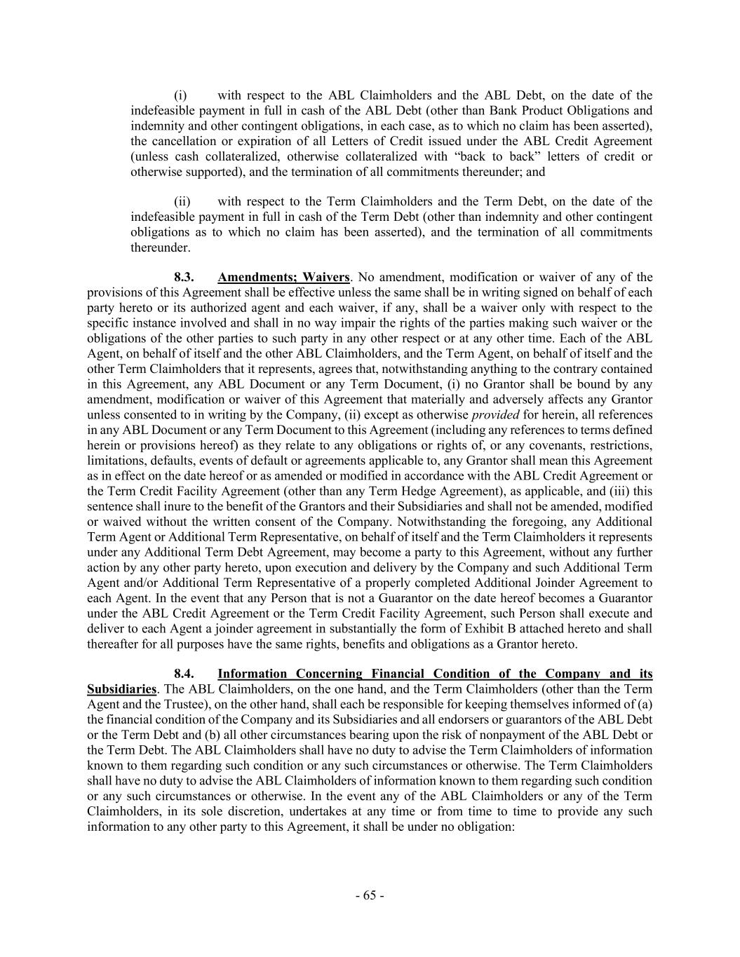 - 65 - (i) with respect to the ABL Claimholders and the ABL Debt, on the date of the indefeasible payment in full in cash of the ABL Debt (other than Bank Product Obligations and indemnity and other contingent obligations, in each case, as to which no claim has been asserted), the cancellation or expiration of all Letters of Credit issued under the ABL Credit Agreement (unless cash collateralized, otherwise collateralized with “back to back” letters of credit or otherwise supported), and the termination of all commitments thereunder; and (ii) with respect to the Term Claimholders and the Term Debt, on the date of the indefeasible payment in full in cash of the Term Debt (other than indemnity and other contingent obligations as to which no claim has been asserted), and the termination of all commitments thereunder. 8.3. Amendments; Waivers. No amendment, modification or waiver of any of the provisions of this Agreement shall be effective unless the same shall be in writing signed on behalf of each party hereto or its authorized agent and each waiver, if any, shall be a waiver only with respect to the specific instance involved and shall in no way impair the rights of the parties making such waiver or the obligations of the other parties to such party in any other respect or at any other time. Each of the ABL Agent, on behalf of itself and the other ABL Claimholders, and the Term Agent, on behalf of itself and the other Term Claimholders that it represents, agrees that, notwithstanding anything to the contrary contained in this Agreement, any ABL Document or any Term Document, (i) no Grantor shall be bound by any amendment, modification or waiver of this Agreement that materially and adversely affects any Grantor unless consented to in writing by the Company, (ii) except as otherwise provided for herein, all references in any ABL Document or any Term Document to this Agreement (including any references to terms defined herein or provisions hereof) as they relate to any obligations or rights of, or any covenants, restrictions, limitations, defaults, events of default or agreements applicable to, any Grantor shall mean this Agreement as in effect on the date hereof or as amended or modified in accordance with the ABL Credit Agreement or the Term Credit Facility Agreement (other than any Term Hedge Agreement), as applicable, and (iii) this sentence shall inure to the benefit of the Grantors and their Subsidiaries and shall not be amended, modified or waived without the written consent of the Company. Notwithstanding the foregoing, any Additional Term Agent or Additional Term Representative, on behalf of itself and the Term Claimholders it represents under any Additional Term Debt Agreement, may become a party to this Agreement, without any further action by any other party hereto, upon execution and delivery by the Company and such Additional Term Agent and/or Additional Term Representative of a properly completed Additional Joinder Agreement to each Agent. In the event that any Person that is not a Guarantor on the date hereof becomes a Guarantor under the ABL Credit Agreement or the Term Credit Facility Agreement, such Person shall execute and deliver to each Agent a joinder agreement in substantially the form of Exhibit B attached hereto and shall thereafter for all purposes have the same rights, benefits and obligations as a Grantor hereto. 8.4. Information Concerning Financial Condition of the Company and its Subsidiaries. The ABL Claimholders, on the one hand, and the Term Claimholders (other than the Term Agent and the Trustee), on the other hand, shall each be responsible for keeping themselves informed of (a) the financial condition of the Company and its Subsidiaries and all endorsers or guarantors of the ABL Debt or the Term Debt and (b) all other circumstances bearing upon the risk of nonpayment of the ABL Debt or the Term Debt. The ABL Claimholders shall have no duty to advise the Term Claimholders of information known to them regarding such condition or any such circumstances or otherwise. The Term Claimholders shall have no duty to advise the ABL Claimholders of information known to them regarding such condition or any such circumstances or otherwise. In the event any of the ABL Claimholders or any of the Term Claimholders, in its sole discretion, undertakes at any time or from time to time to provide any such information to any other party to this Agreement, it shall be under no obligation: