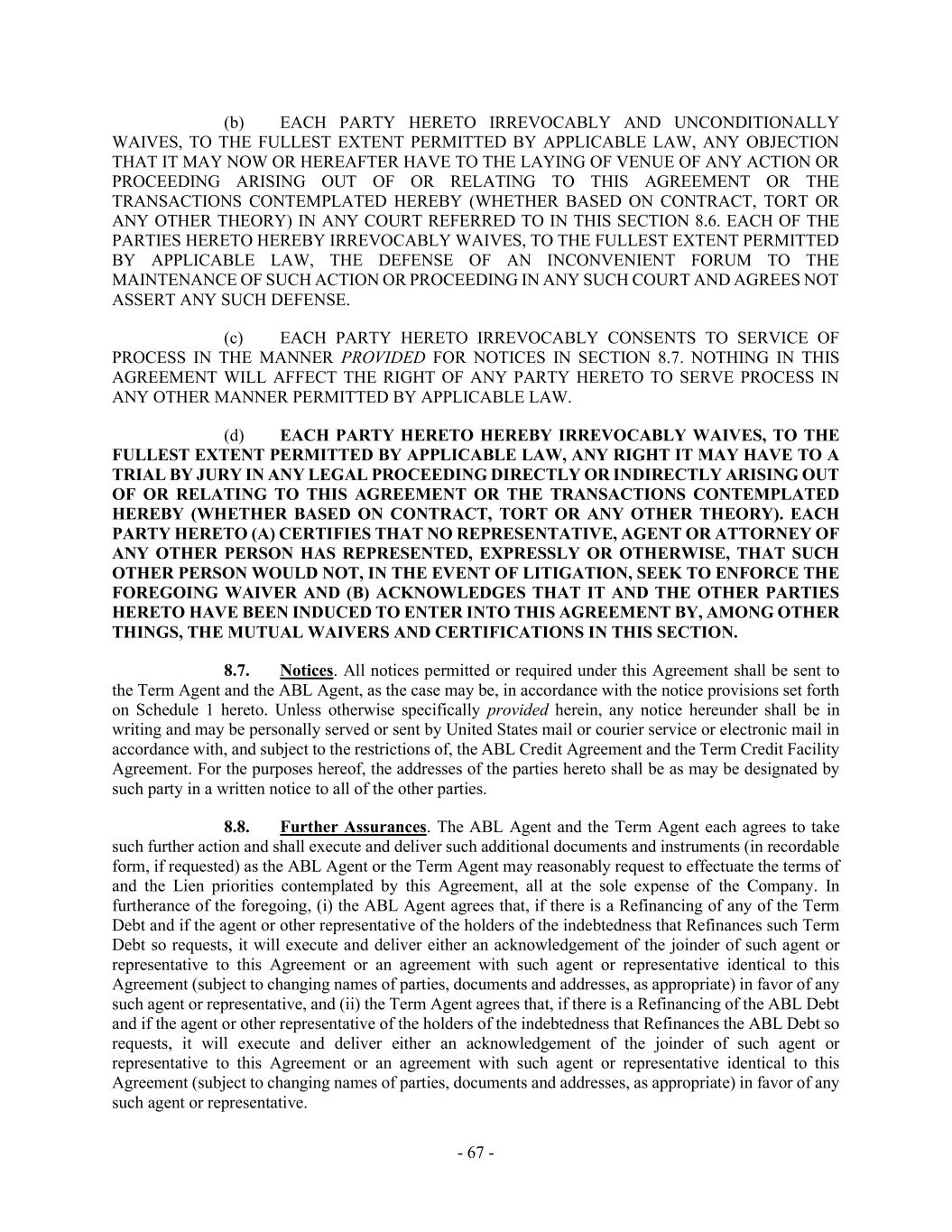 - 67 - (b) EACH PARTY HERETO IRREVOCABLY AND UNCONDITIONALLY WAIVES, TO THE FULLEST EXTENT PERMITTED BY APPLICABLE LAW, ANY OBJECTION THAT IT MAY NOW OR HEREAFTER HAVE TO THE LAYING OF VENUE OF ANY ACTION OR PROCEEDING ARISING OUT OF OR RELATING TO THIS AGREEMENT OR THE TRANSACTIONS CONTEMPLATED HEREBY (WHETHER BASED ON CONTRACT, TORT OR ANY OTHER THEORY) IN ANY COURT REFERRED TO IN THIS SECTION 8.6. EACH OF THE PARTIES HERETO HEREBY IRREVOCABLY WAIVES, TO THE FULLEST EXTENT PERMITTED BY APPLICABLE LAW, THE DEFENSE OF AN INCONVENIENT FORUM TO THE MAINTENANCE OF SUCH ACTION OR PROCEEDING IN ANY SUCH COURT AND AGREES NOT ASSERT ANY SUCH DEFENSE. (c) EACH PARTY HERETO IRREVOCABLY CONSENTS TO SERVICE OF PROCESS IN THE MANNER PROVIDED FOR NOTICES IN SECTION 8.7. NOTHING IN THIS AGREEMENT WILL AFFECT THE RIGHT OF ANY PARTY HERETO TO SERVE PROCESS IN ANY OTHER MANNER PERMITTED BY APPLICABLE LAW. (d) EACH PARTY HERETO HEREBY IRREVOCABLY WAIVES, TO THE FULLEST EXTENT PERMITTED BY APPLICABLE LAW, ANY RIGHT IT MAY HAVE TO A TRIAL BY JURY IN ANY LEGAL PROCEEDING DIRECTLY OR INDIRECTLY ARISING OUT OF OR RELATING TO THIS AGREEMENT OR THE TRANSACTIONS CONTEMPLATED HEREBY (WHETHER BASED ON CONTRACT, TORT OR ANY OTHER THEORY). EACH PARTY HERETO (A) CERTIFIES THAT NO REPRESENTATIVE, AGENT OR ATTORNEY OF ANY OTHER PERSON HAS REPRESENTED, EXPRESSLY OR OTHERWISE, THAT SUCH OTHER PERSON WOULD NOT, IN THE EVENT OF LITIGATION, SEEK TO ENFORCE THE FOREGOING WAIVER AND (B) ACKNOWLEDGES THAT IT AND THE OTHER PARTIES HERETO HAVE BEEN INDUCED TO ENTER INTO THIS AGREEMENT BY, AMONG OTHER THINGS, THE MUTUAL WAIVERS AND CERTIFICATIONS IN THIS SECTION. 8.7. Notices. All notices permitted or required under this Agreement shall be sent to the Term Agent and the ABL Agent, as the case may be, in accordance with the notice provisions set forth on Schedule 1 hereto. Unless otherwise specifically provided herein, any notice hereunder shall be in writing and may be personally served or sent by United States mail or courier service or electronic mail in accordance with, and subject to the restrictions of, the ABL Credit Agreement and the Term Credit Facility Agreement. For the purposes hereof, the addresses of the parties hereto shall be as may be designated by such party in a written notice to all of the other parties. 8.8. Further Assurances. The ABL Agent and the Term Agent each agrees to take such further action and shall execute and deliver such additional documents and instruments (in recordable form, if requested) as the ABL Agent or the Term Agent may reasonably request to effectuate the terms of and the Lien priorities contemplated by this Agreement, all at the sole expense of the Company. In furtherance of the foregoing, (i) the ABL Agent agrees that, if there is a Refinancing of any of the Term Debt and if the agent or other representative of the holders of the indebtedness that Refinances such Term Debt so requests, it will execute and deliver either an acknowledgement of the joinder of such agent or representative to this Agreement or an agreement with such agent or representative identical to this Agreement (subject to changing names of parties, documents and addresses, as appropriate) in favor of any such agent or representative, and (ii) the Term Agent agrees that, if there is a Refinancing of the ABL Debt and if the agent or other representative of the holders of the indebtedness that Refinances the ABL Debt so requests, it will execute and deliver either an acknowledgement of the joinder of such agent or representative to this Agreement or an agreement with such agent or representative identical to this Agreement (subject to changing names of parties, documents and addresses, as appropriate) in favor of any such agent or representative.